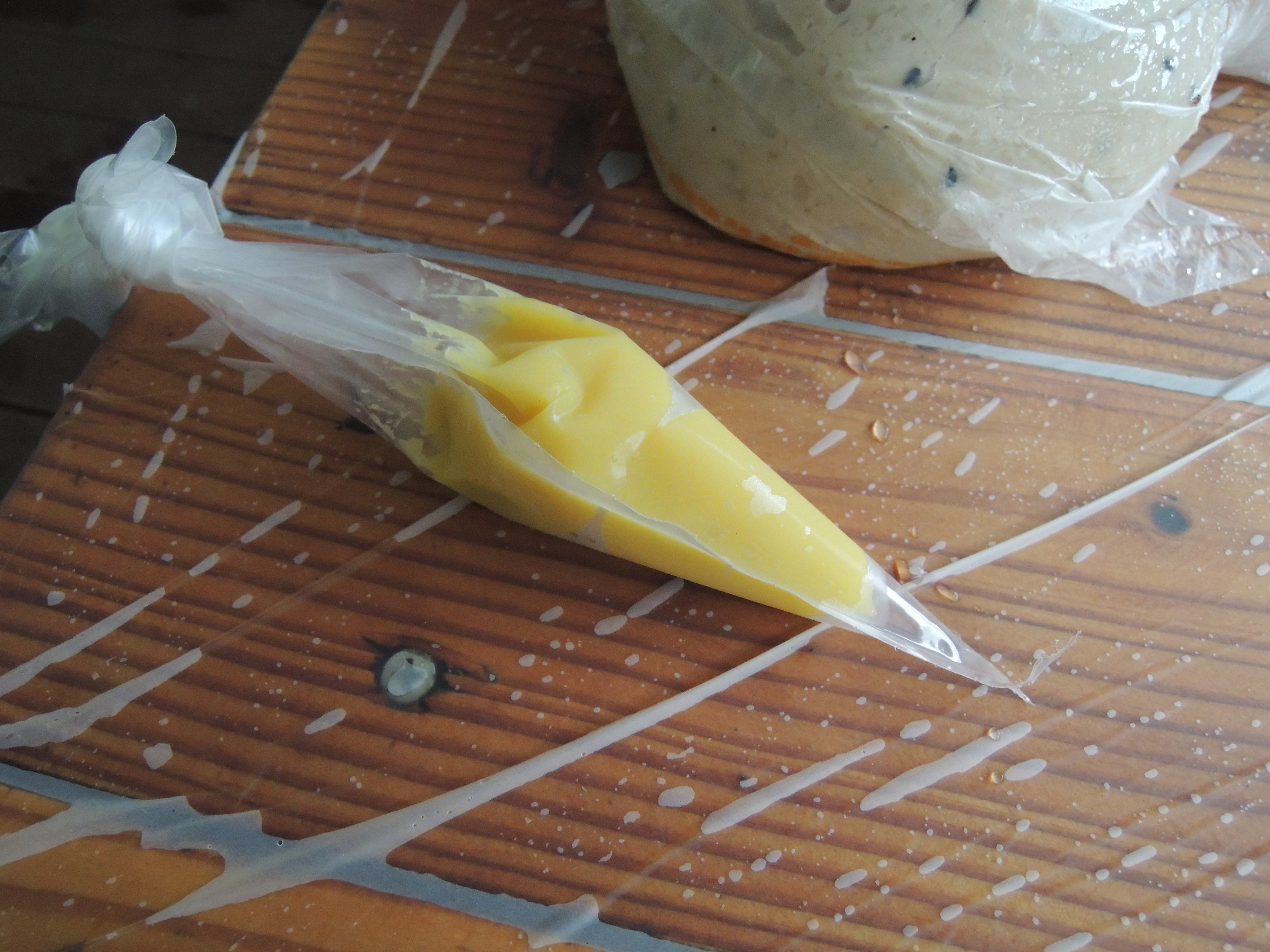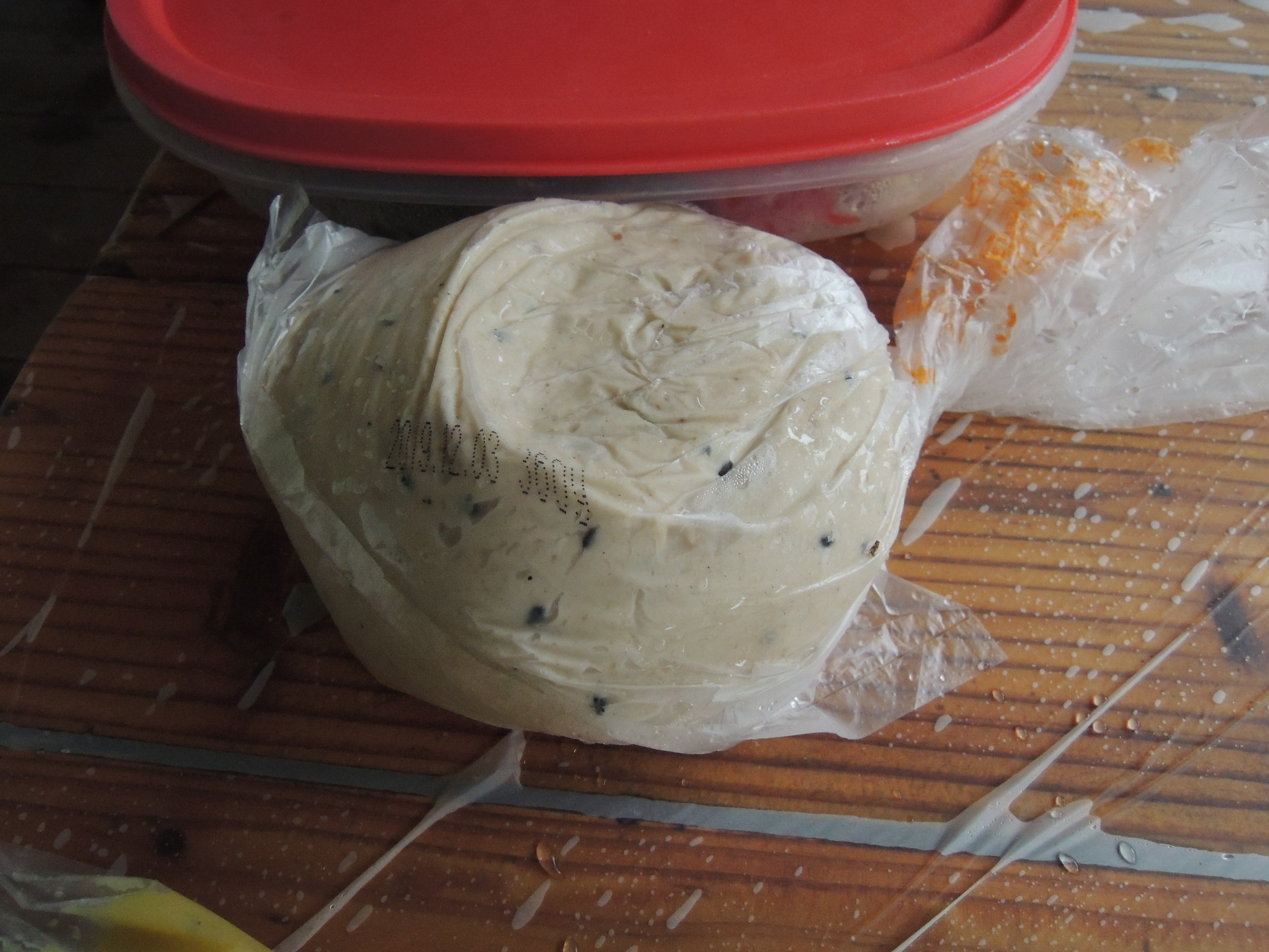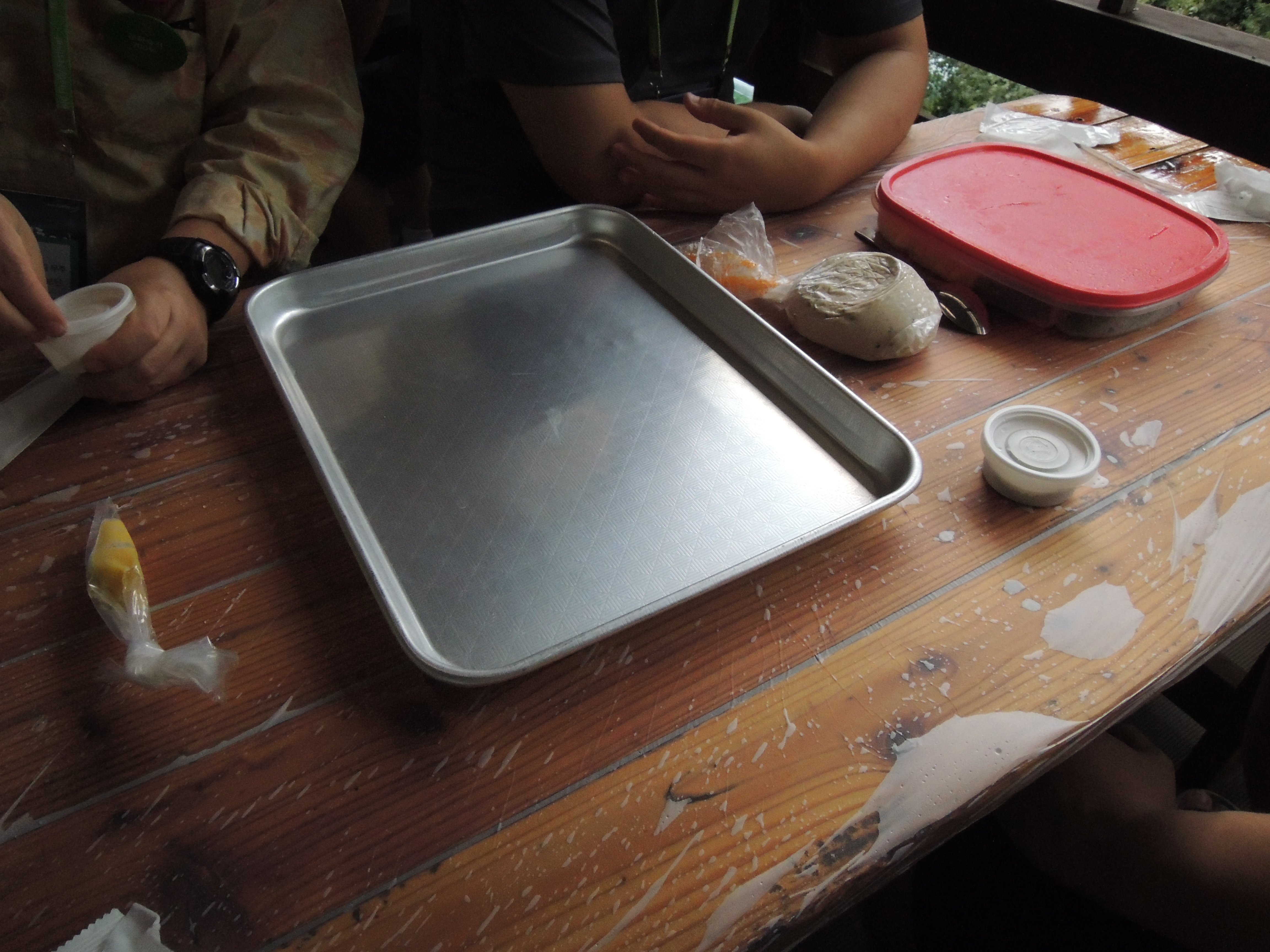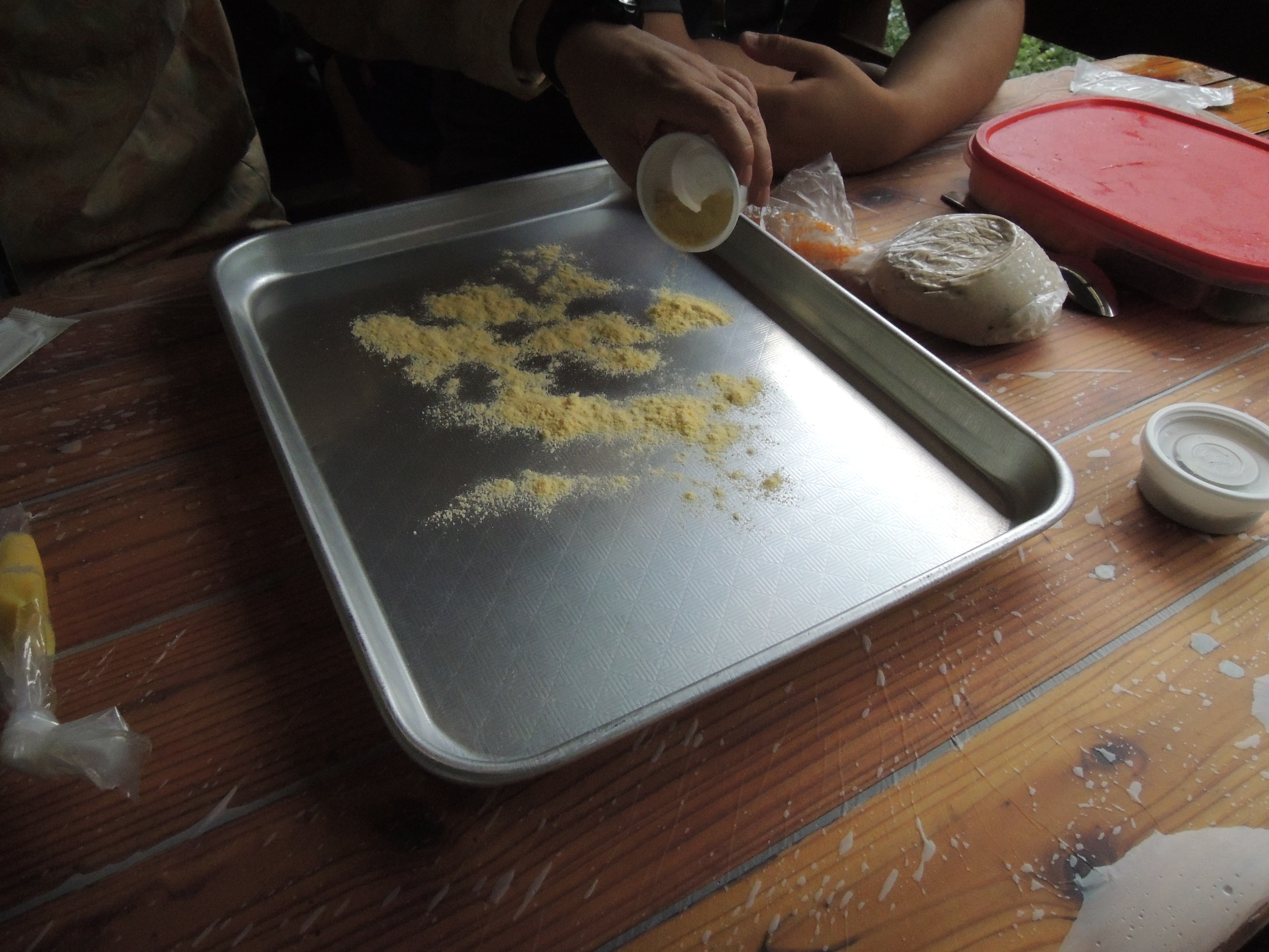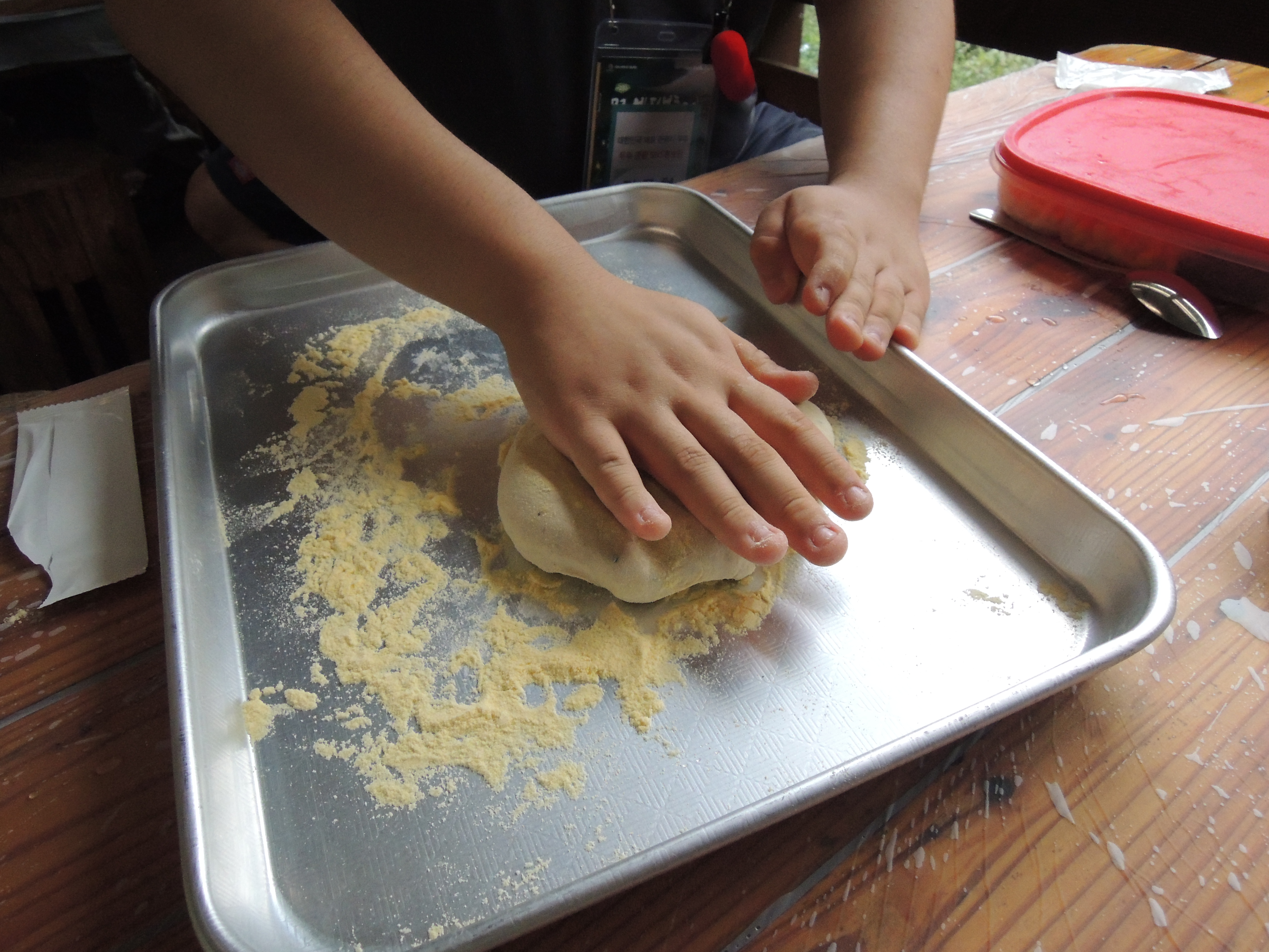 일단 네모난 쟁반에 밀가루? 옥수수가루?를 솔솔 뿌립니다.