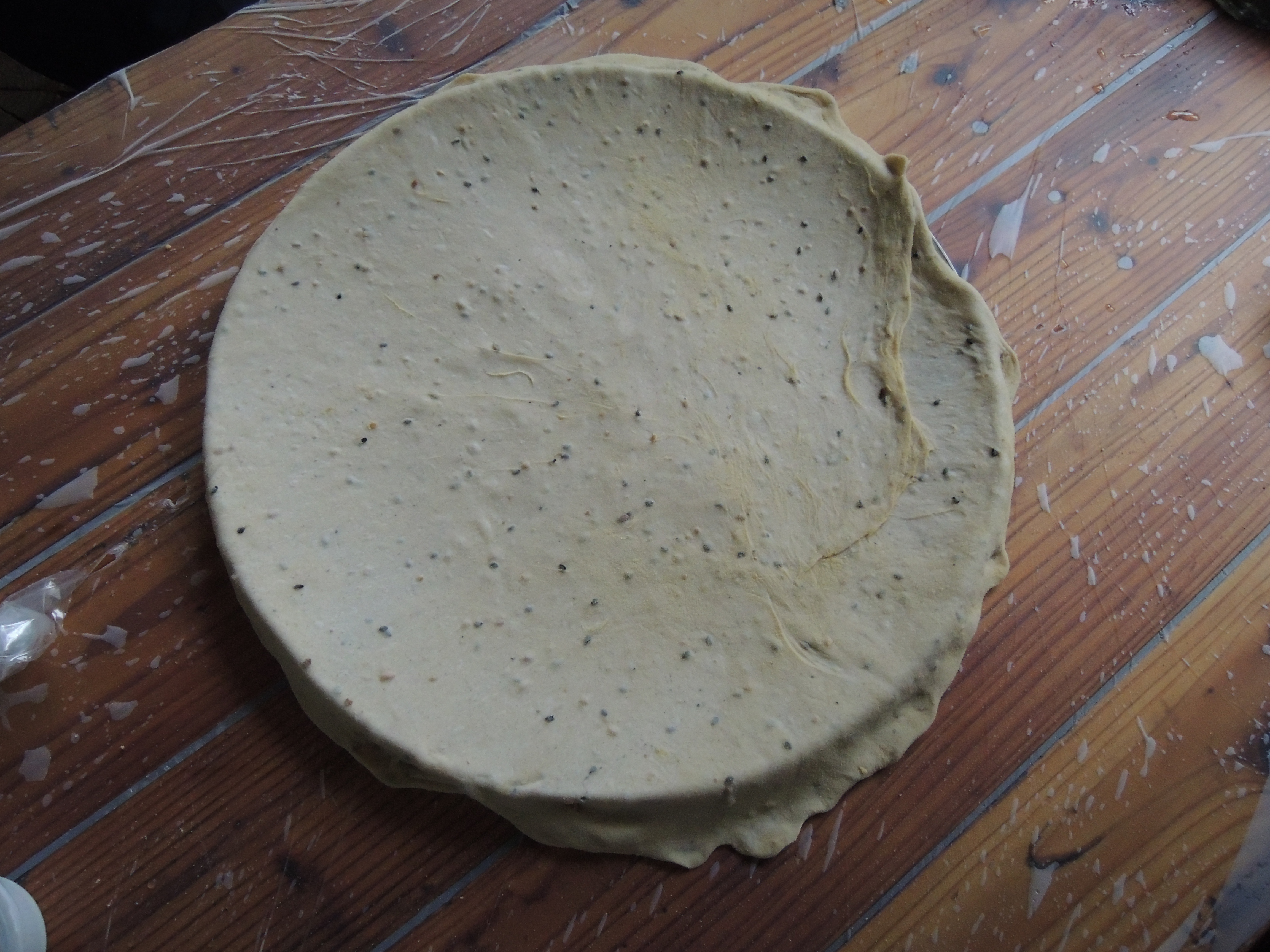 그 위에 반죽으로 놓고 잘 굴려 줍니다. 가루가 잘 묻으면 얇게 폅니다. 나중에 둥근 쟁반을 주시는데 위 사진처럼 쟁반을 살짝 넘게 넓게 펴요. 반죽과 숙성이 잘 되어 있어서 쭉쭉 늘어납니다.