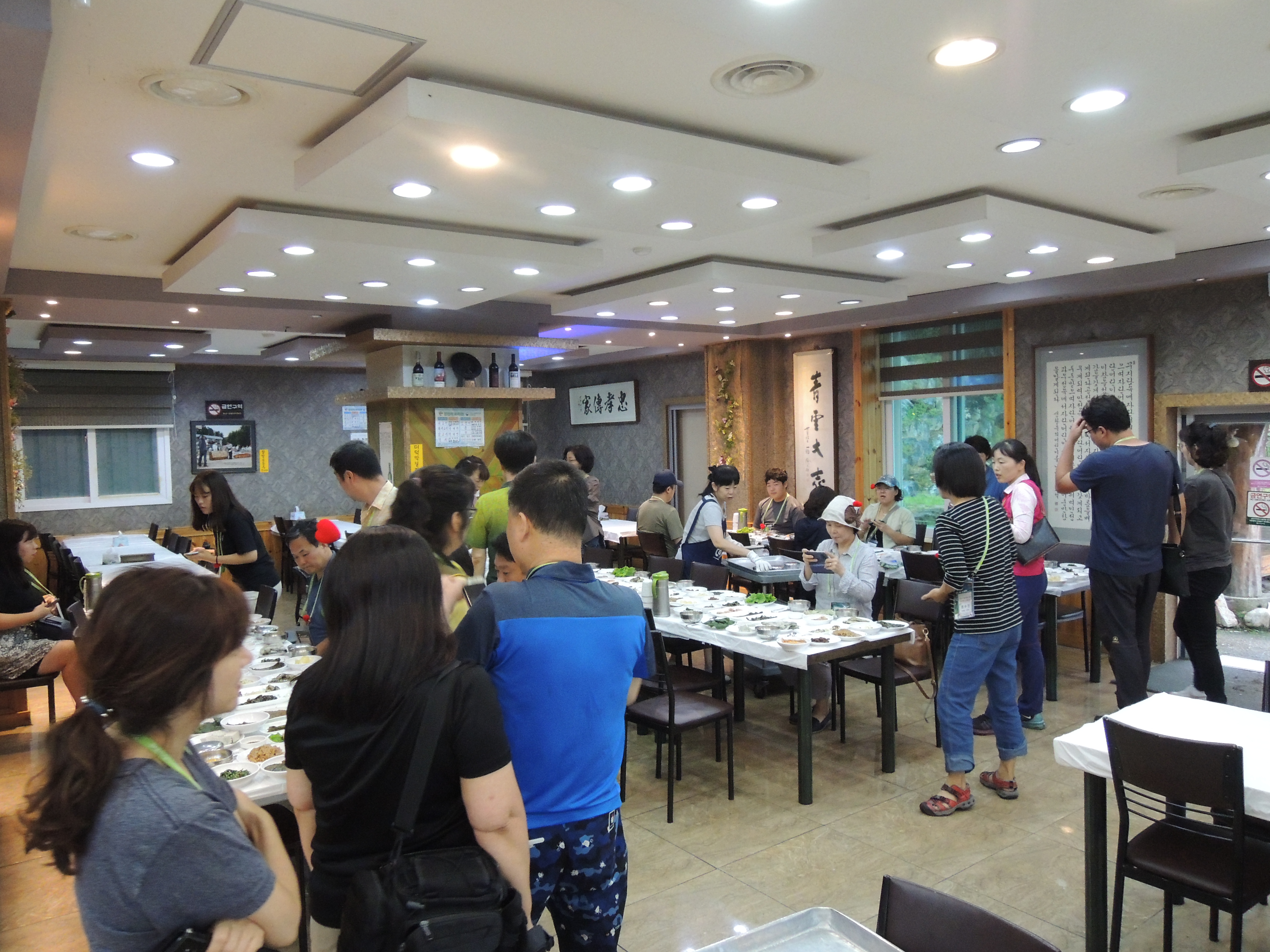 홀은 넓어요. 건물 하나를 다 쓰는거 같아요. 미리 예약하고 가서 테이블세팅이 되어 있네요. 반찬이 정말 많아요 몇가지인지 세다가 지칠거 같아요. 사진에 다 담기지 않을정도로 많네요.