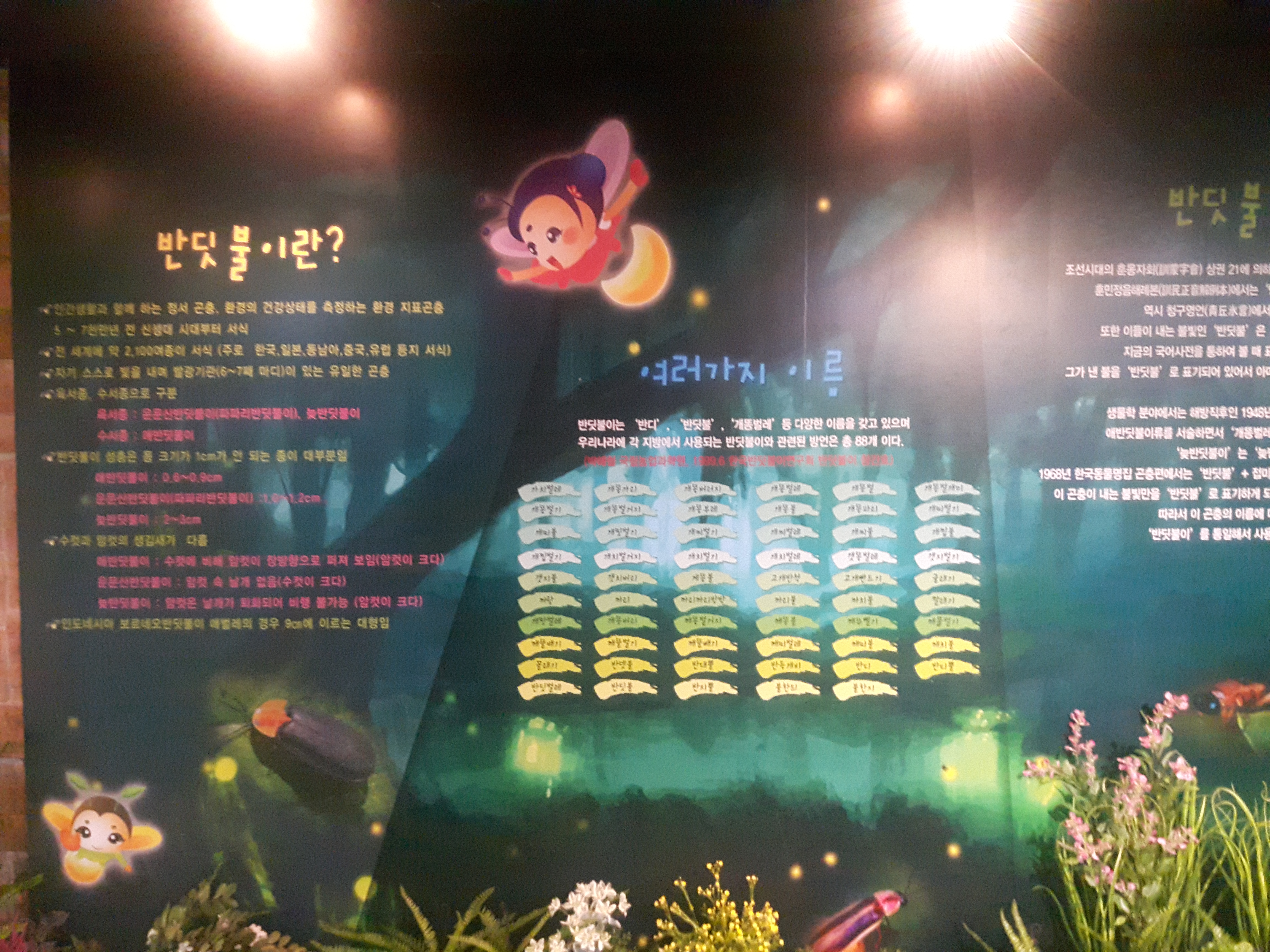반딧불이관은 반딧불이의 다양한 이름, 반딧불이가 불을 내는 원리 등 반딧불이에 대한 전반적인 정보가 전시되어 있어요. 안쪽에는 3D 체험관이 있는데, 3D안경을 끼고 들어가면 위 사진에 보이는 어두운부분에 반딧불이 날아다니는게 3D로 보여서 참 신기해요.