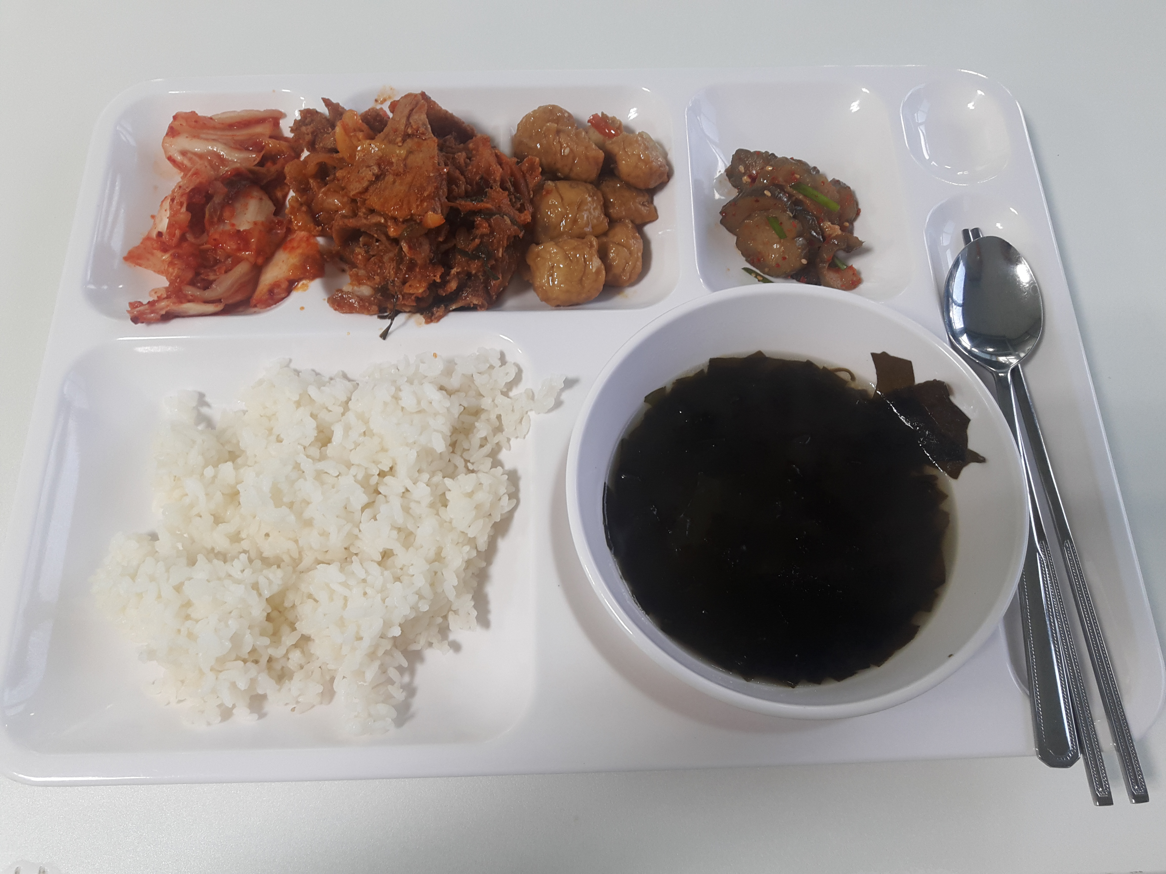 월요일에 먹었고, 메뉴는 밥, 미역국, 제육볶음, 불어묵조림, 오이지무침, 배추김치랍니다.