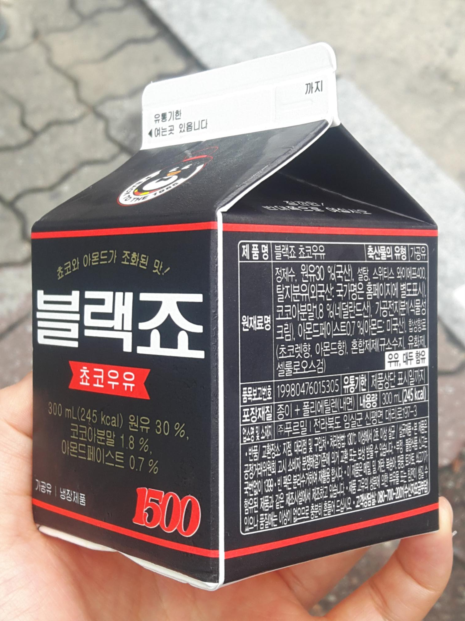 제품명은 블랙죠 쵸코우유고요. 푸르밀 전북 임실공장에서 만들어요. 원재료는 정제수, 원유 30%(국산), 설탕, 스위티스 와이에프400, 탈지분유(외국산: 국가명은 홈페이지에 별도 표시), 코코아분말 1.8%(네덜란드산), 가공전지분1(식물성크림), 아몬드페이스트 0.7%(아몬드: 미국산), 합성향료(초코렛향, 아몬드향), 혼합제제(규소수지, 유화제, 셀룰로오스검) 입니다.