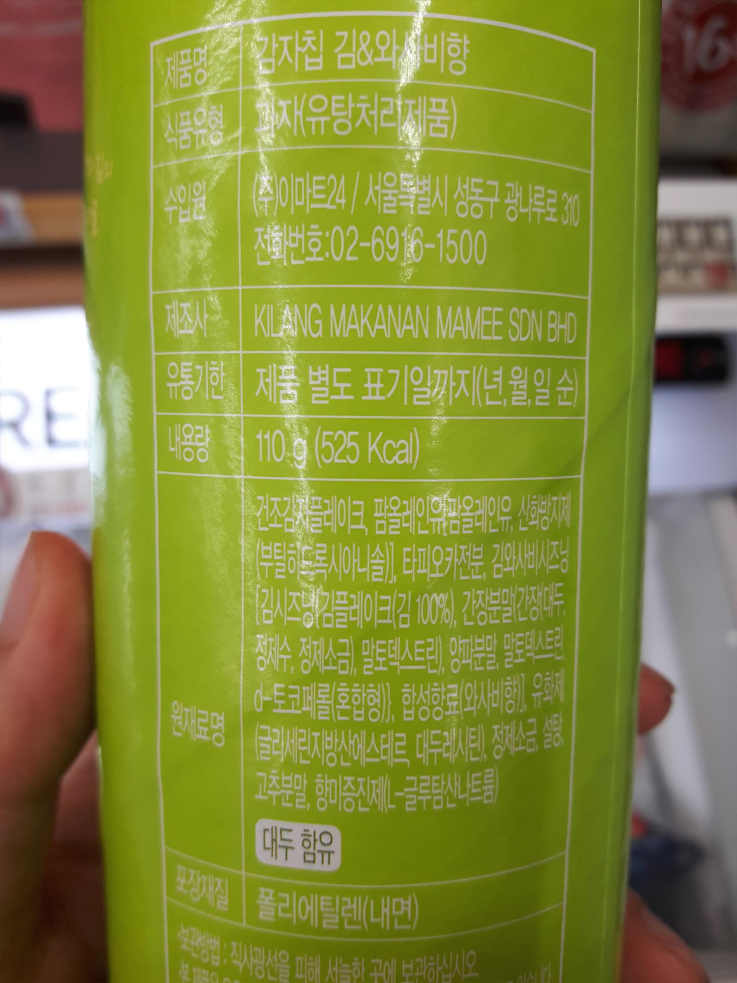 감자칩 김&와사비향은 사워크림과 같은 제조사인 KILANG MAKANAN MAMEE SDN BHD에서 제조합니다. 원재료는 건조감자플레이크, 팜올레인유[팜올레인유, 상화방지제(부틸히드록시아니솔)], 타피오카전분, 김와사비시즈닝[김시즈닝(김플레이크(김 100%), 간장분말{간장(대두, 정제수, 정제소금), 말토덱스트린), 양파분말, 말토덱스트린, D-토코페롤(혼합형)}, 합성향료(와사비향)], 유화제(글리세린지방산에스테르, 대두레시틴), 정제소금, 설탕, 고추분말, 향미증진제(L-글루탐산나트륨) 입니다.