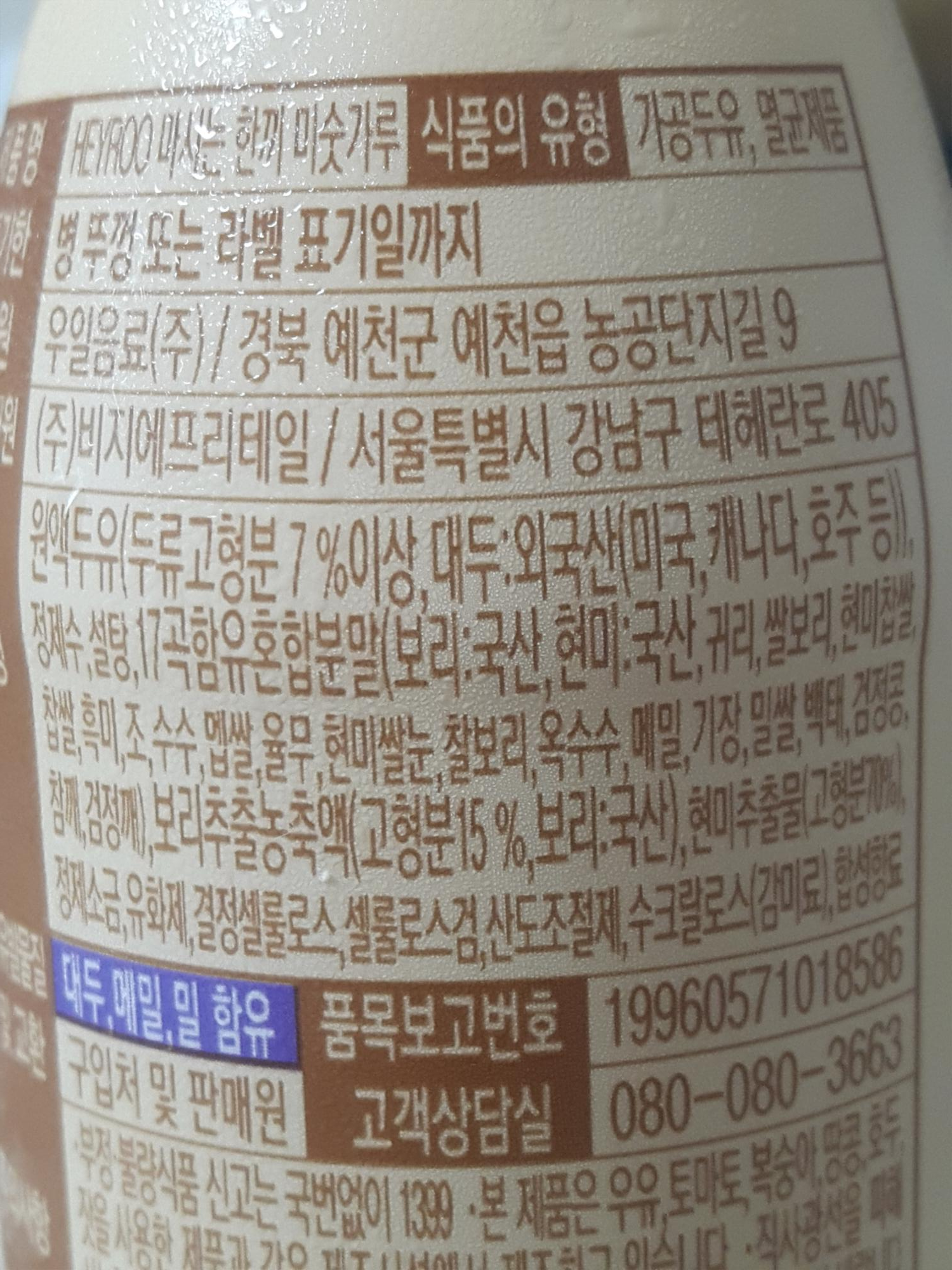 경북 예천에 우일음료에서 제조하고, 유통 및 판매를 씨유 모회사인 비지에프리테일에서 합니다. 원재료는 원액두유(두류고형분 7% 이상, 대두:외국산(미국,캐나다,호주 등)), 정제수, 설탕, 17곡함유혼합분말(보리:국산, 현미:국산, 귀리, 쌀보리, 현미찹쌀, 찹쌀, 흑미, 조, 수수, 멥쌀, 율무, 현미쌀눈, 찰보리, 옥수수, 메밀, 기장, 밀쌀, 백태, 검정콩, 참깨, 검정깨), 보리추출농축액(고형분 15%, 보리:국산), 현미추출물(고형분 70%), 정제소금, 유화제, 결정셀룰로스, 셀룰로스검, 산도조절제, 수크랄로스(감미료), 합성향료 입니다.