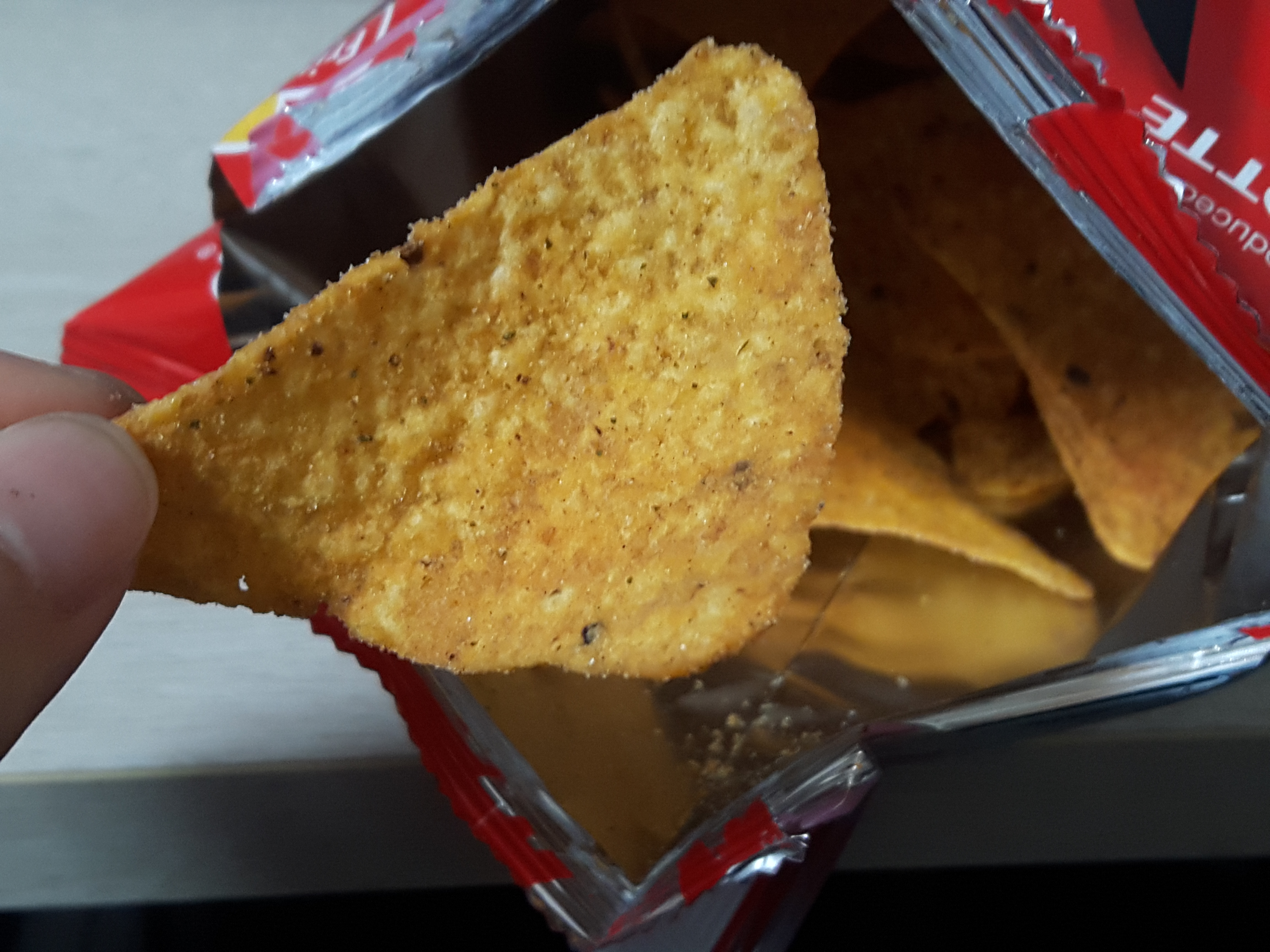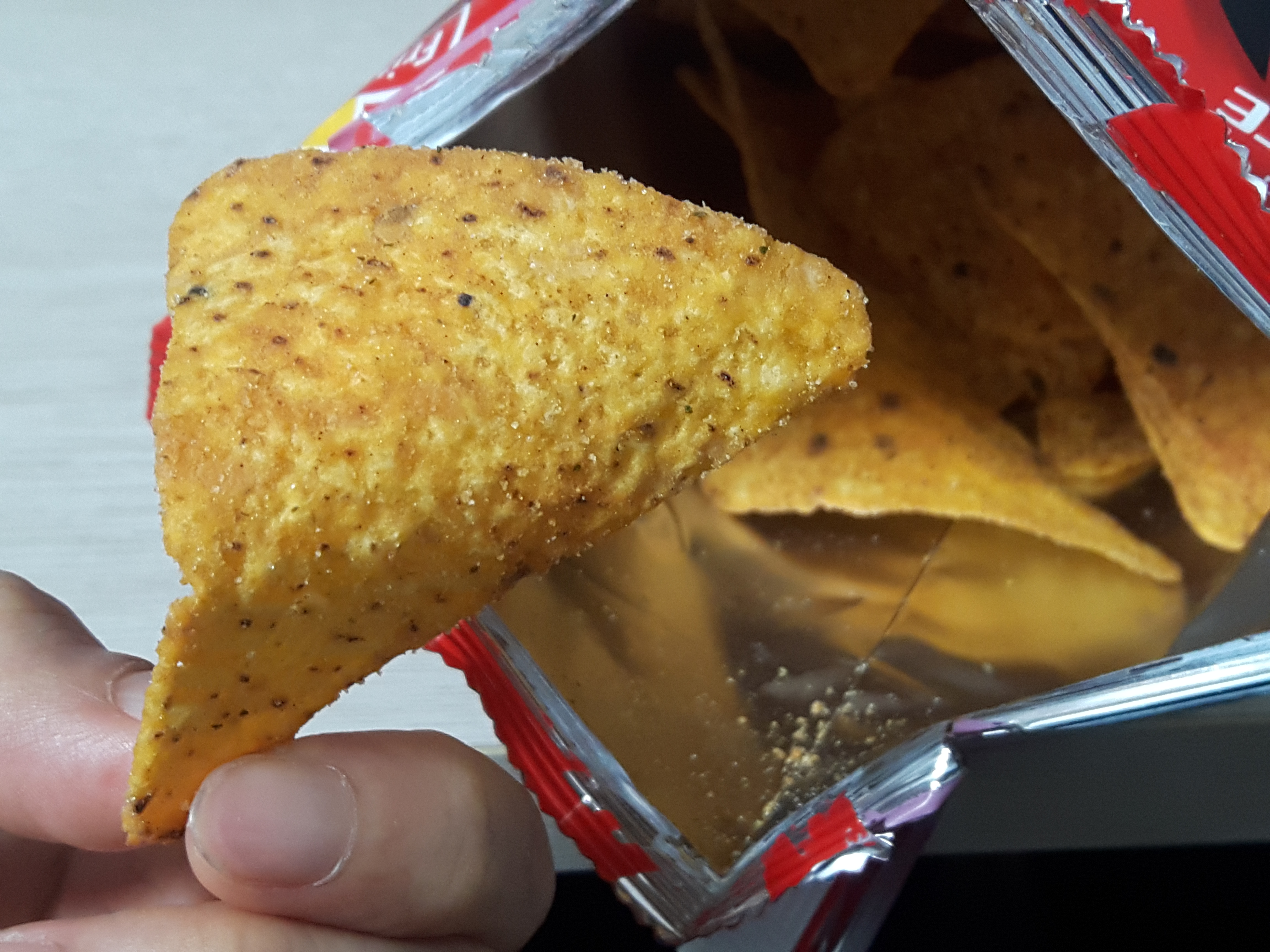 맛은 나쵸에 마라분말 묻힌 맛입니다. 막 입안이 얼얼할 정도는 아니고 적당히 매워서 참 좋네요. 얼마전에 먹은 오징어땅콩 마라맛만큼은 아니지만 도리토스 마라맛도 맛이 꽤 괜찮습니다. 나쵸랑 마라분말소스랑 잘 어울리네요. 매콤하게 고소하게 잘 먹었습니다.
