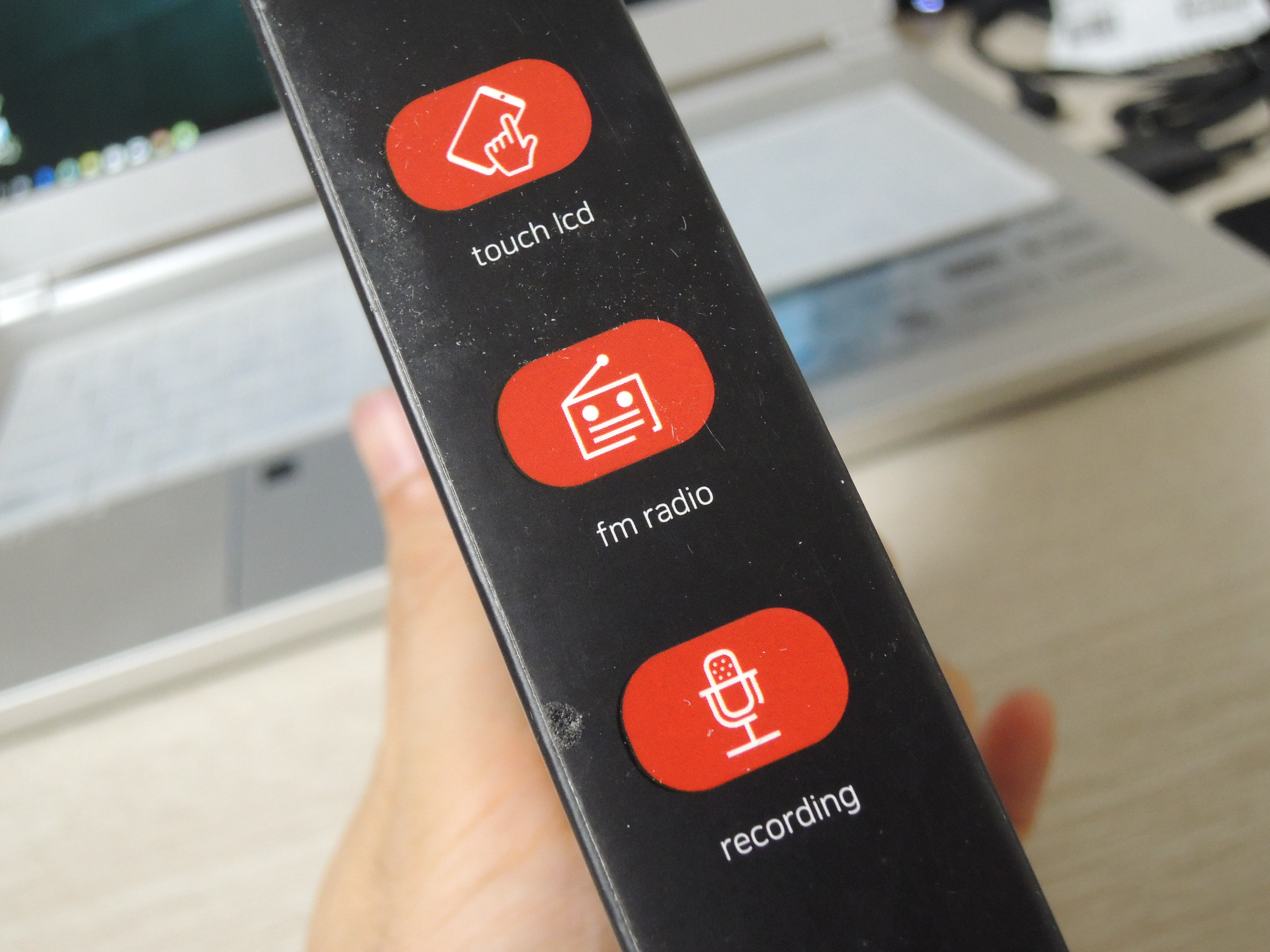 블루투스가 되는 최초의 소형 mp3라고 하더라고요. 전면에 버튼이 없고 터치로 조작하는것이 특징입니다.