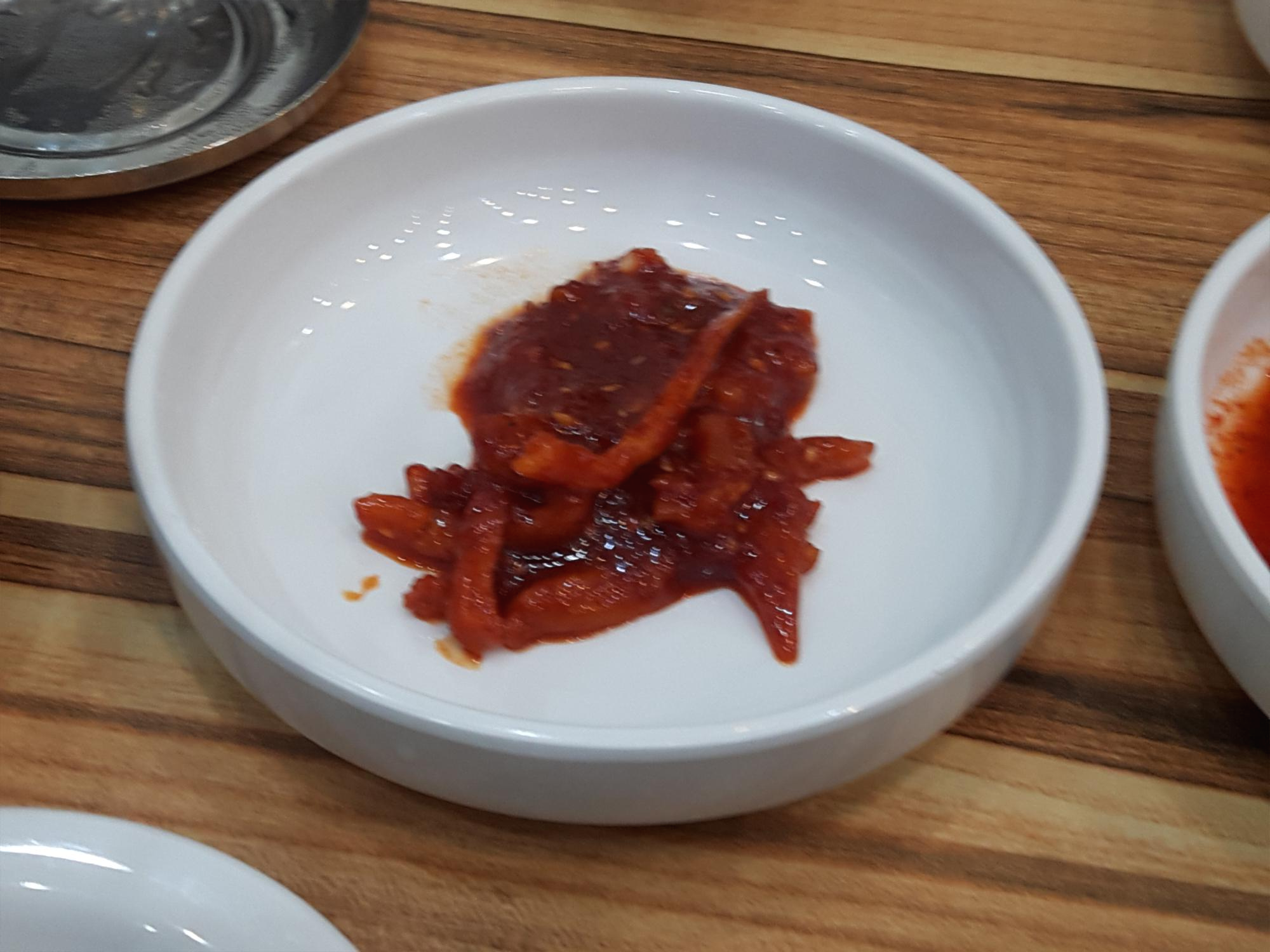 밑반찬은 젓갈류와 깍두기가 나오는데, 각 테이블마다 깍두기통이 있어서 얼마든지 더 덜어먹을 수 있어요.