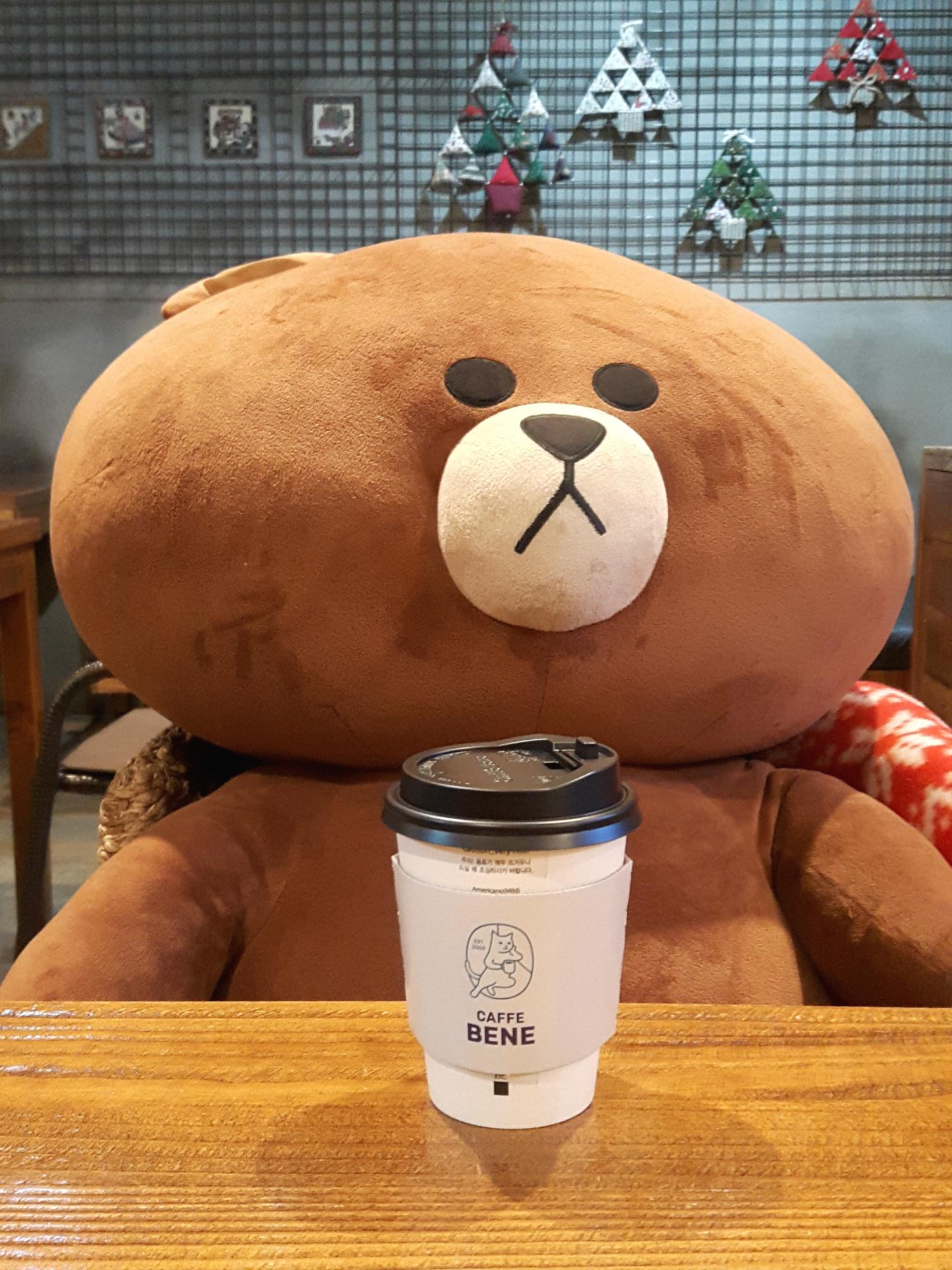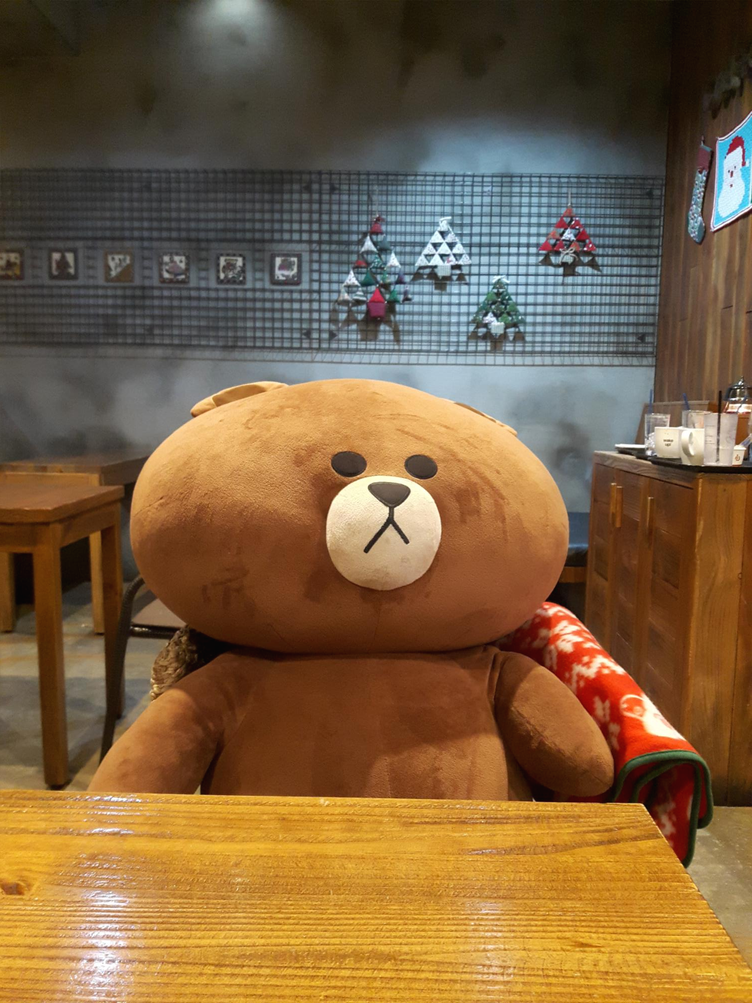 귀여운 대형 곰인형이 있길래 앞에 앉아서 한장 찍어 봤어요. 넘 귀엽죠. ㅎㅎ 네이버 캐릭터 중에 비슷한게 있었던거 같아요. 귀는 뒤로 접혀서 마치 귀가 없는것 같이 나왔네요.