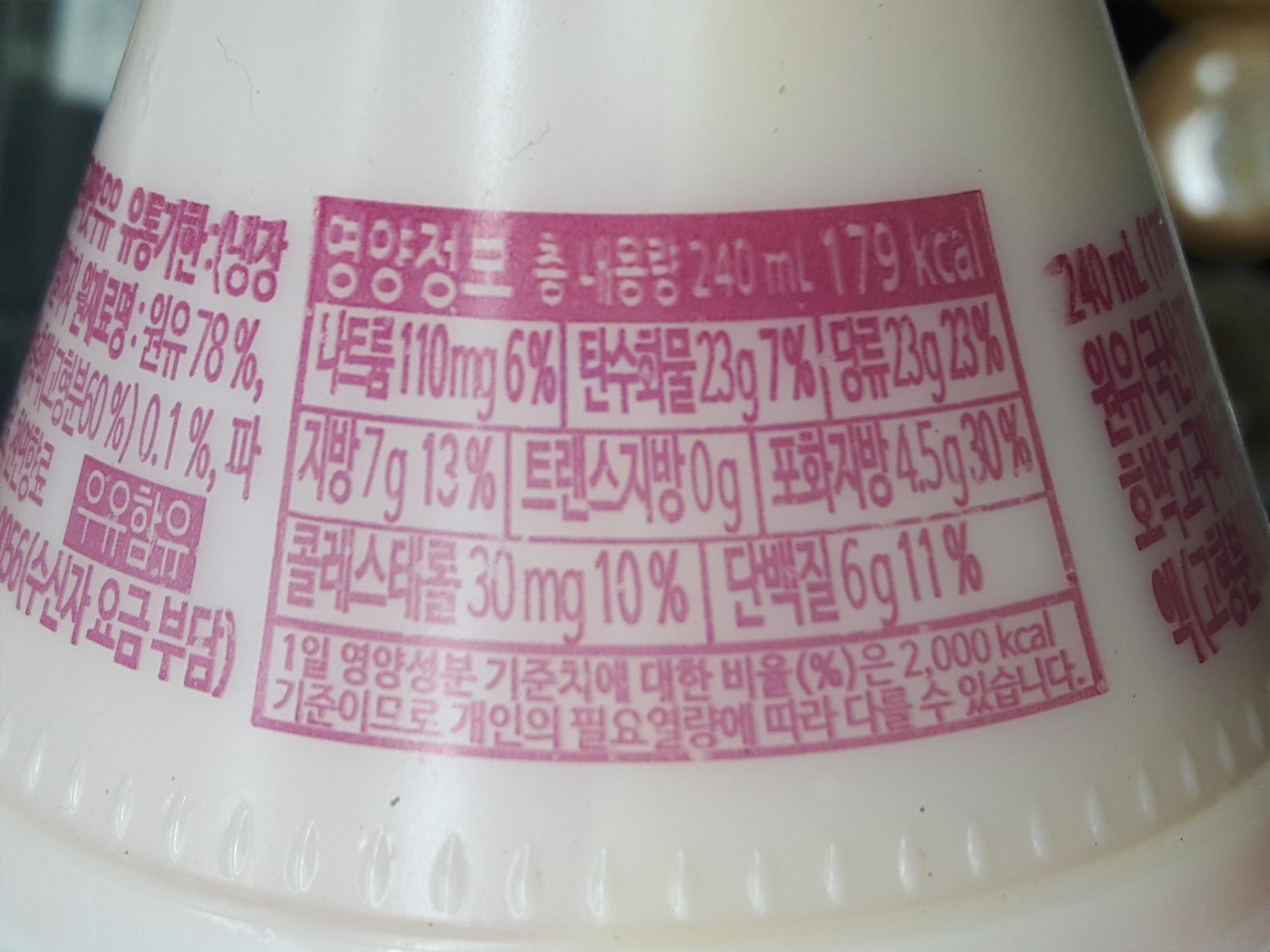 내용량은 240ml이고 칼로리는 179kcal 입니다. 원유(국산) 78%, 호박고구마(국산) 농축액(고형분 60%) 0.1% 들어있어요.