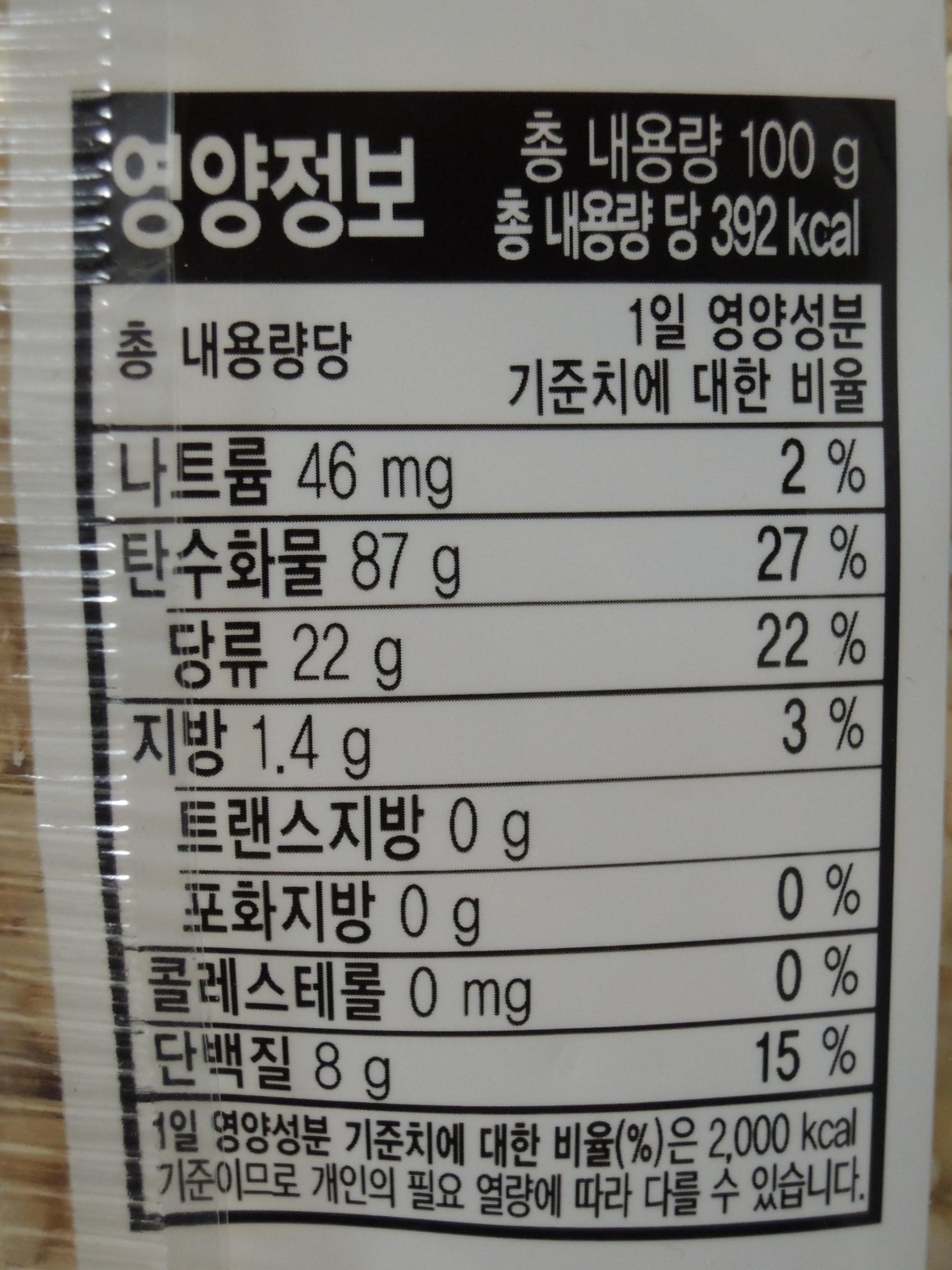 총 내용량은 100g, 칼로리는 392kcal에요. 쌀이 48.6% 함유되어 있어요.