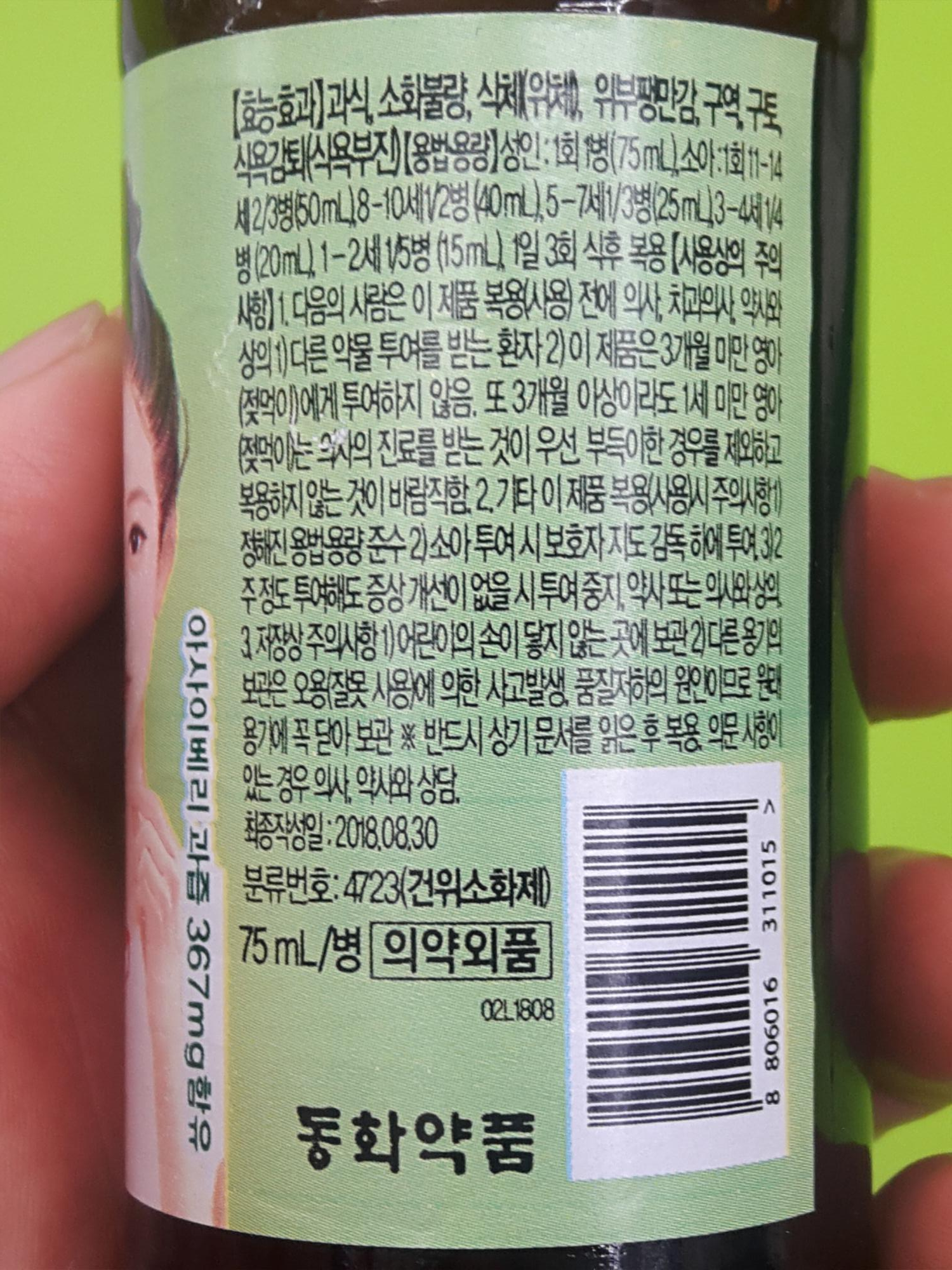 과식, 소화불량 등 증상 시 먹으라고 되어 있습니다. 분류번호 4723의 건위 소화제고요. 의약외품입니다. 성인 1회 1병이고, 소아는 2/3병 1회가 적정량이래요. 1일 3회 식후 복용하라고 쓰어있습니다.