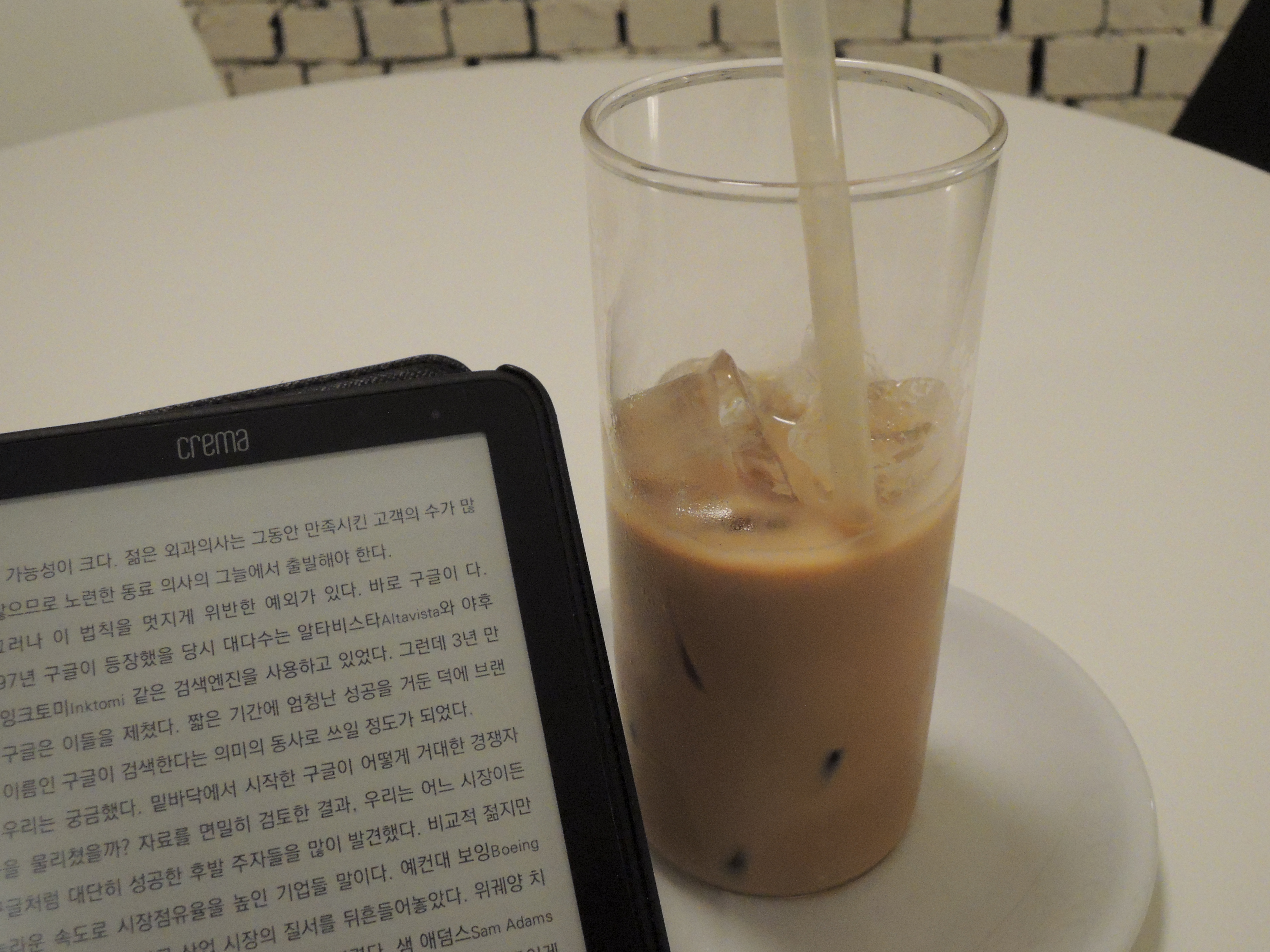 플라츠 밀크티를 주문하고 마시면서 전자책을 읽습니다. 크레마카르타 라는 기종이고요. 전자잉크라서 오래봐도 눈이 아프지 않고, 배터리도 오래 가더라고요. 무게가 가벼워서 들고다니기 쉽다는거, 그리고 인터넷 와이파이가 되는 공간에서 얼마든지 전자도서관에서 책을 손쉽게 빌릴 수 있는 점이 참 좋습니다. 다만 종이책처럼 종류가 많지는 않은것은 아쉽습니다.