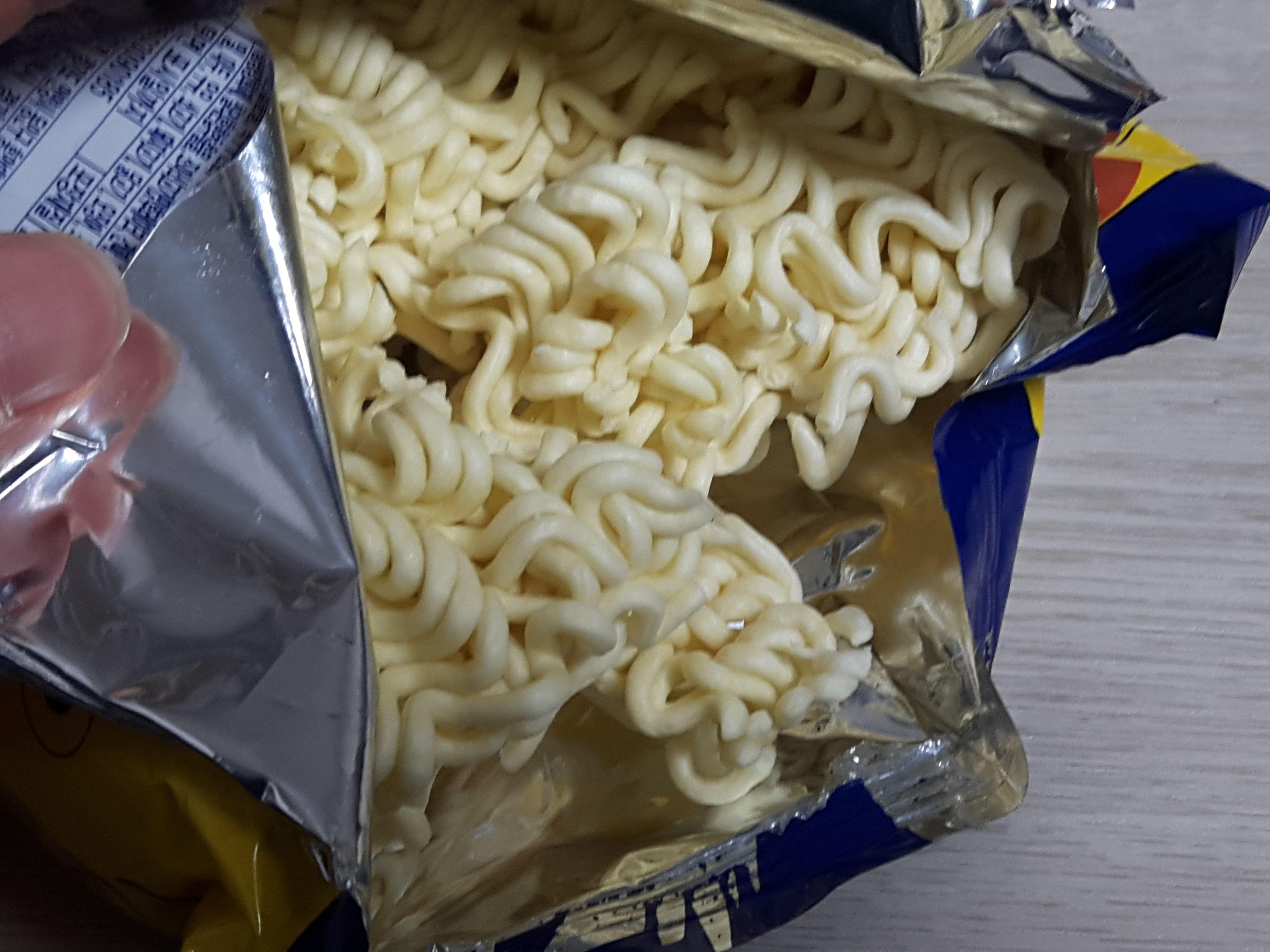 라면을 뜯습니다. 면은 유탕면입니다. 기름에 튀긴 면이죠. 요새는 건면이라고 해서 건조시킨 면도 나오더라고요. 차이는 기름이 많이들어가냐 적게들어가냐 유무입니다.
