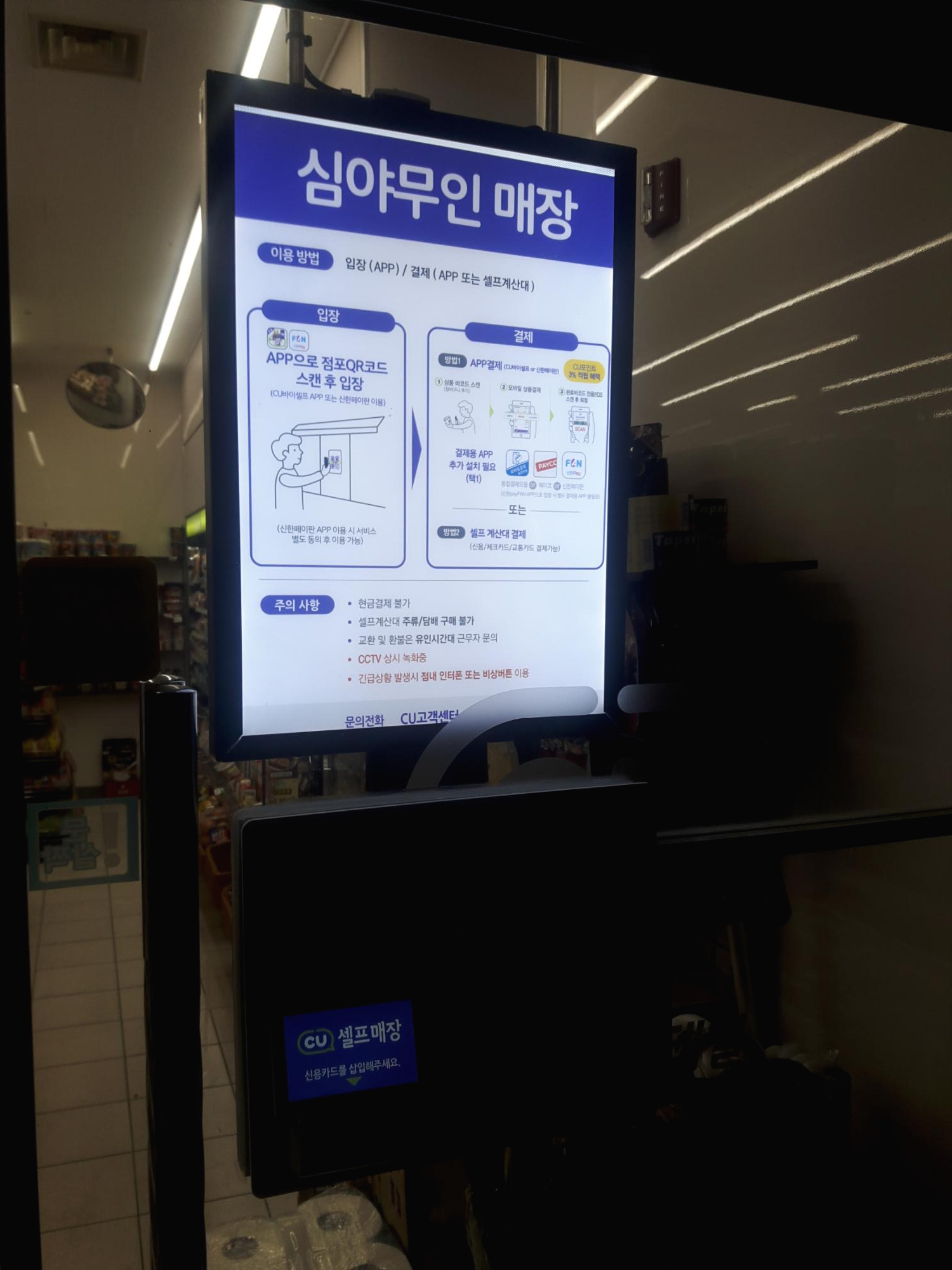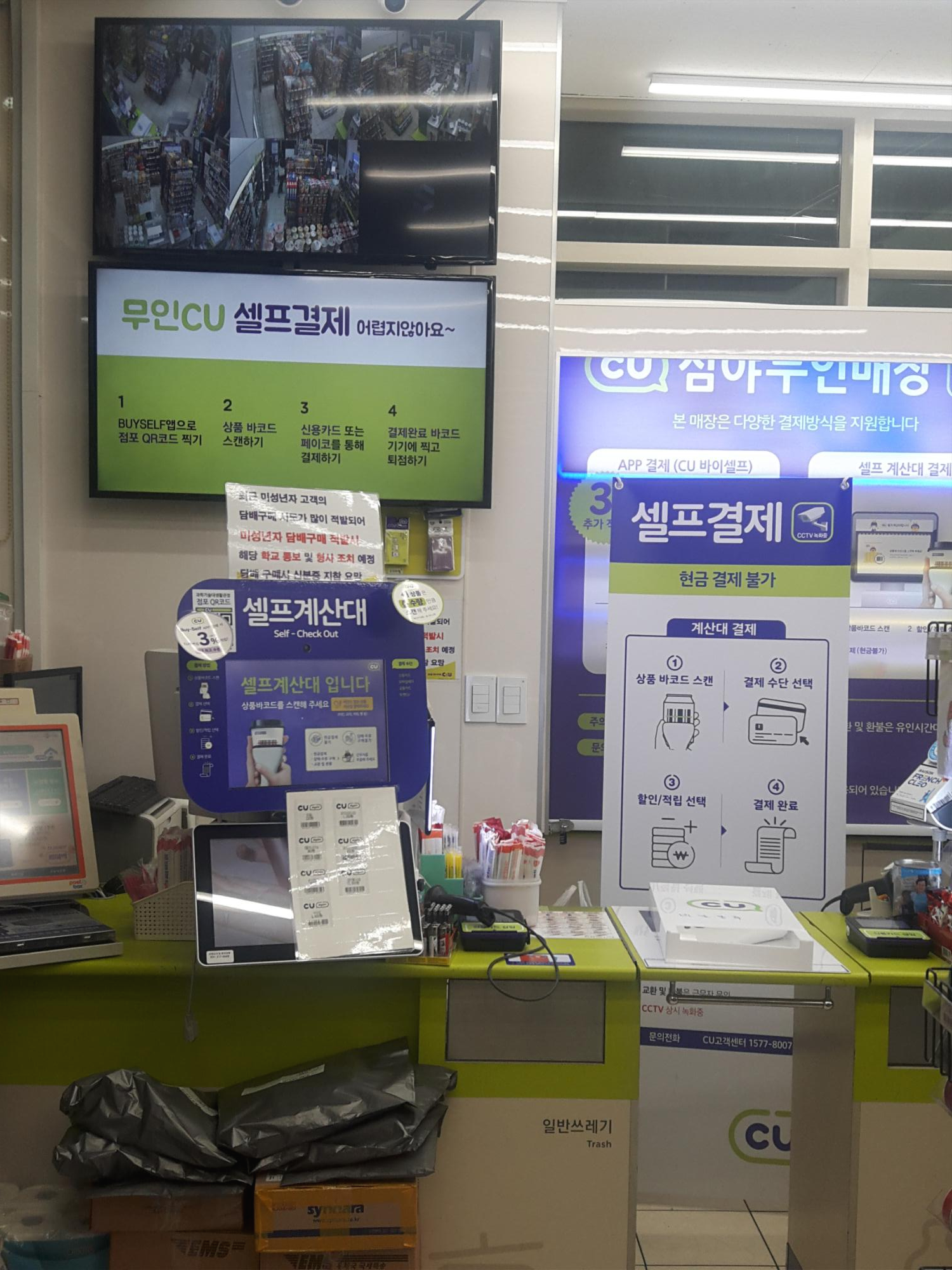 원래 직원분이 있던 카운터엔 이렇게 무인편의점 이용방법이 적힌 현수막이 배치되어 있어요. 현수막에 쓰여진대로 셀프결재를 하면 됩니다. 넘 간편하네요. 무인편의점은 안전을 위해 CCTV가 여러대 설치되어 있어요.