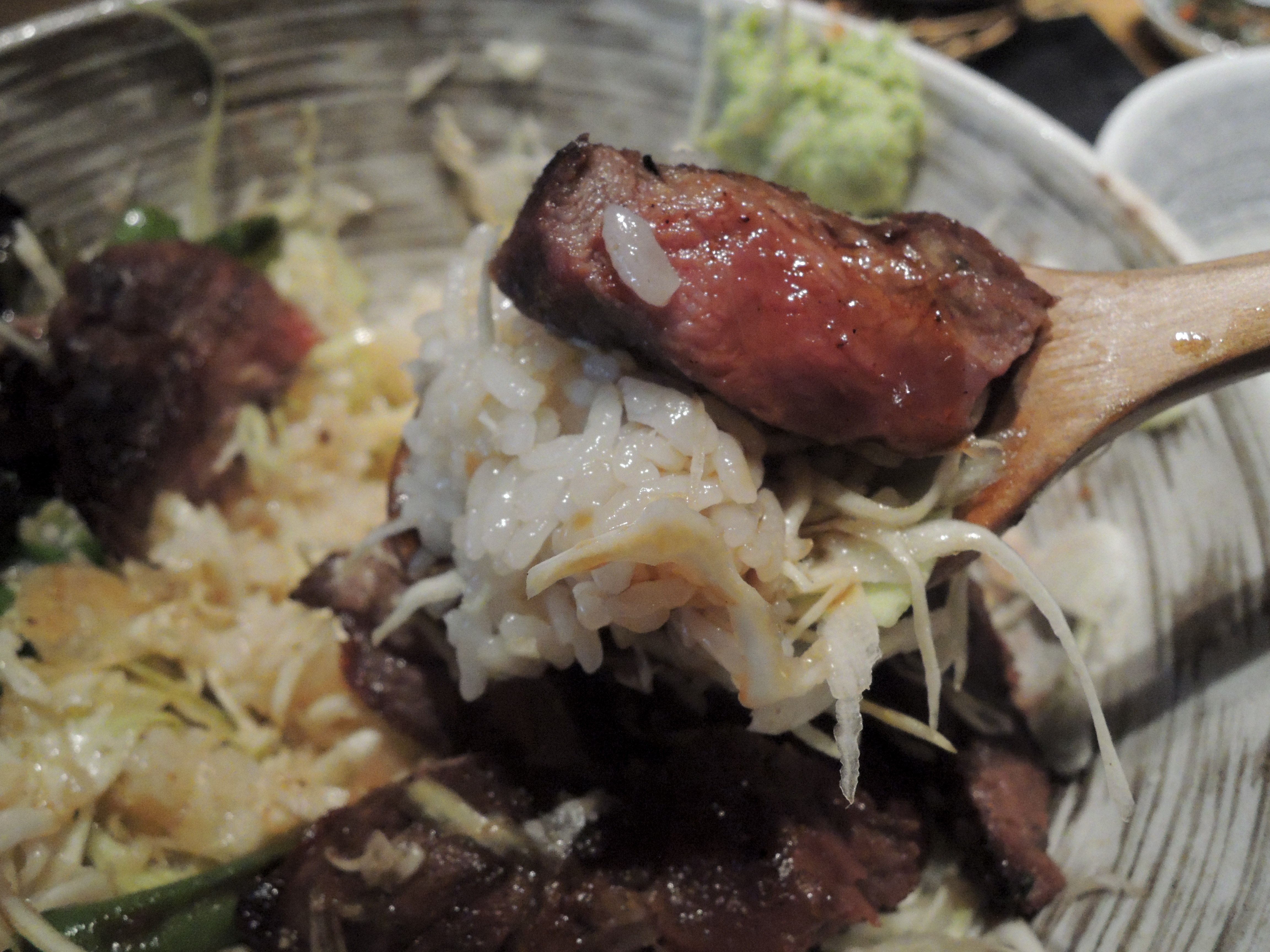 고기는 미디움 굽기로 나오는거 같아요. 스테이크덮밥으로 먹기 딱 좋은 굽기로 나옵니다. 고기는 미국산 최고급 부채살을 씁니다.