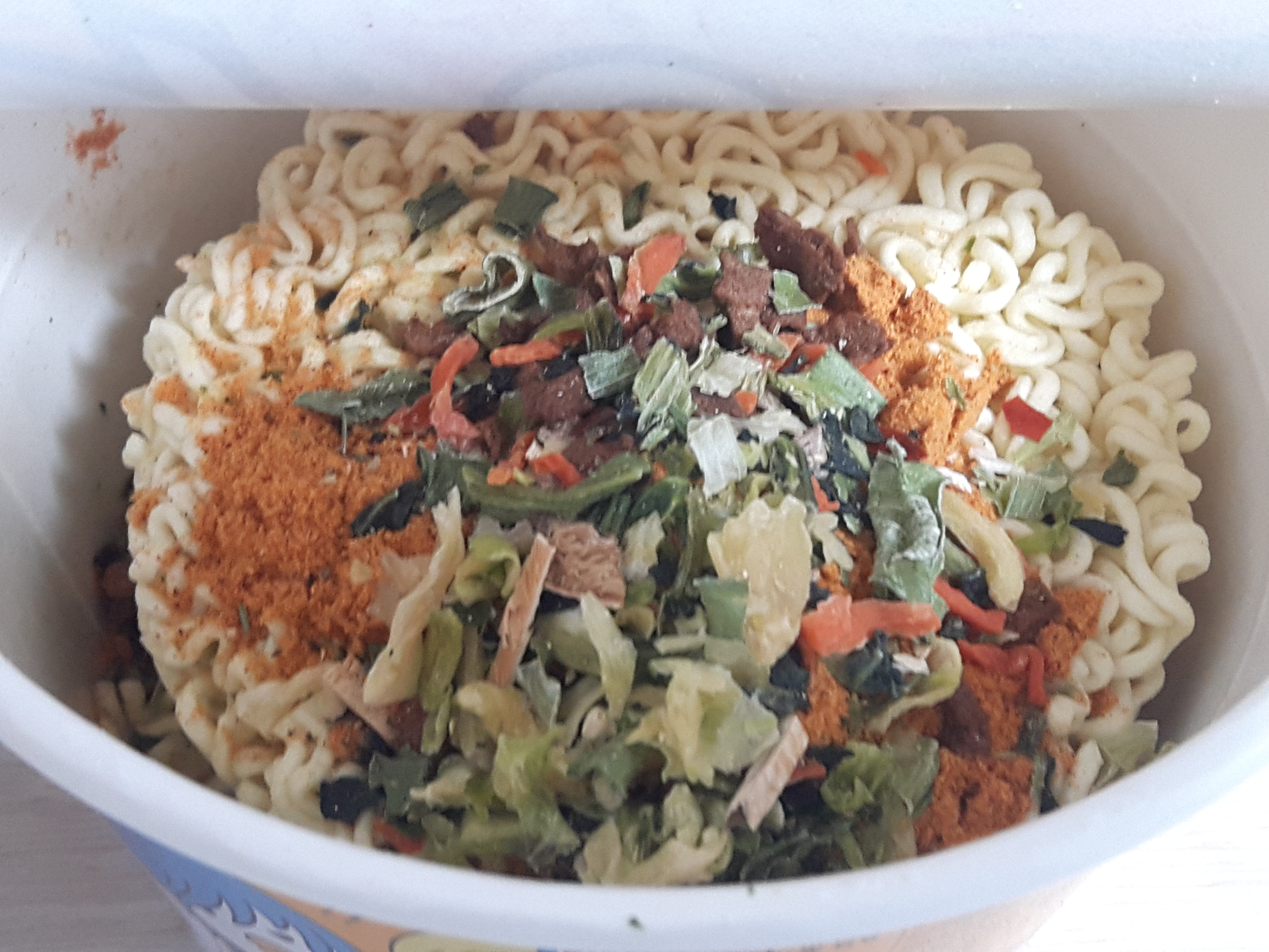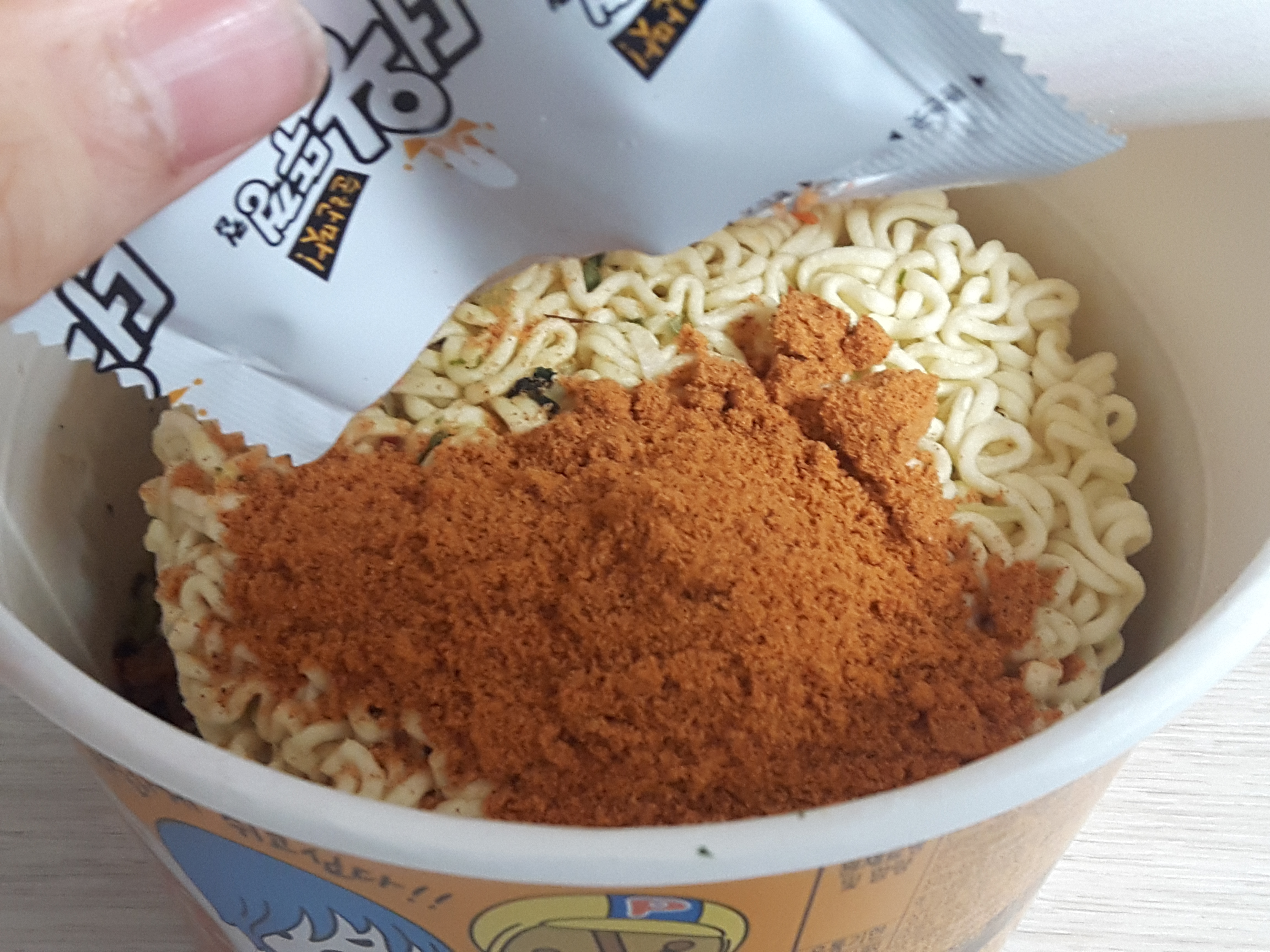 뚜껑을 열면 약간의 건더기스프는 라면에 뿌려져 있고, 분말스프만 작은 봉투에 들어 있습니다. 봉투를 열어 분말 스프를 뿌려줍니다.