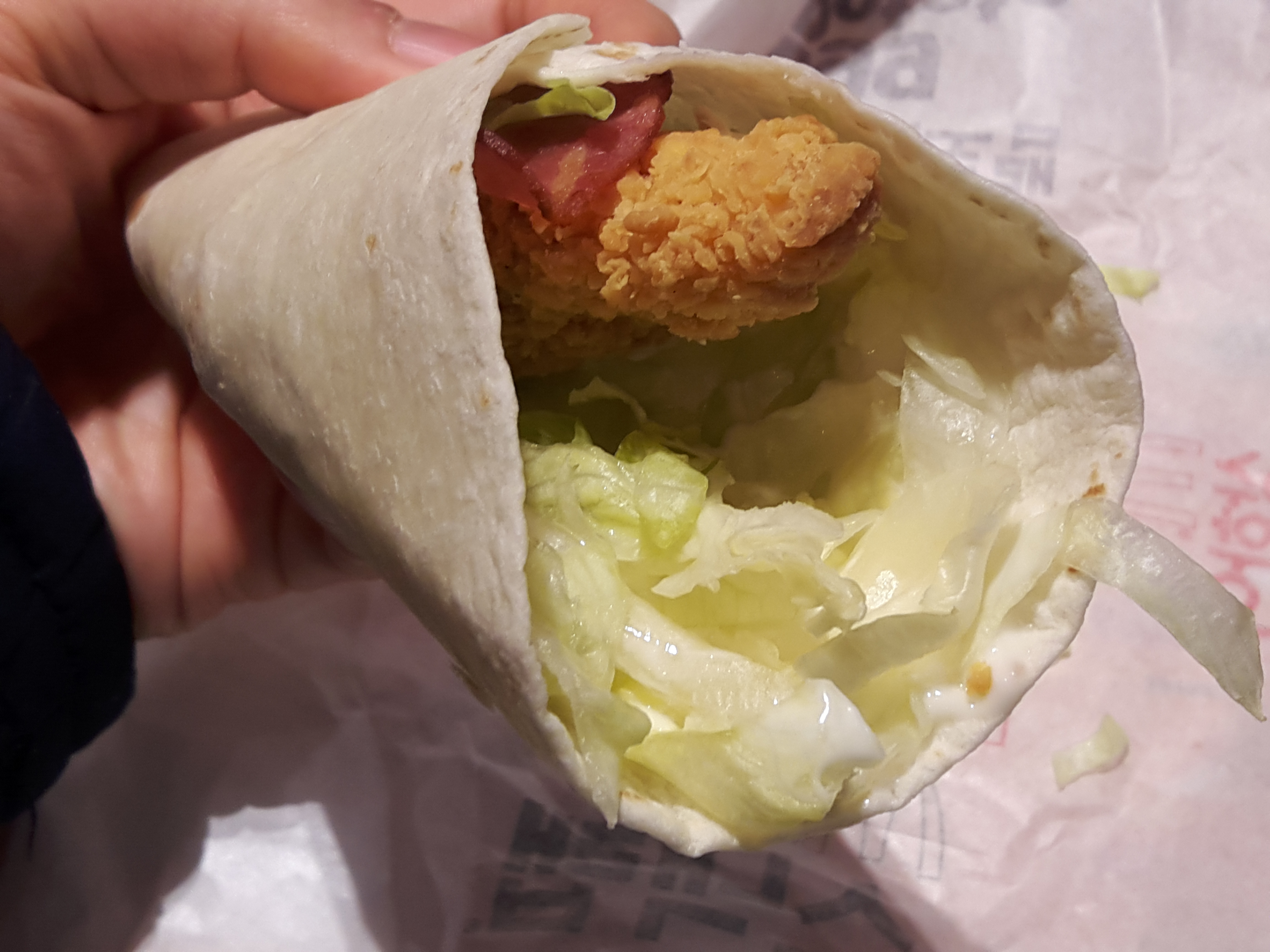 또띠아안에는 베이컨, 양상추, 치킨이 들어있고, 소스는 마요네즈 소스입니다.