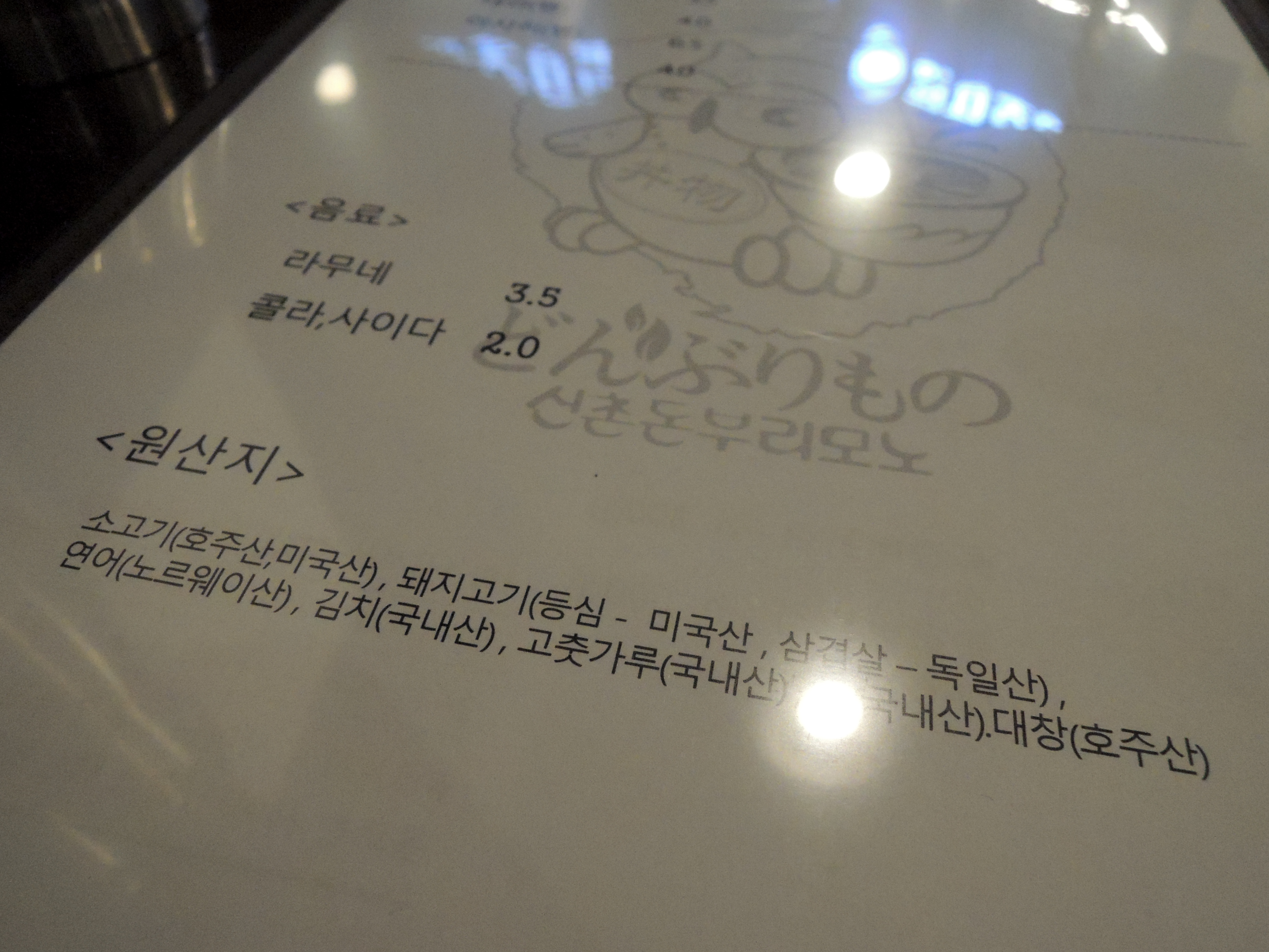 소고기(호주산, 미국산), 돼지고기(등심 - 미국산, 삼겹살 - 독일산), 연어(노르웨이산), 김치(국내산), 고추가루(국내산), 쌀(국내산), 대창(호주산)