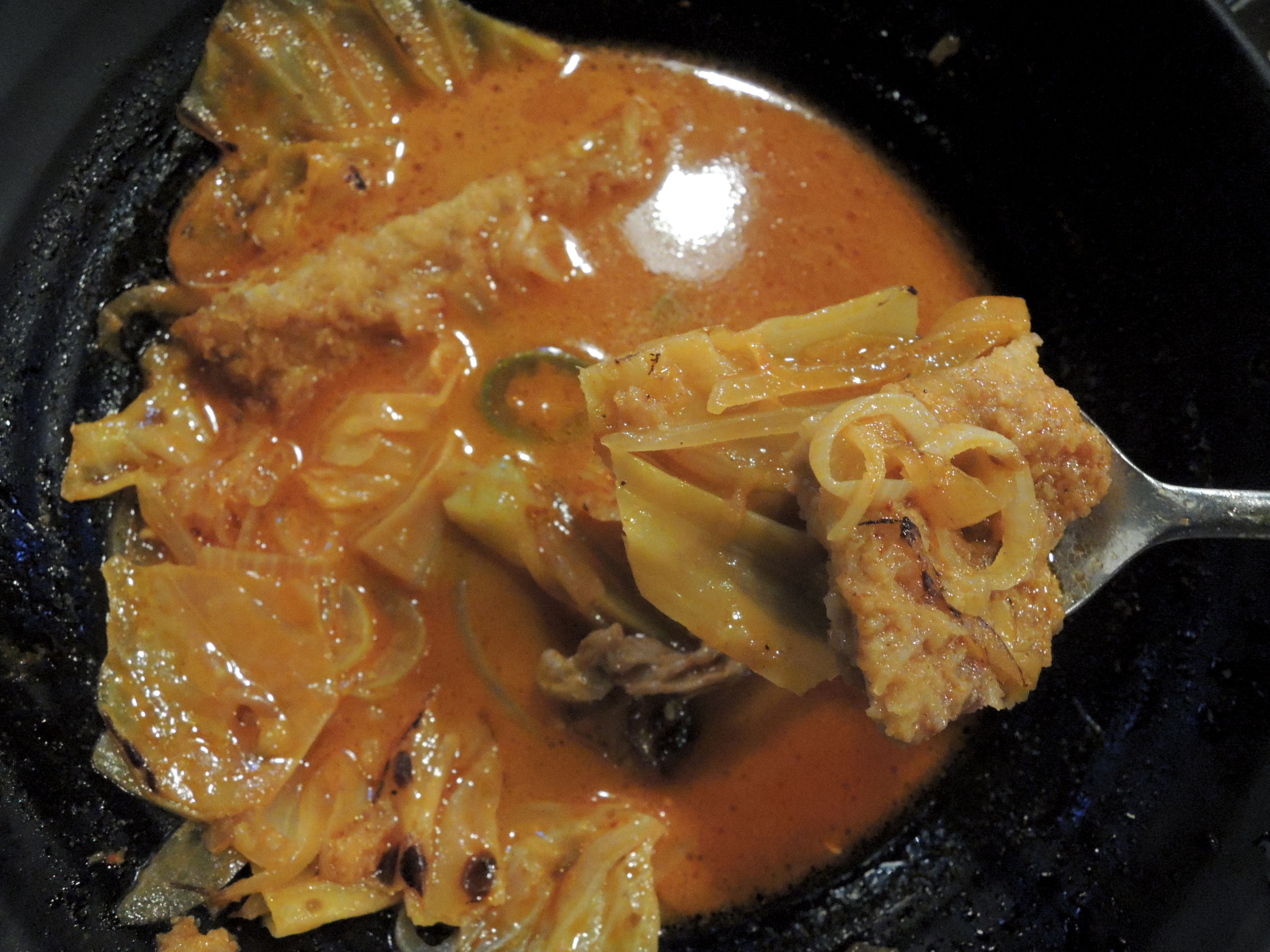 돈돈나베입니다. ㅎ 매콤한 찌개위에 돈까스가 얹어져 있어요.