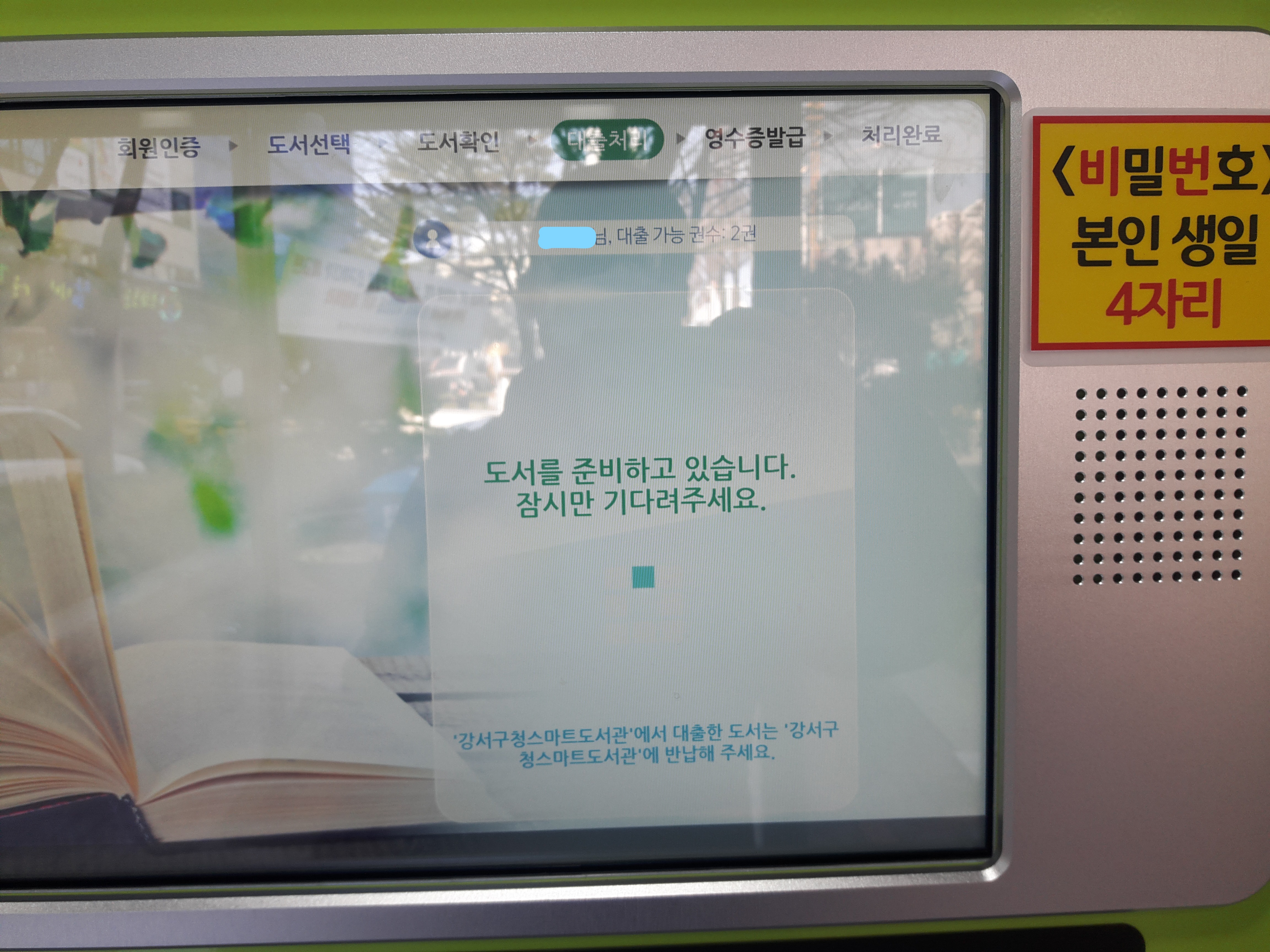 대출증을 하단의 바코드에 인식시키고, 장바구니를 확인한뒤 대출을 누르면 도서가 준비되며, 위 화면이 뜹니다.