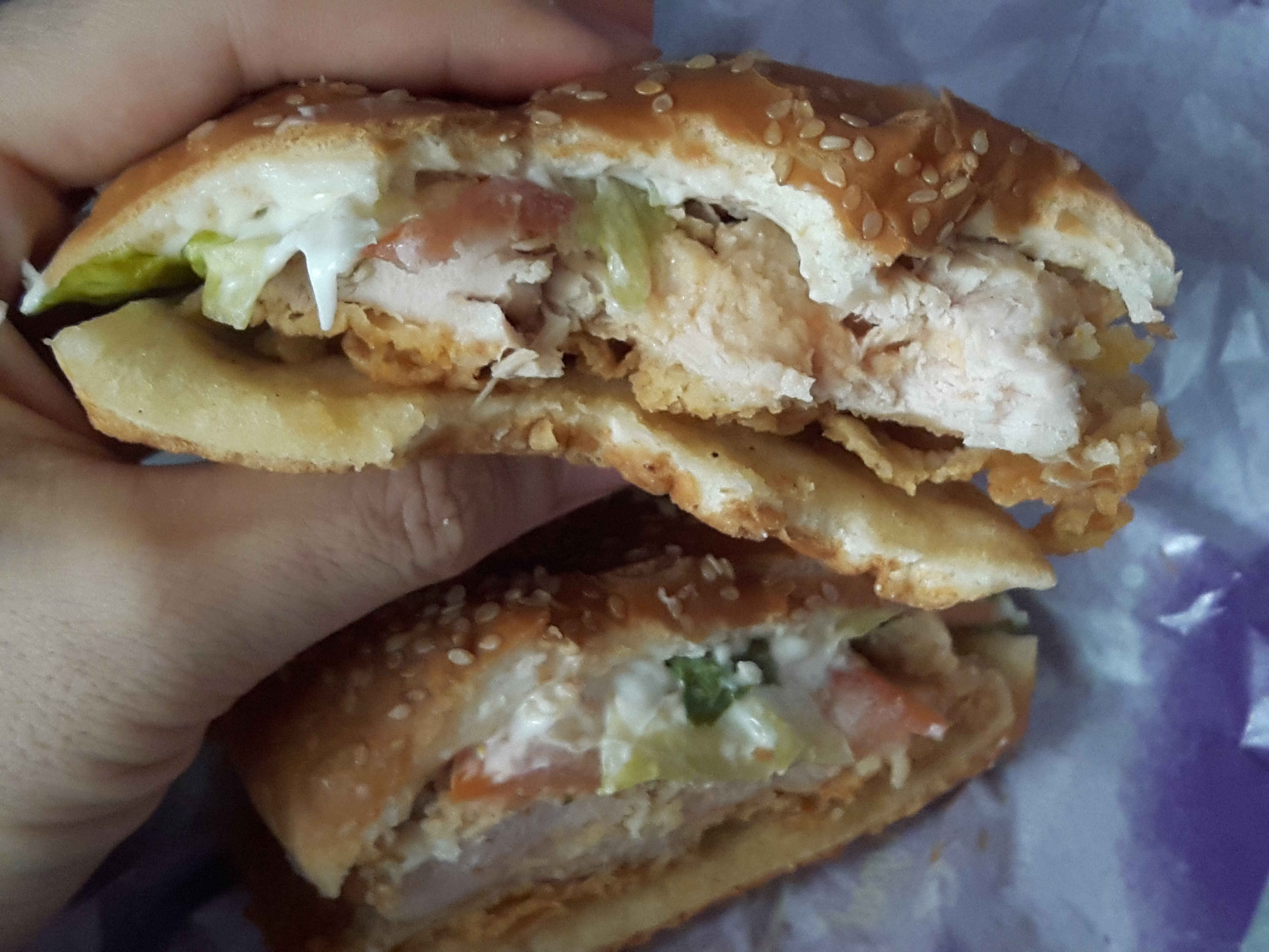 한입 먹어봅니다. 매콤한 소스가 튀김옷에 뿌려져 있어서 패티에 매콤한 맛이 납니다. 그리고 양상추에 마요네즈가 뿌려져 있어서 매콤한 패티와 부드러운 마요네즈가 조화를 이룹니다. 아삭한 토마토의 식감또한 좋습니다. 패티는 닭가슴살로 만들어서 좀 퍽퍽하지만 콜라와 같이 마시면 큰 문제는 없을거 같습니다. 그리고 양상추와 마요네즈가 있어서 많이 퍽퍽하진 않아요.