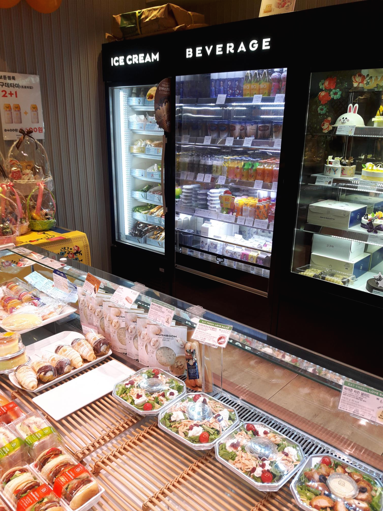 입구로 들어가면 매장 오른쪽에 케이크와 음료, 우유, 아이스크림이 있고요.
