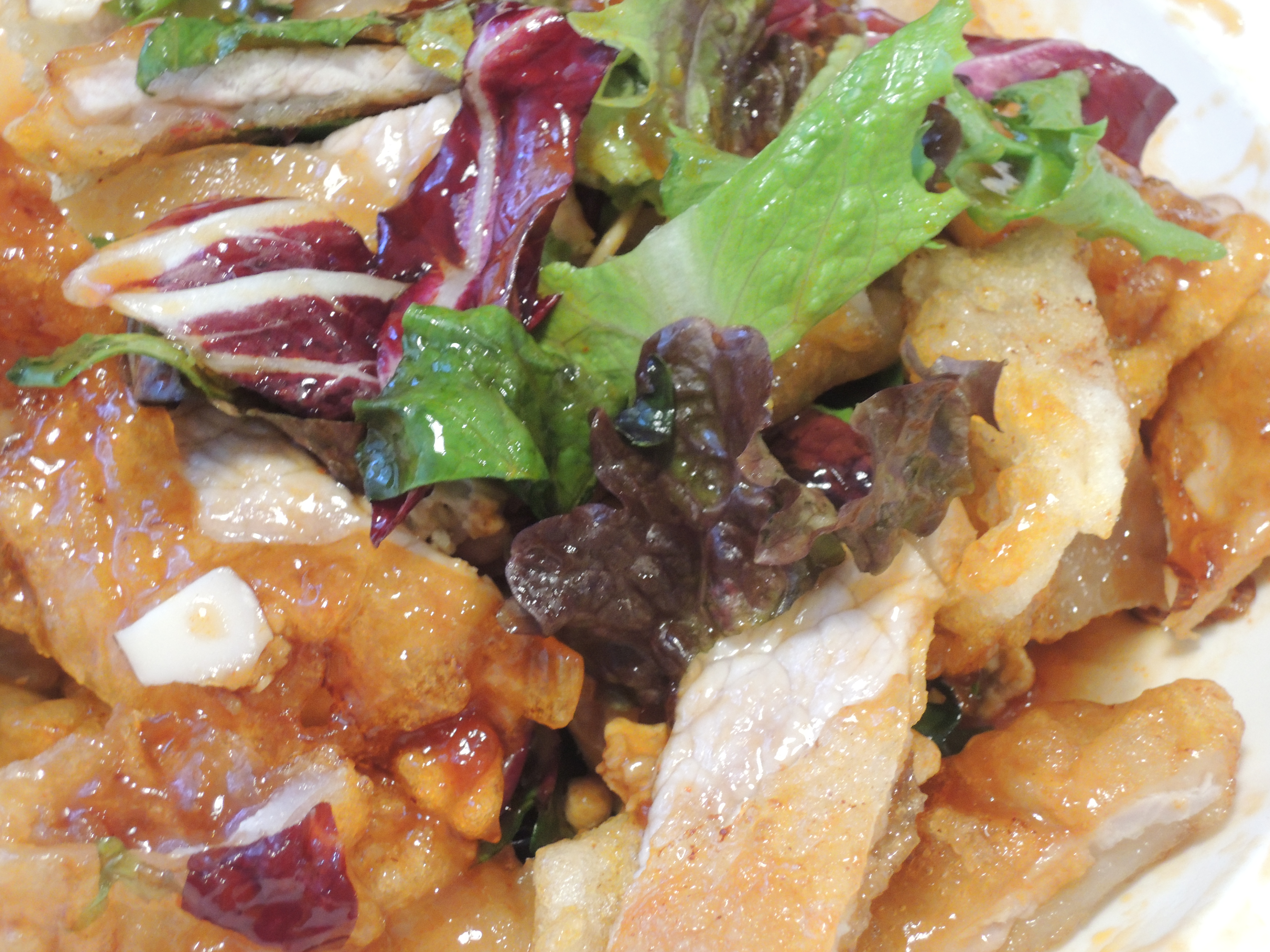 꿔바로우입니다. 중국식전통탕수육이죠. 납작하게 돼지고기를 잘 눌러서 튀긴음식입니다. 쫄깃한 튀김옷과 돼지고기가 매력인 음식이죠. 간혹 다른곳은 딱 꿔바로우만 주는 경우도 있는데, 여기는 견과류도 뿌려주고, 신선한 채소도 들어있어서 맛나게 건강하게 먹었어요.