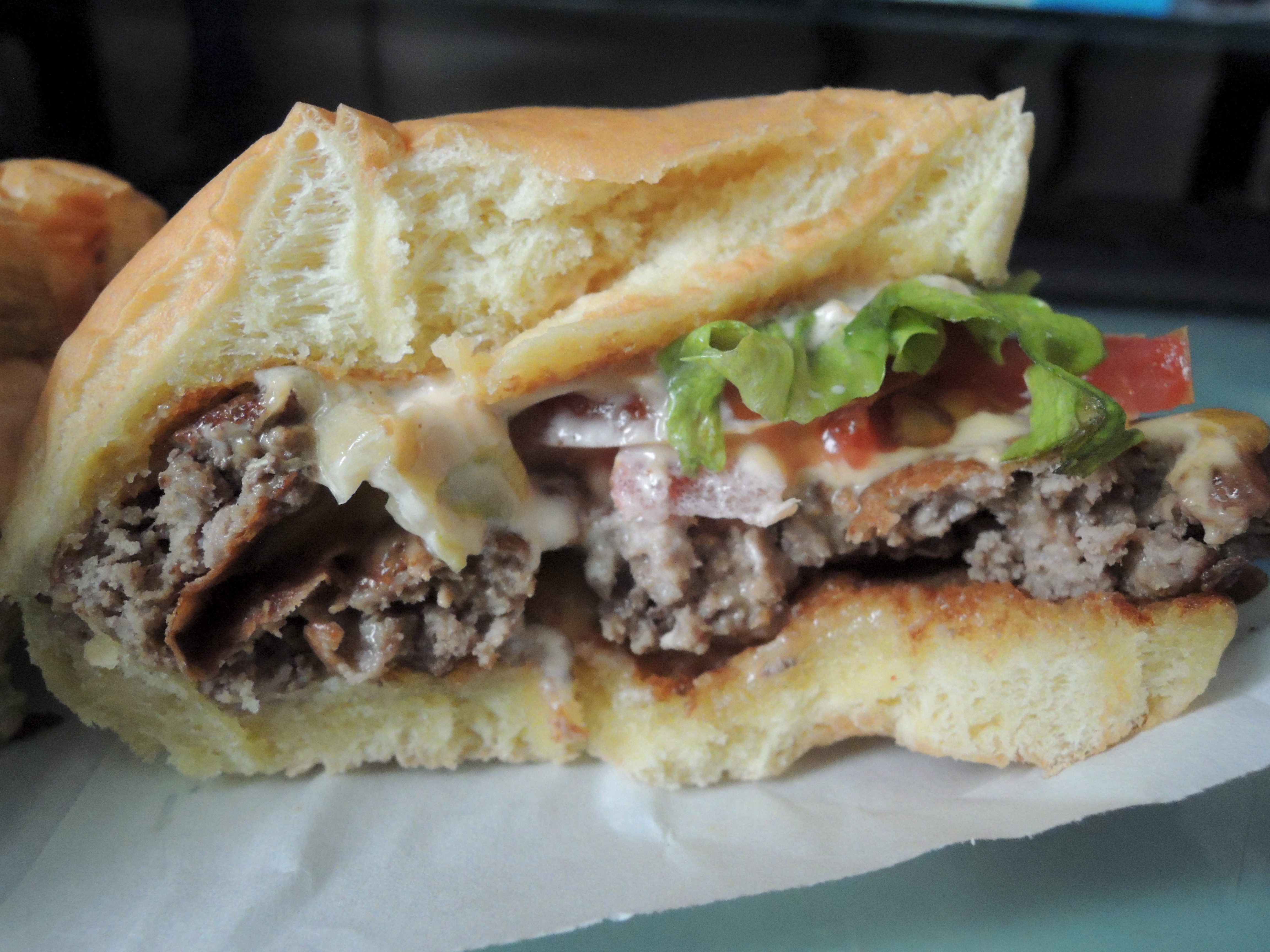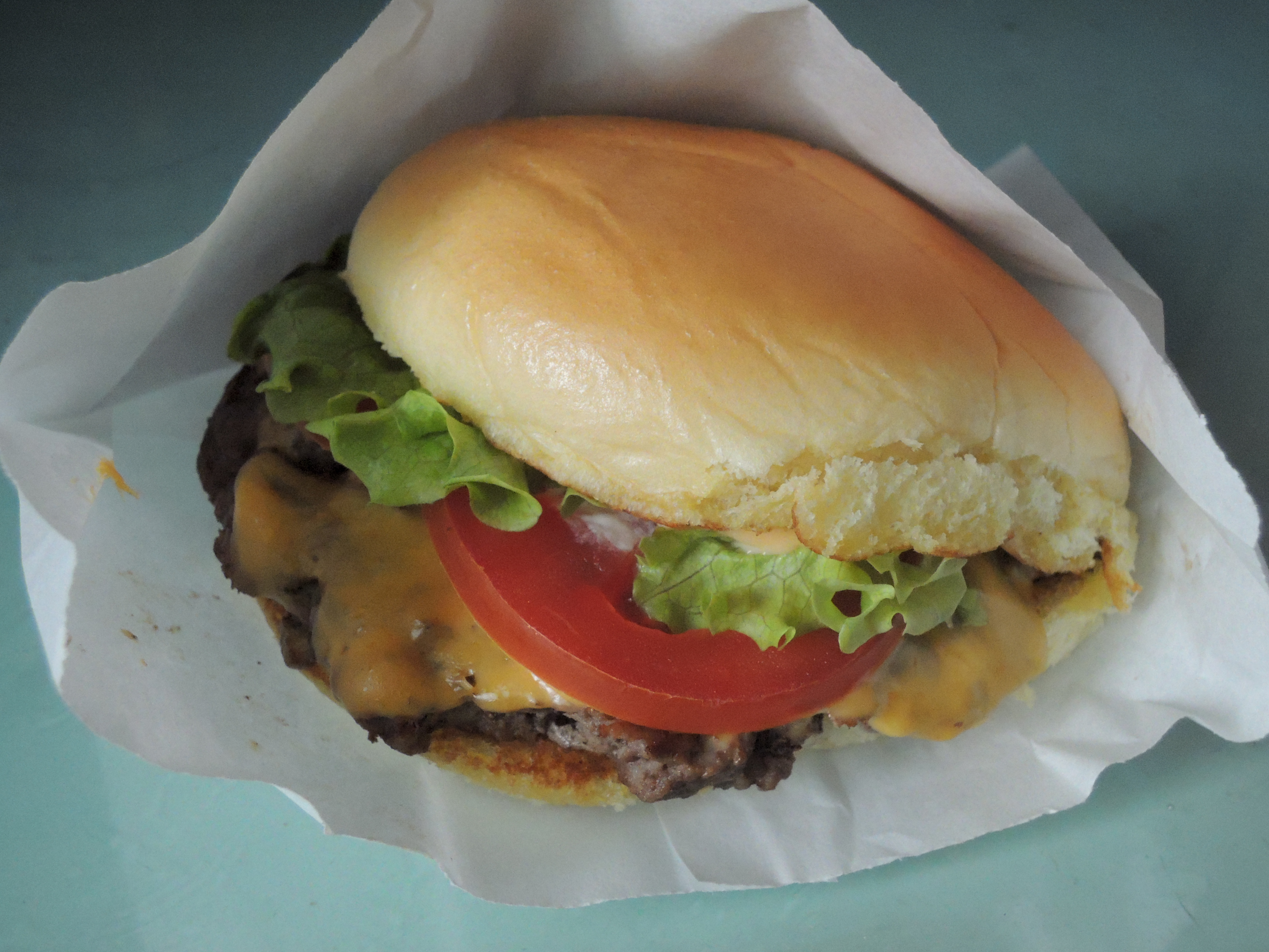 위에서 본 모습입니다. 신선한 채소와 토마토, 치즈, 패티가 돋보이네요.