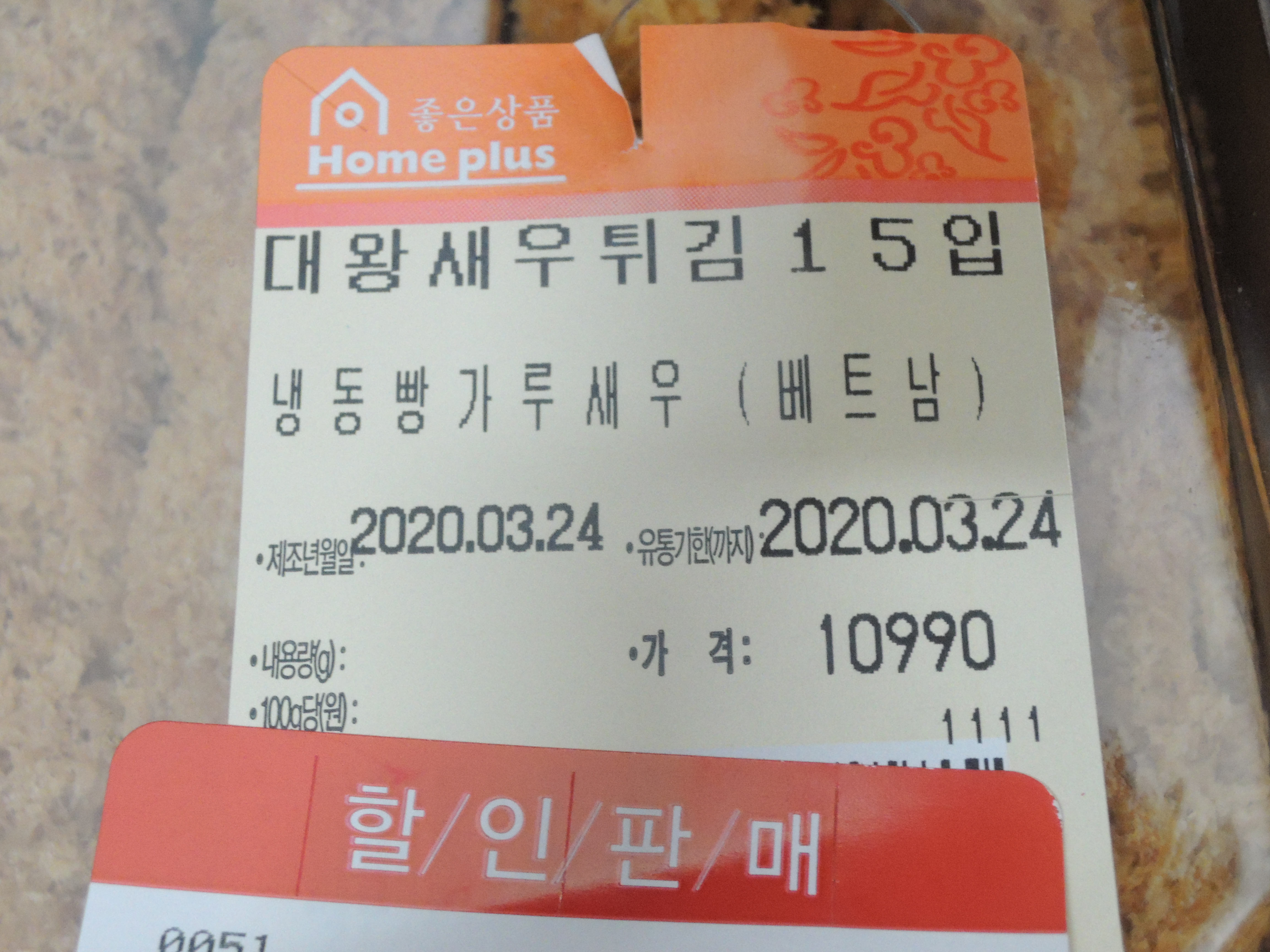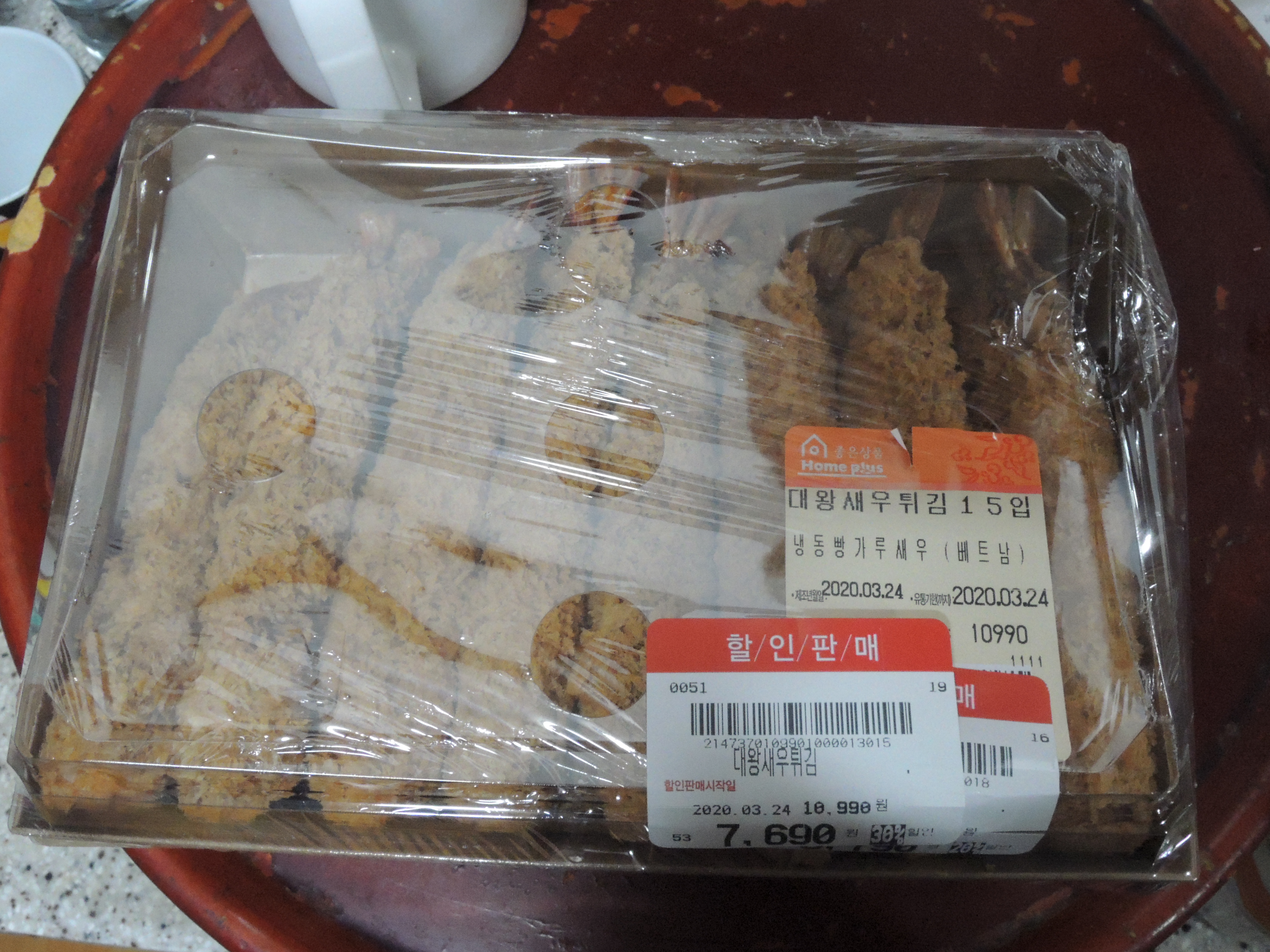 저녁에 홈플러스에 들러서 대왕새우튀김 사먹었어요. 15개 들어있고, 원래가격은 10,990원인데 마침 마감할인해서 30% 할인받아 구매했어요. 저녁 11시쯤 가면 남아있는 제품을 할인판매합니다. 저녁에 들를일이 있을때 사와서 다음날 전자레인지에 돌려먹어도 맛있어요. 무엇보다 새우튀김이 15개라 넉넉해서 오래먹을 수 있어서 맘에 들어 종종 사먹는답니다. 보통 2일은 먹는거 같아요.