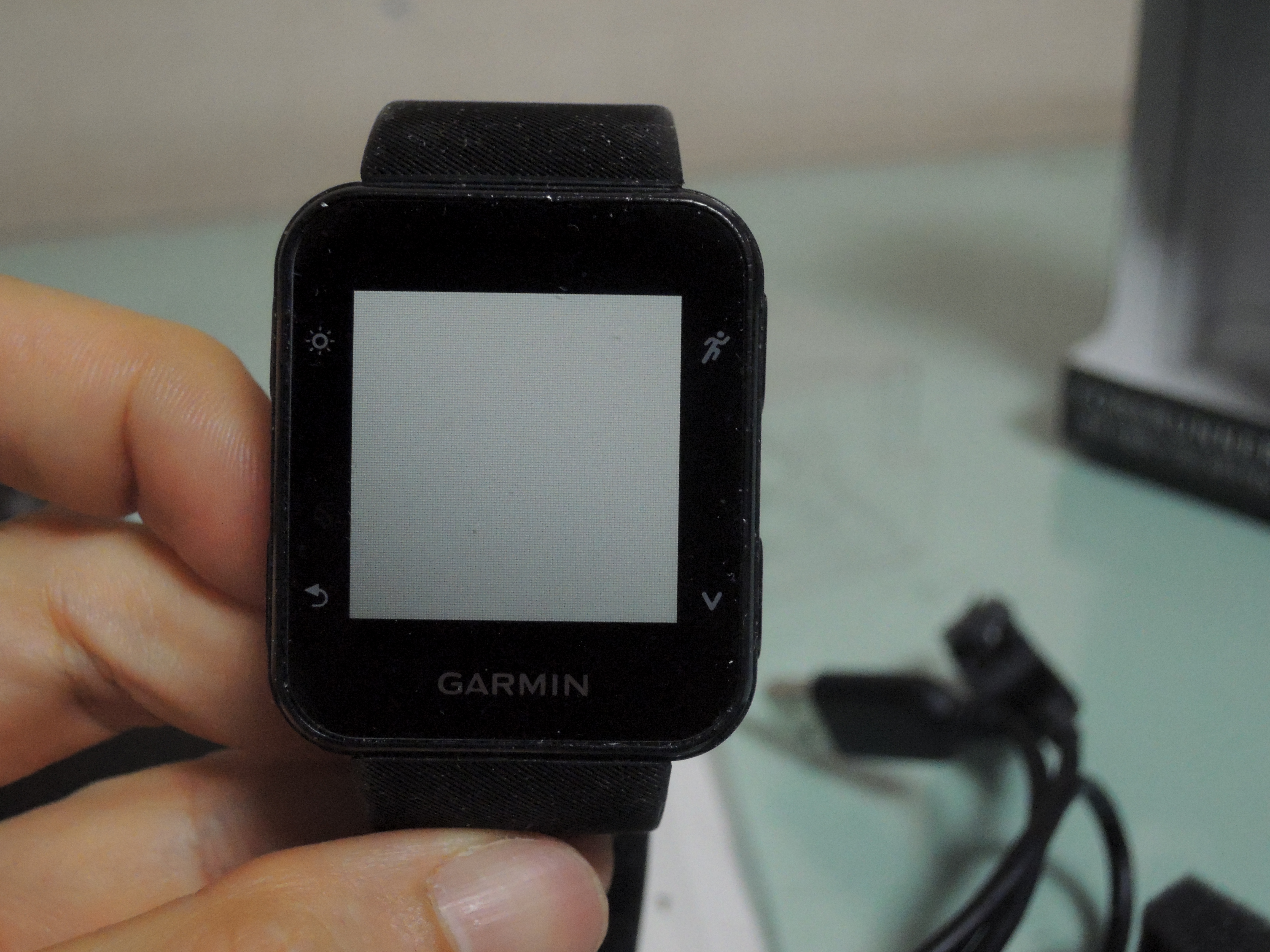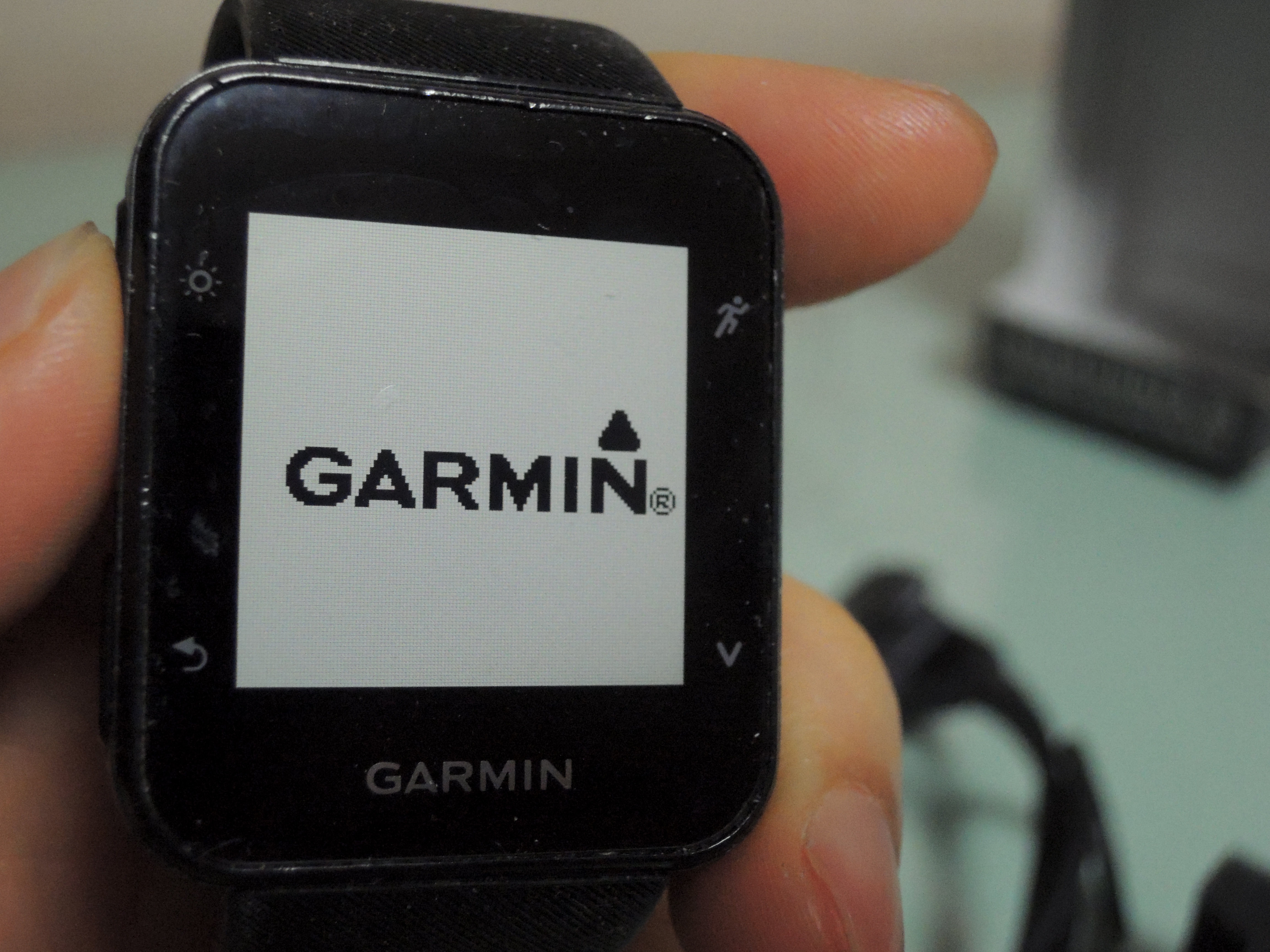 좌측상단에 전원버튼을 누르면 가민로고가 뜨면서 전원이 들어와요. 부팅은 금방 됩니다. 뒷면에 조명이 들어 있어서 불도 킬 수 있어요. 저녁시간때 달리기할때 넘 편해요. ㅎㅎ