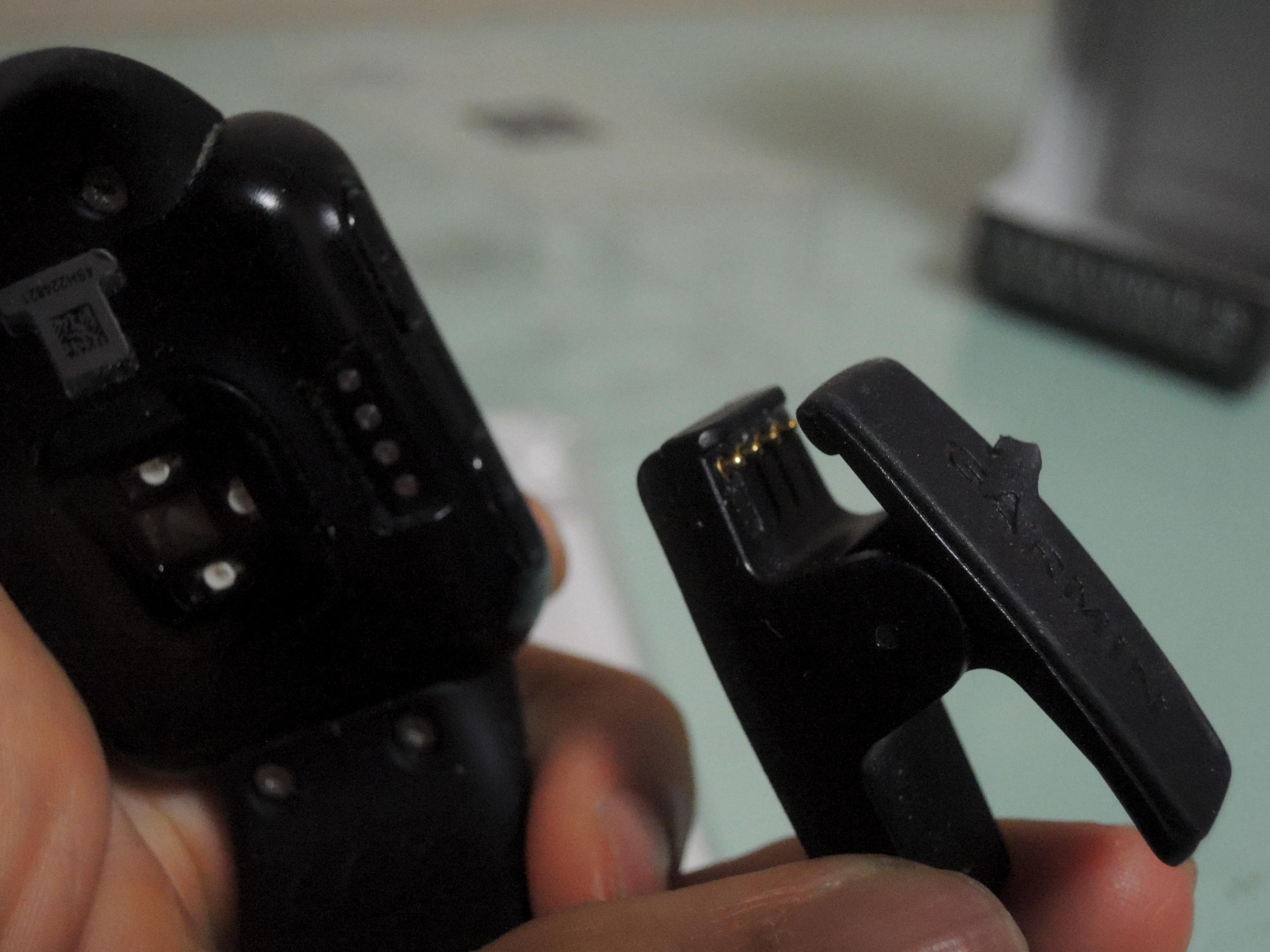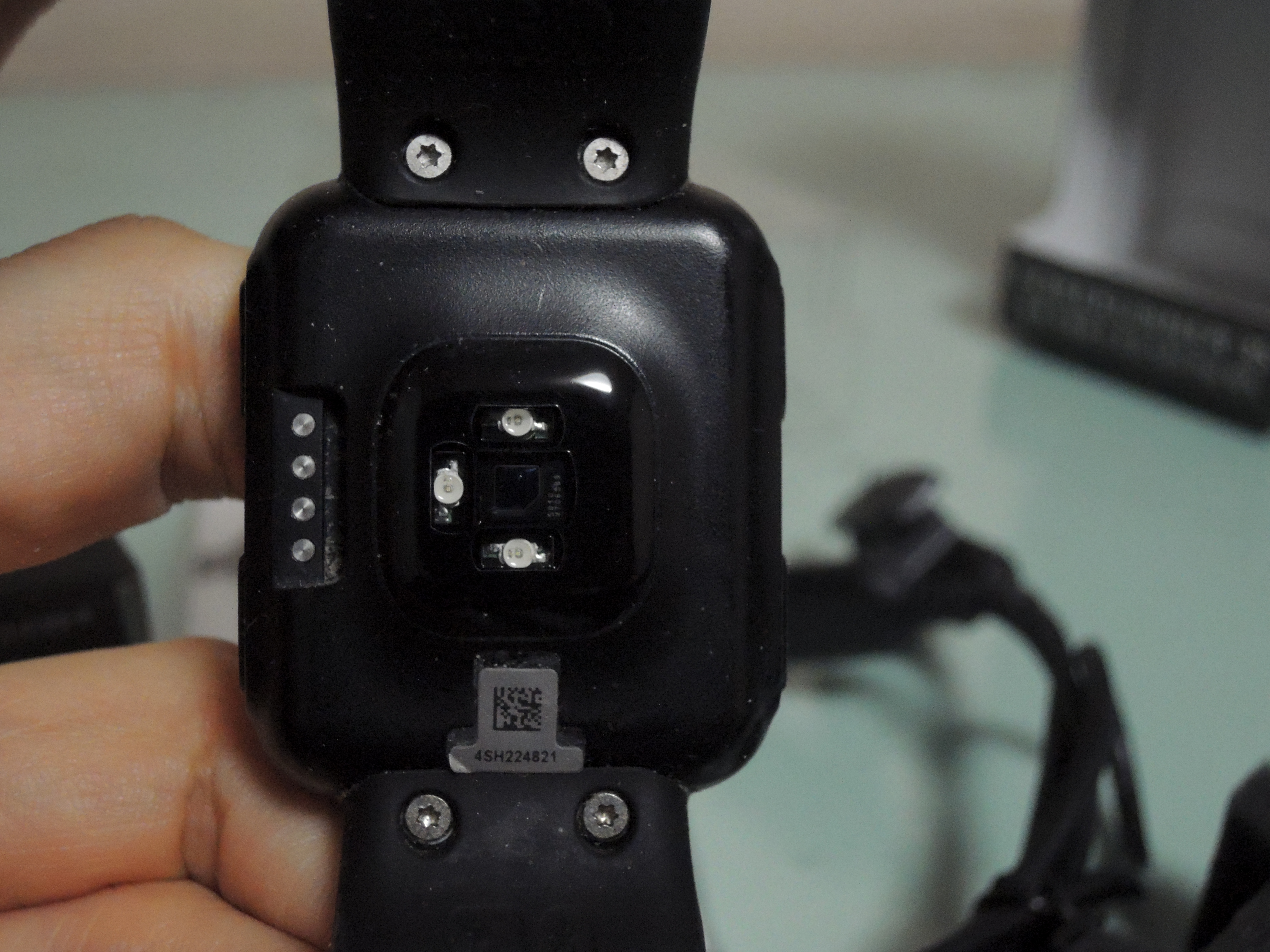 전면에는 흑백액정이, 후면에는 심박수측정센서가 붙어 있어요. 후면 왼쪽에 보이는 4개의 점은 충전선을 연결하는 단자에요.
