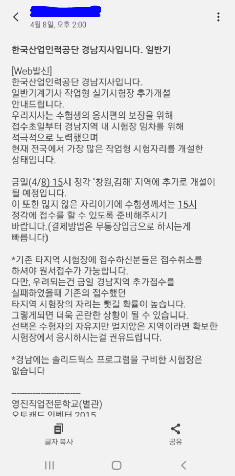 서울지역은 남부,서부 등 4개 지사가 접수를 맡고 있는데 그 쪽에 연락해보라고 하더라고요. 연락을 해보니 담당자분께서는 이번에 코로나때문에 시험장소를 많이 못구했다고 합니다. 처음에는 서부지역본부에 전화를 했는데, 첫날이고 자기들도 최대한 협의중이라고 답을 받았습니다.