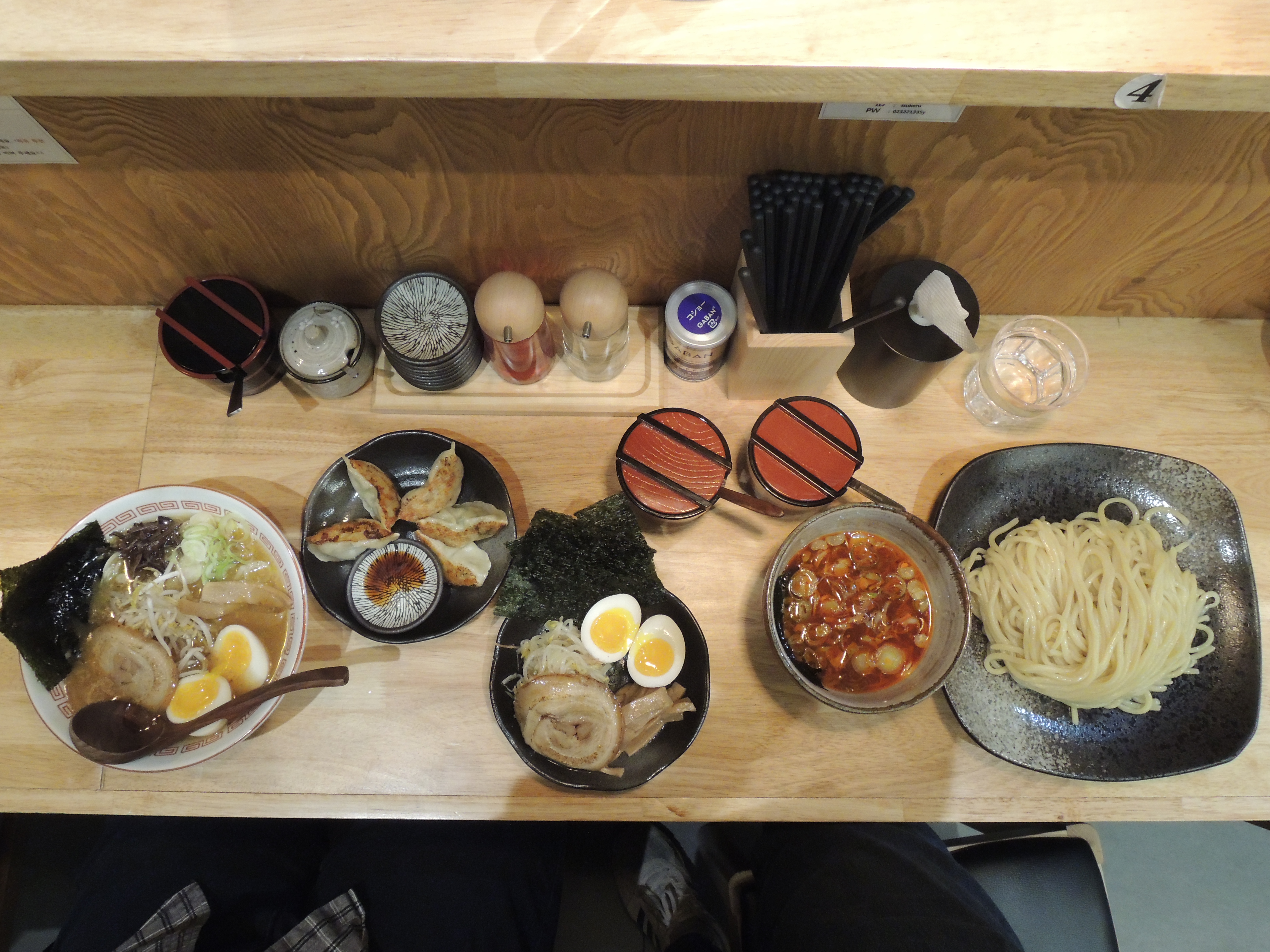 주문한 음식이 나왔네요. 좌측부터 소유라멘, 교자, 모둠토핑, 카라츠케멘 입니다.