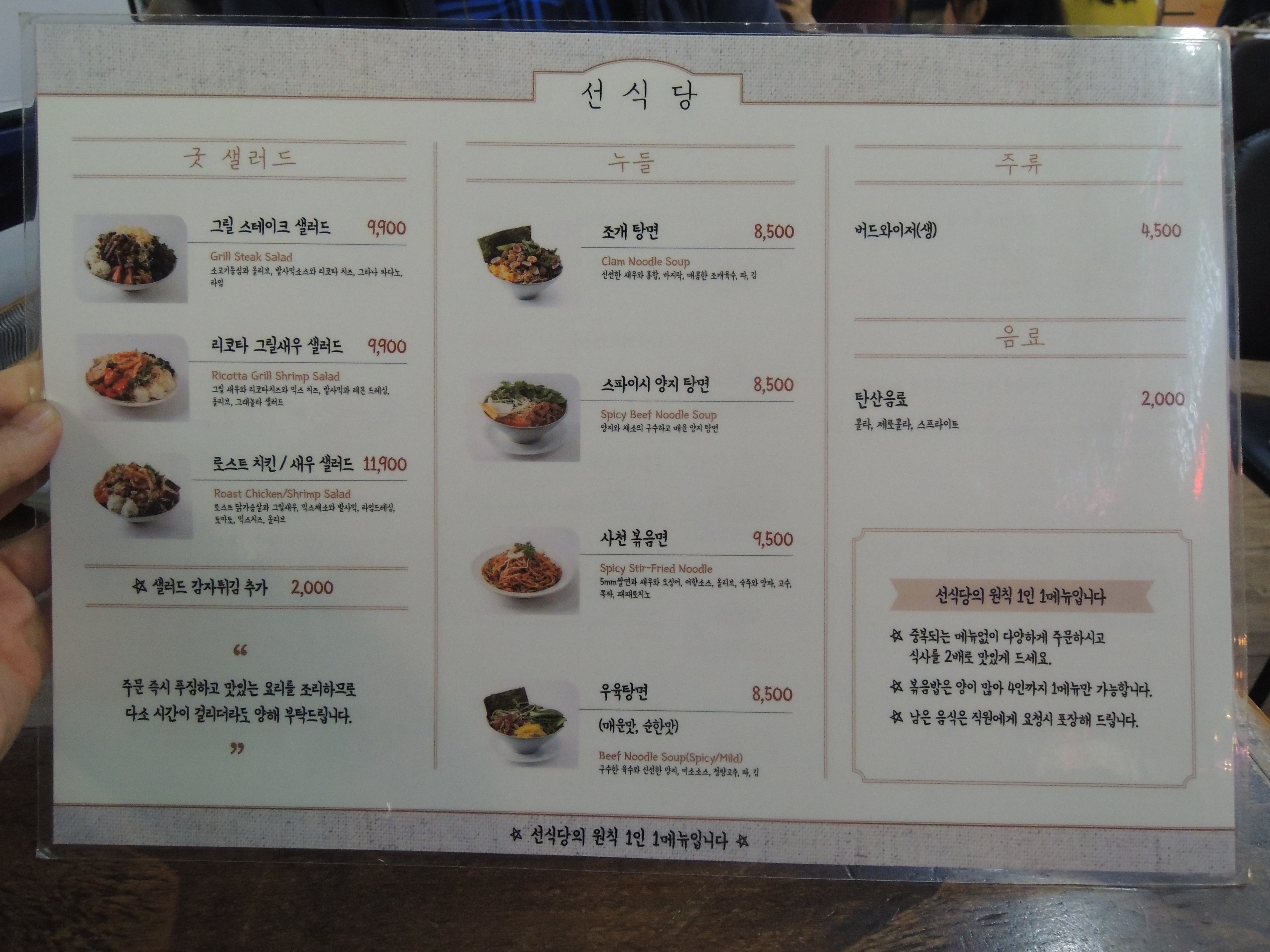 선식당 메뉴판이에요. 저는 잠발라야볶음밥, 스파이시양지팅먄. 꿔바로우, 그리고 제로코크 주문했어요.