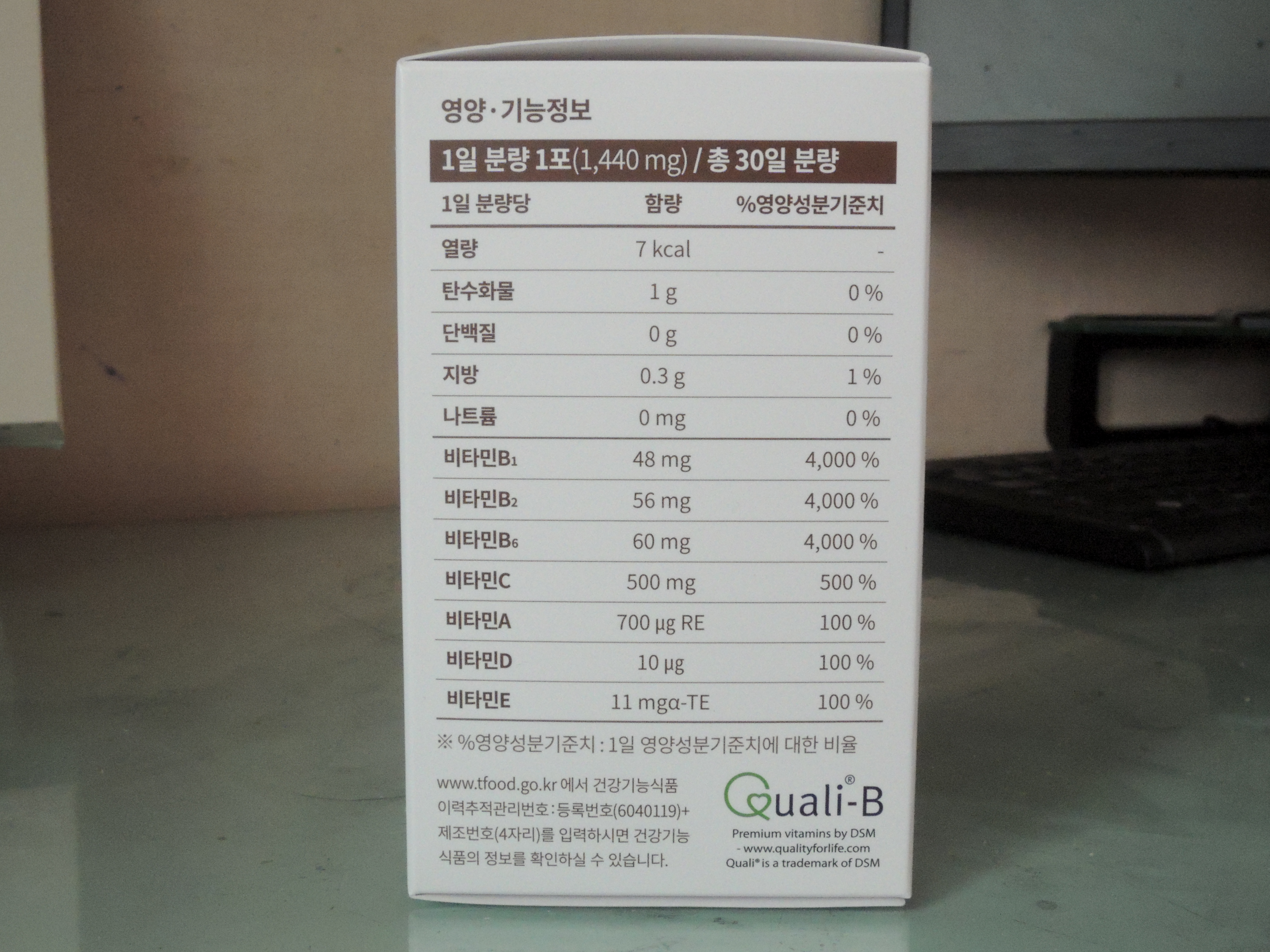 영양 기능정보입니다. 비타민 A,B,C,D,E가 골고루 들어있습니다. 비타민 B는 영양성분 기준 하루 권장량의 4,000%가 들어가네요.. 1일분량에... 대단합니다.