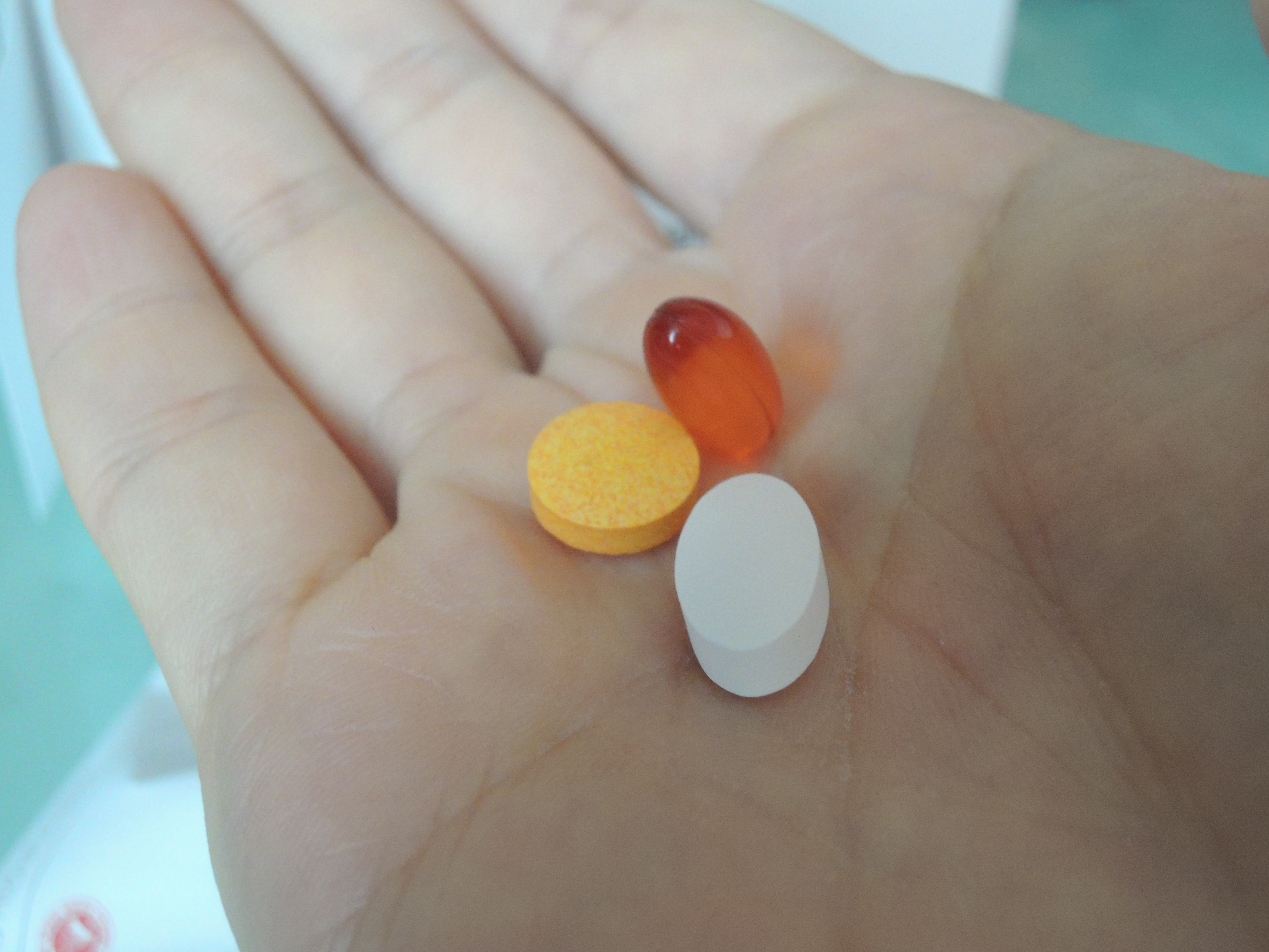 손으로도 잘 찢어지는 재질이고요. 안에는 아까 포장패키지에 그려져있던대로 비타민 알약이 3개 들어있어요. 색깔이 이쁩니다.