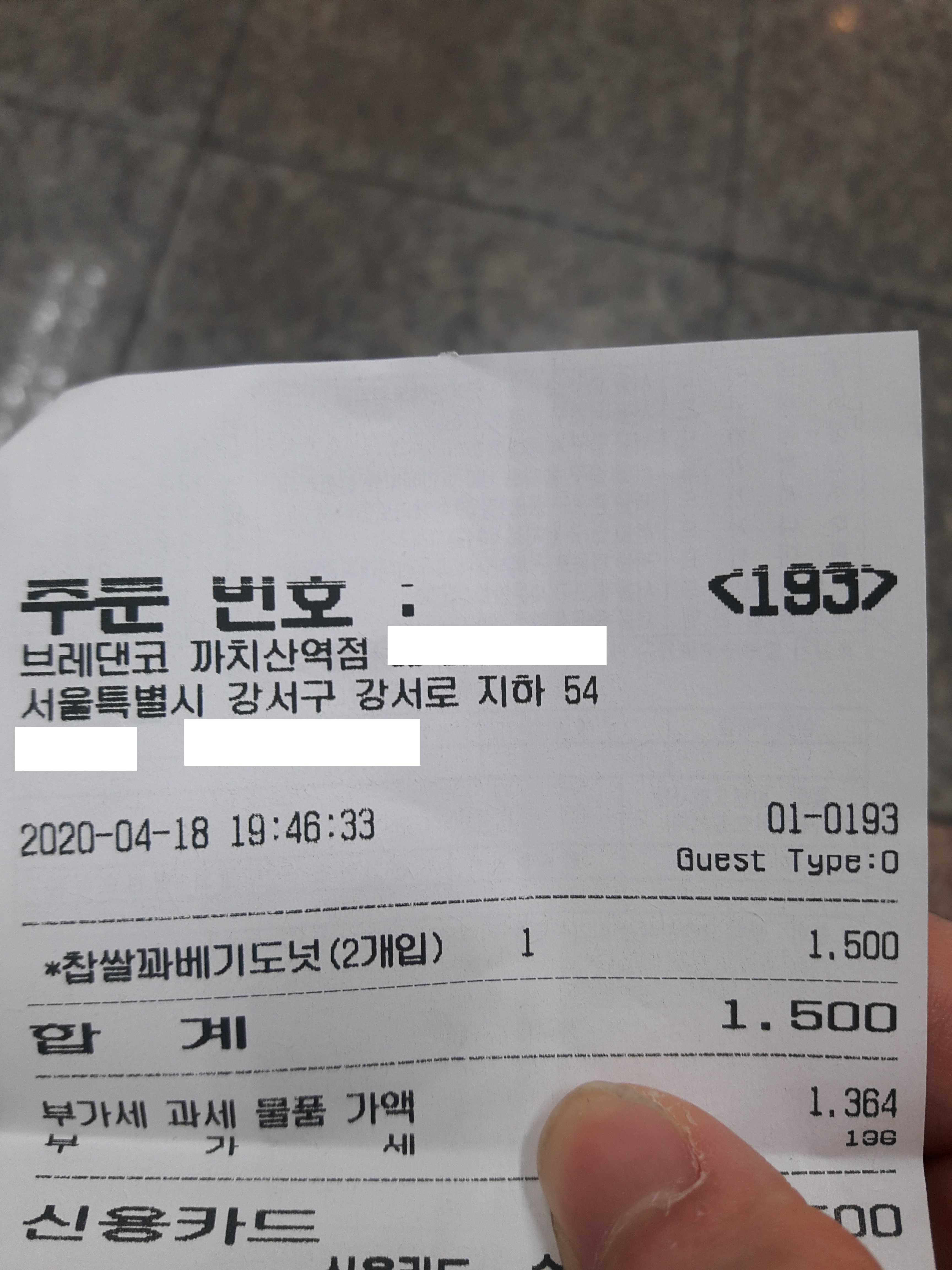 찹쌀과베기도넛 2개에 2020년 4월기준 1,500원에 구매했습니다.