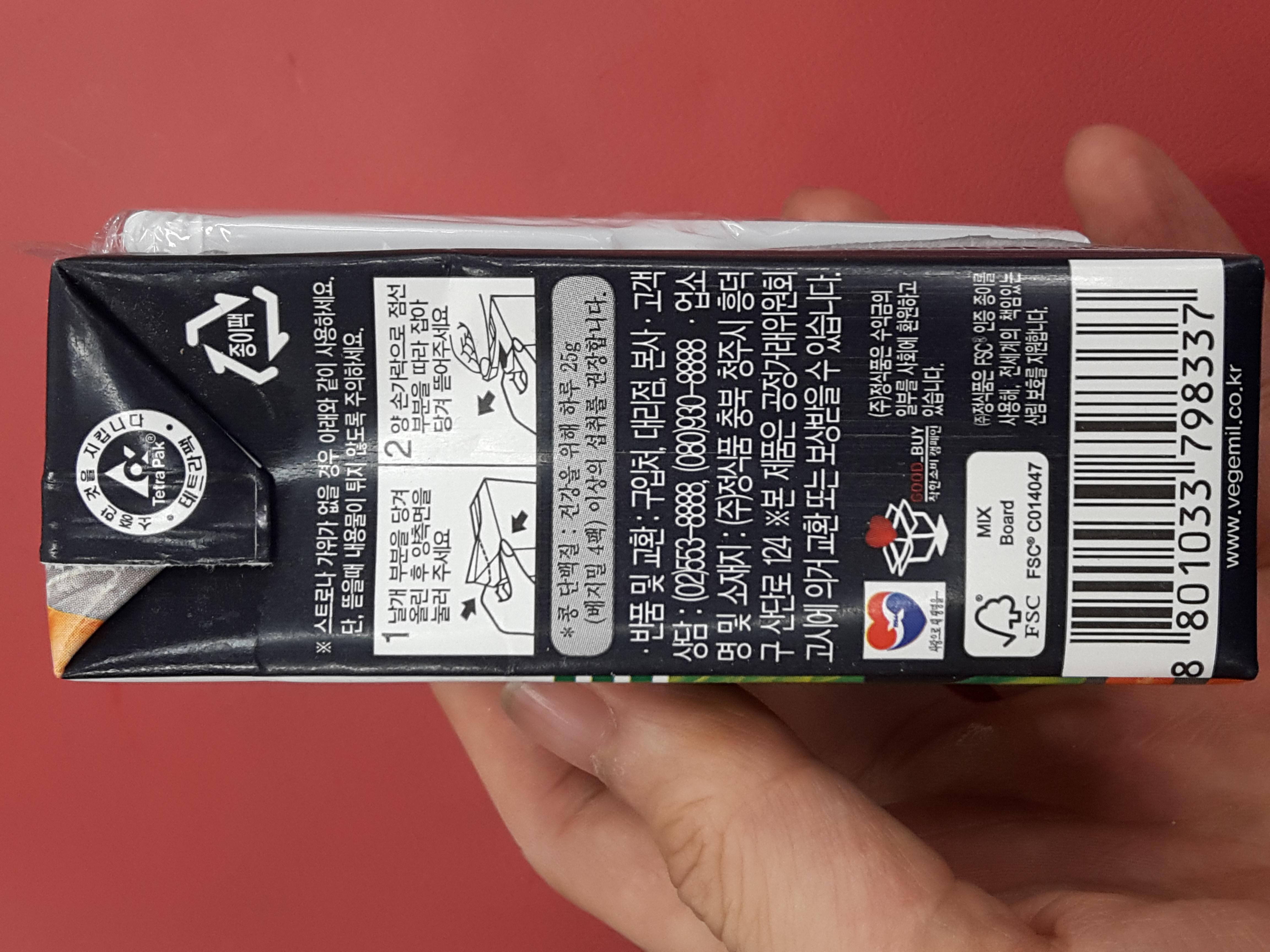 옆면입니다. 스트로우나 가위가 없을때도 위 그림처럼 종이팩을 펴서 먹을수 있습니다.