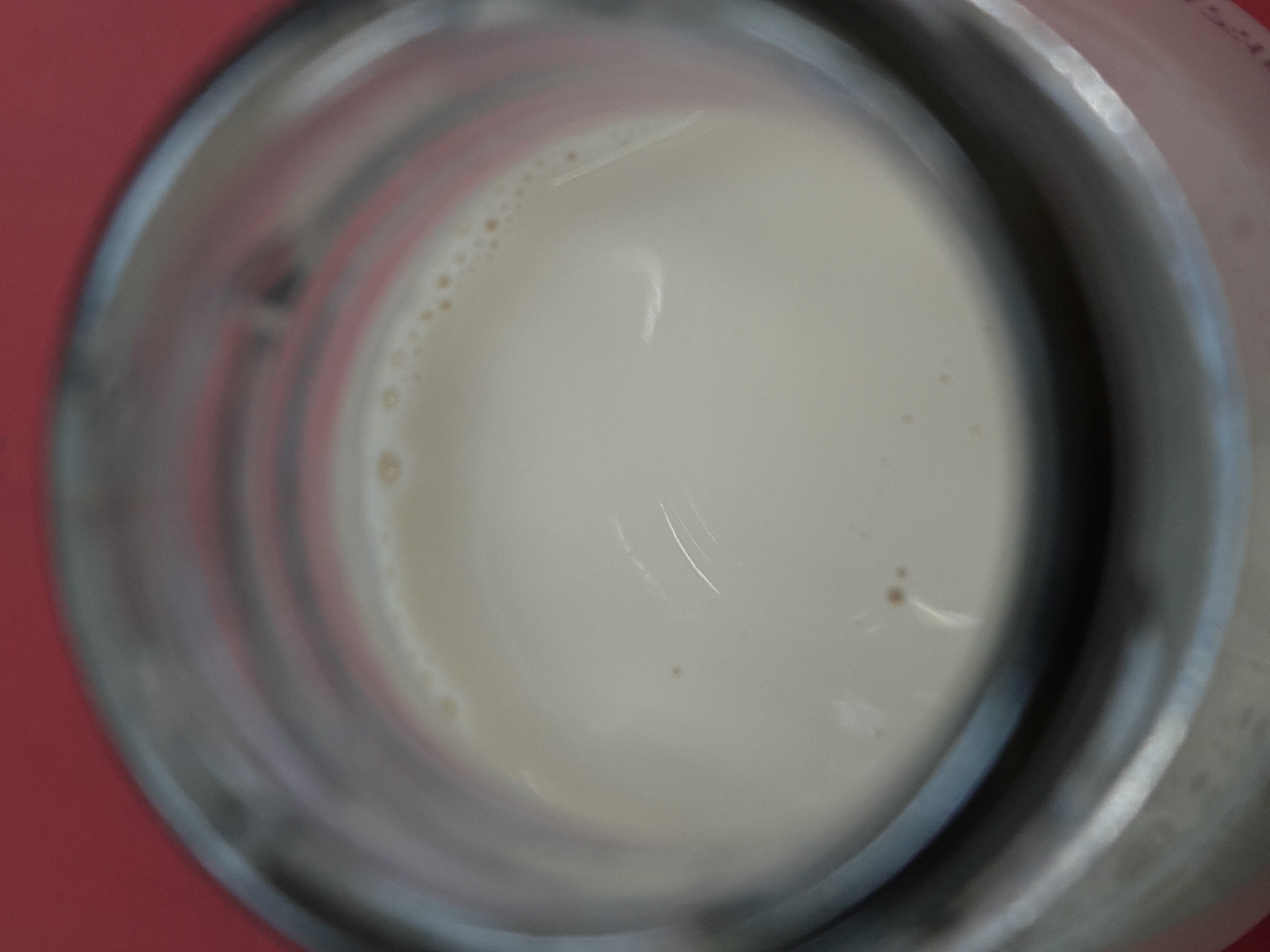 콩으로 만들었기에 일반 우유보다는 약간 노란빛의 두유에요.