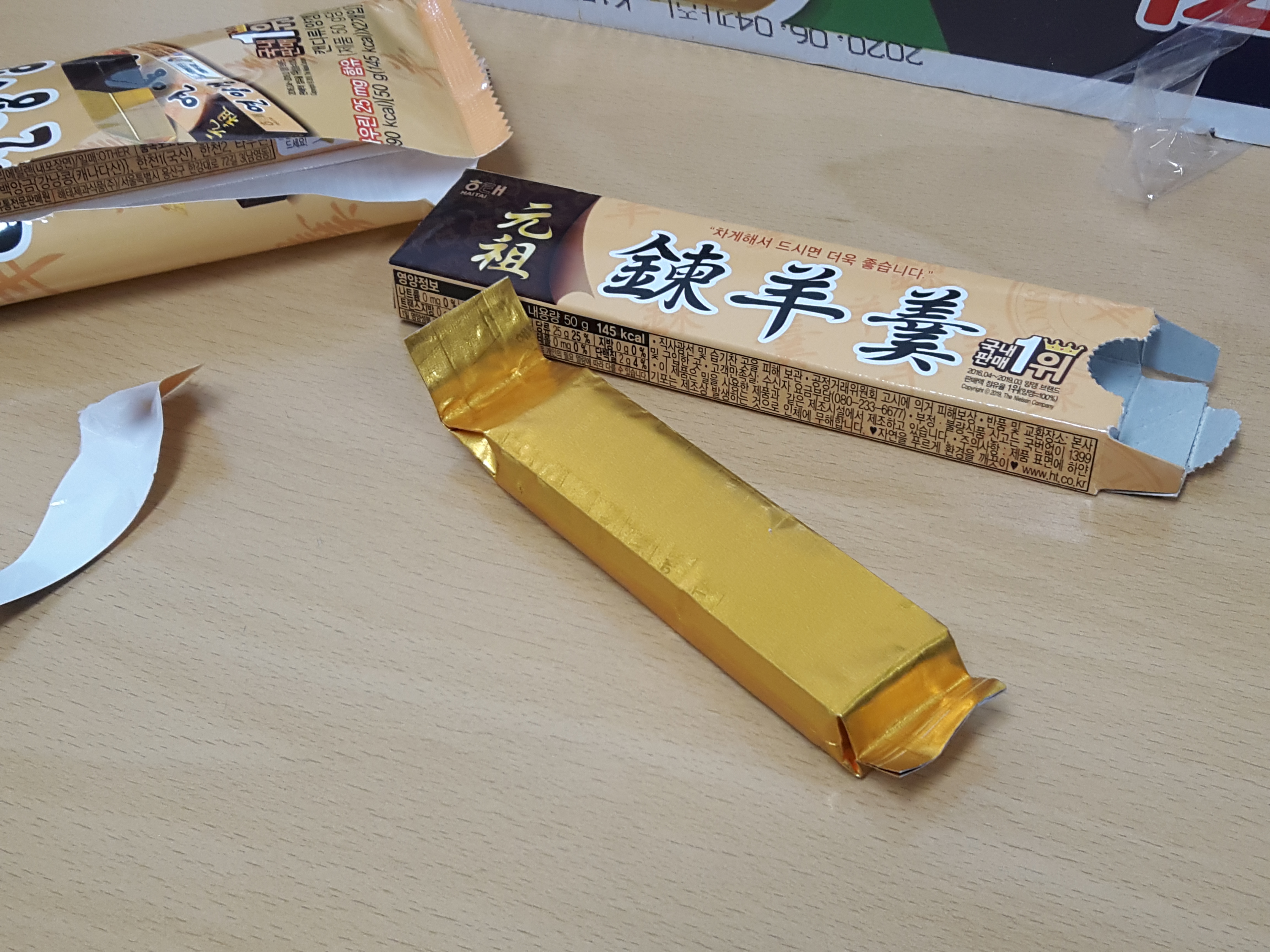 겉포장지를 열면 이렇게 안에 종이포장지로 된 연양갱이 나옵니다.
