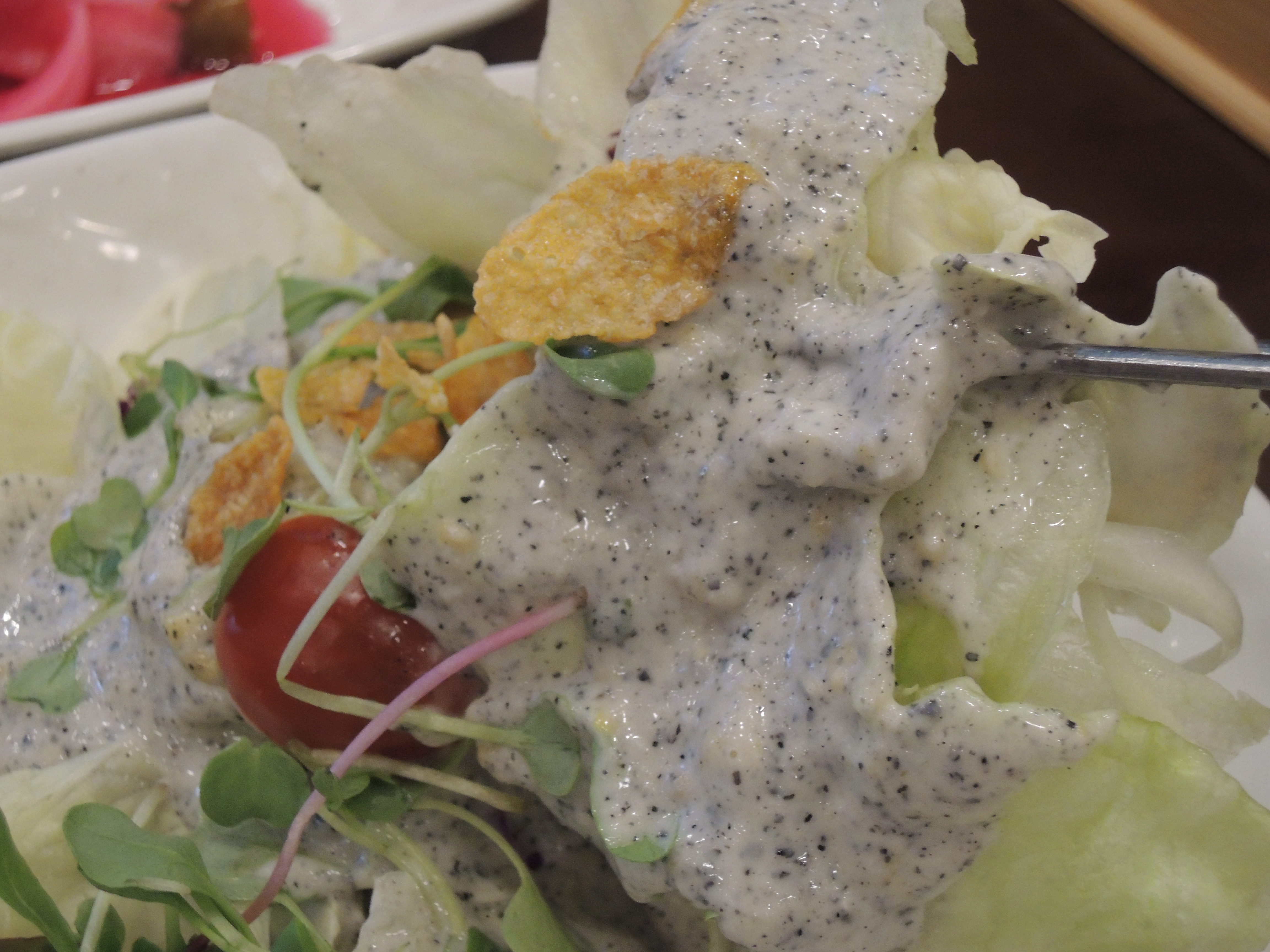 제가 좋아하는 들깨소스가 뿌려진 샐러드에요. 양상추, 방울토마토, 새싹채소를 줄길 수 있어요.