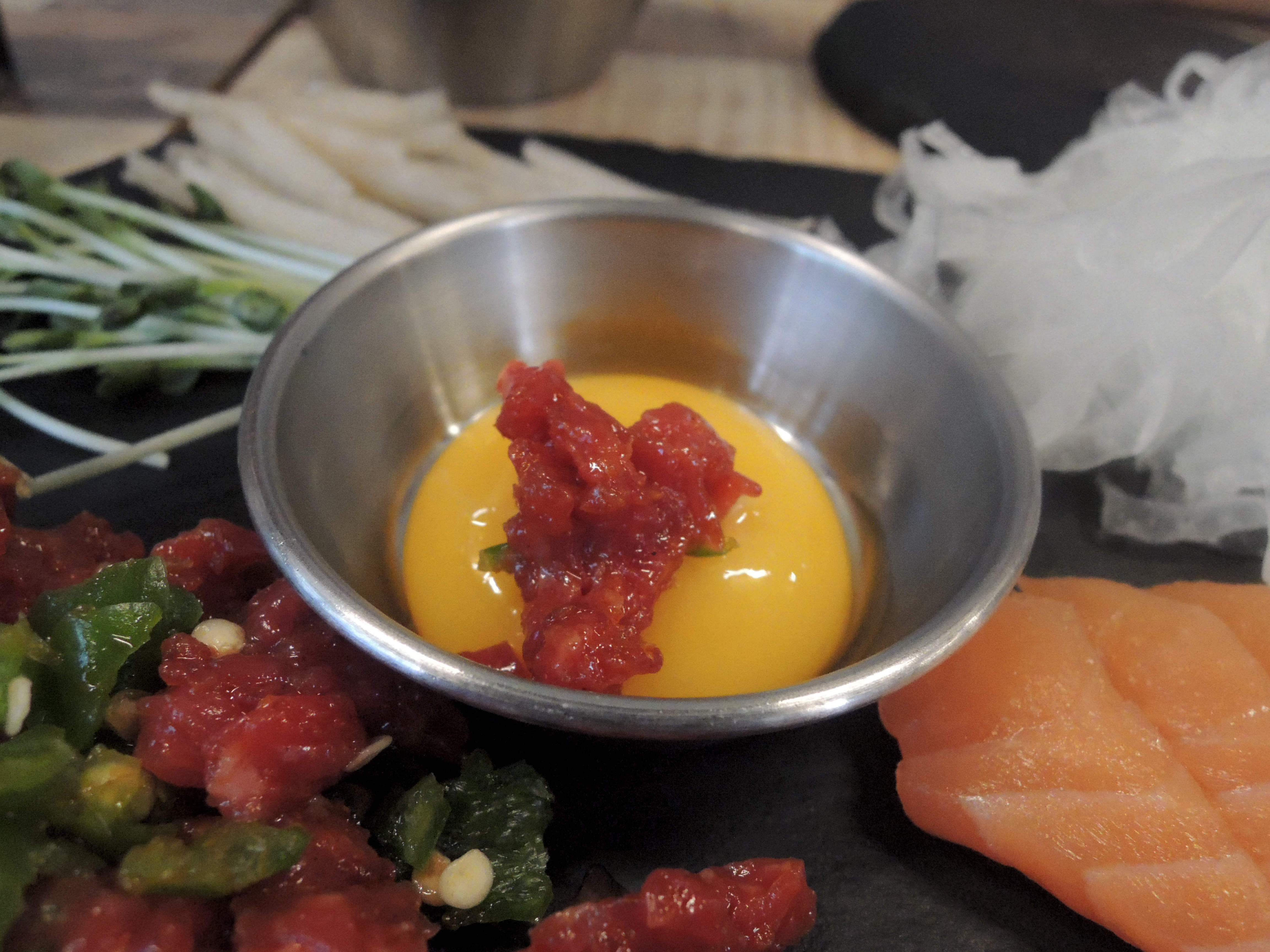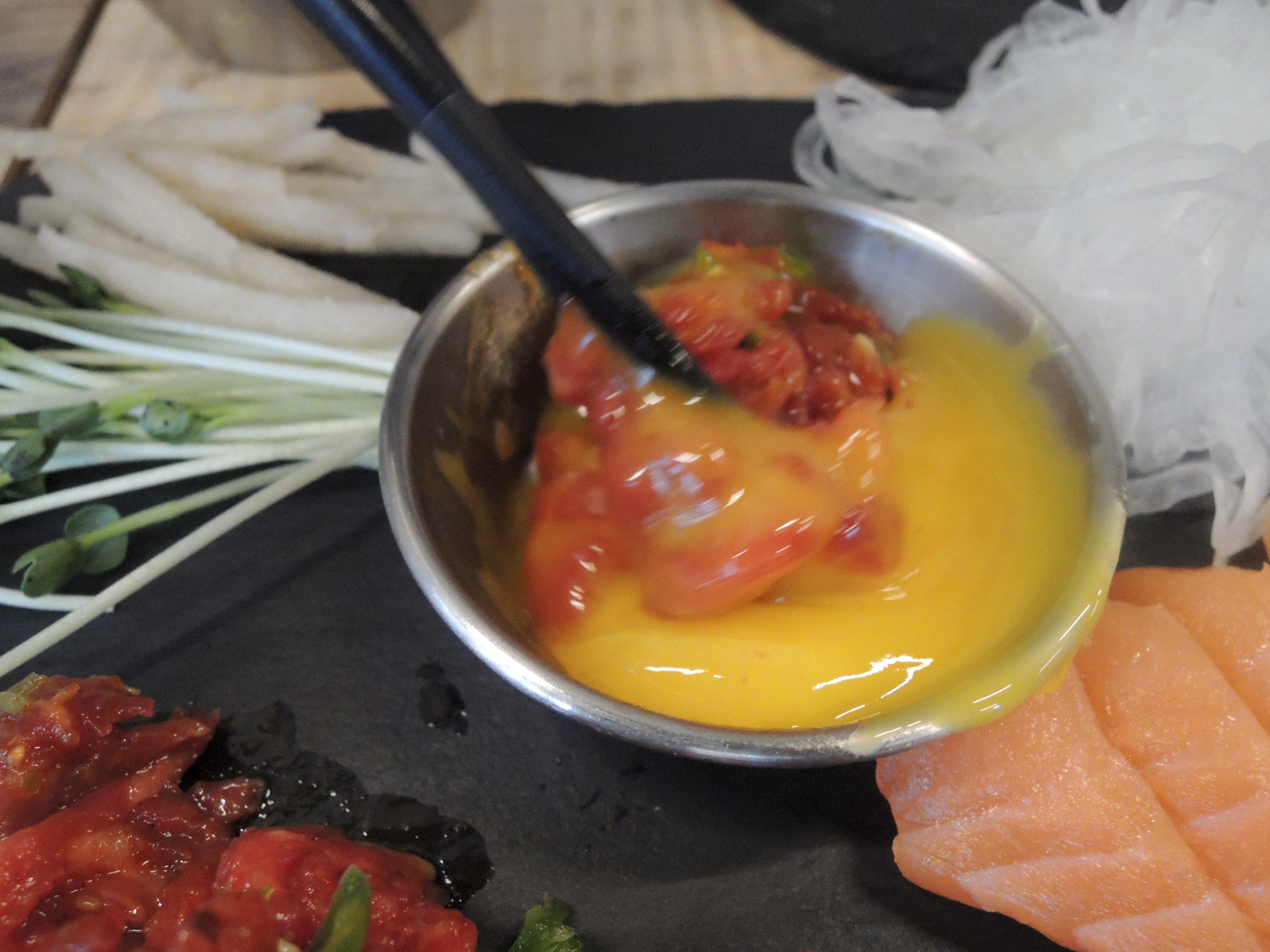 육회먹은 연어는 소스가 5종류가 나와요. 간장, 초장, 갈릭, 들깨 등 육회와 연어를 다양한 소스에 찍어 먹을 수 있는 재미가 있어요.