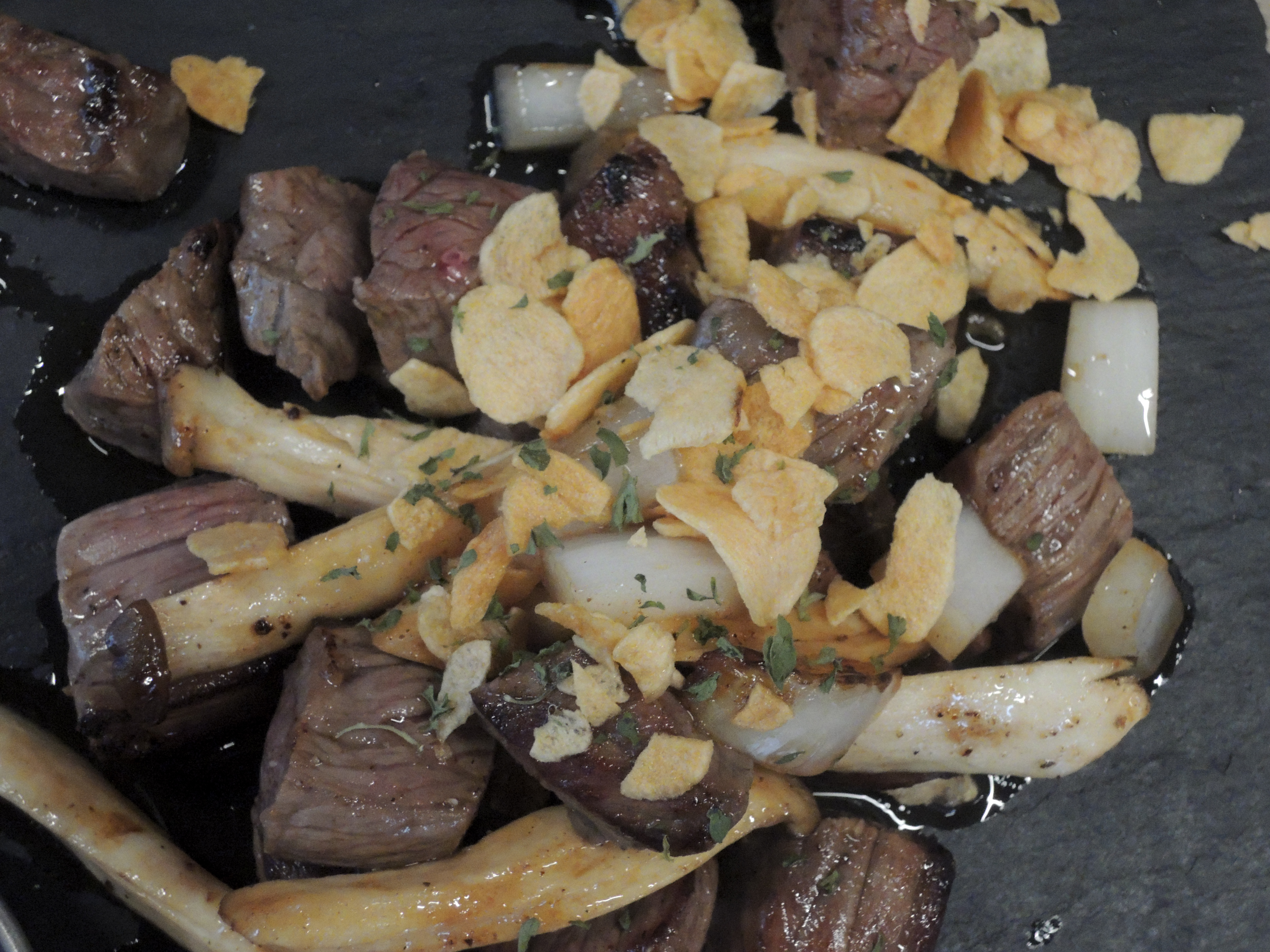 스테이크위에 구운마늘이 송송 뿌려져 있어요. ㅎㅎ 고기는 미디움웰던정도의 굽기로 구워져서 나옵니다.