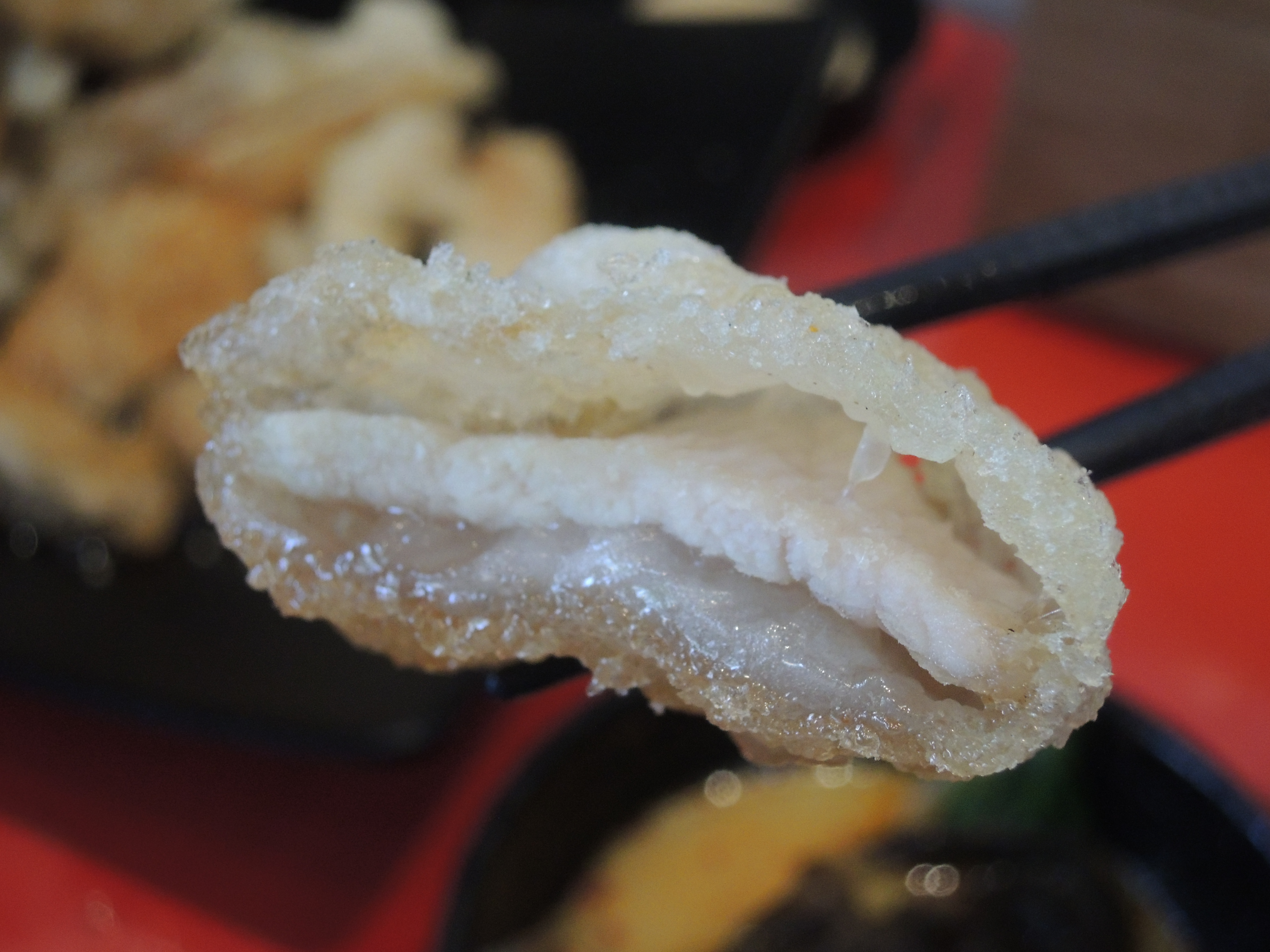 단면을 보시면 튀김옷과 고기 사이에 약간 찹쌀같은 색깔이 보이시죠. 저 부분이 찹쌀처럼 쫄깃합니다. 겉은 바삭, 찹쌀부분은 쫄깃, 그리고 고기의 부드러움을 한입에 느낄 수 있습니다. ㅎㅎ
