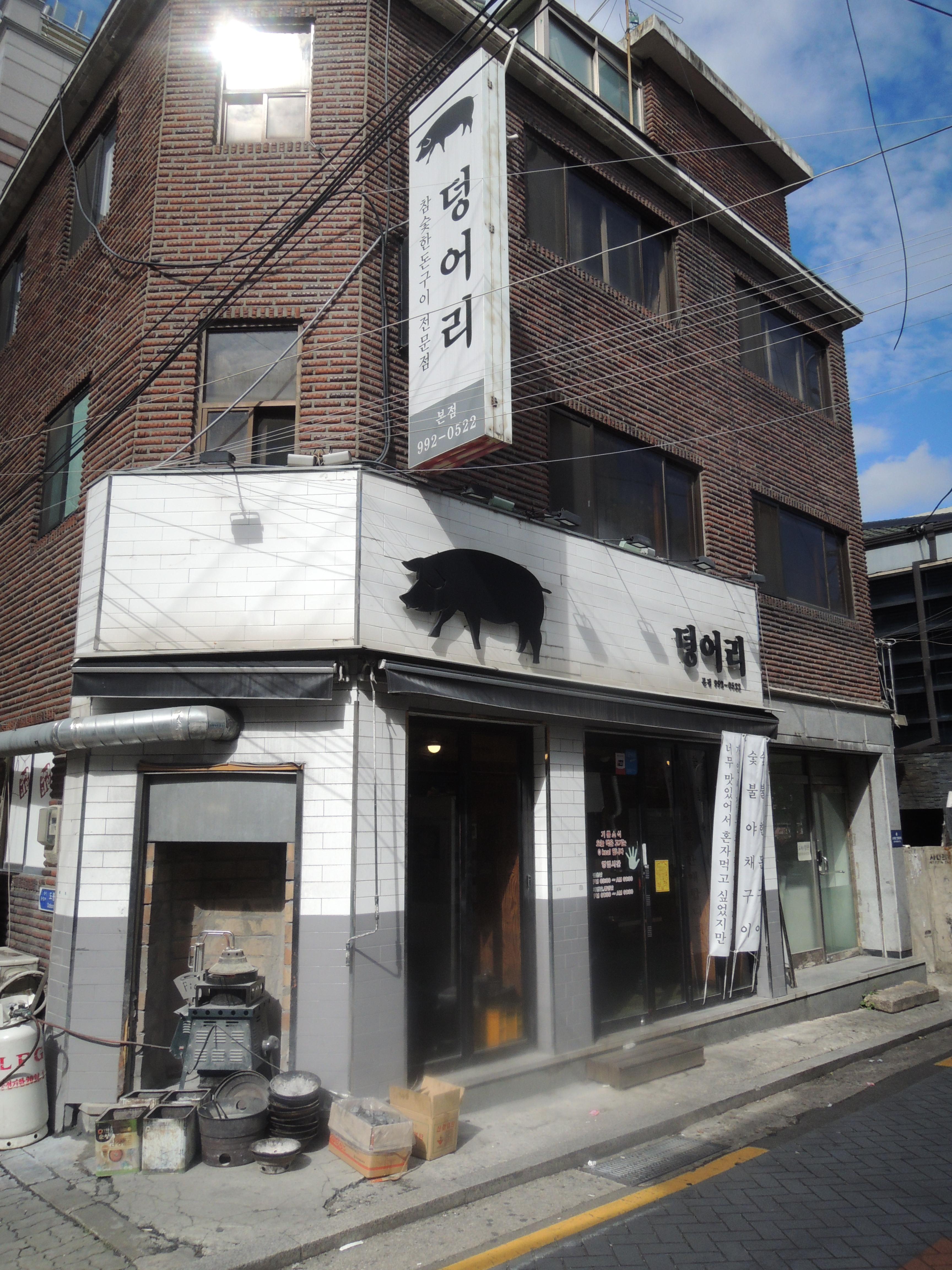 덩어리 입구에요. 젊은 사장님 두분이서 운영하세요. 밖에 숯불담는 통이 보이네요.