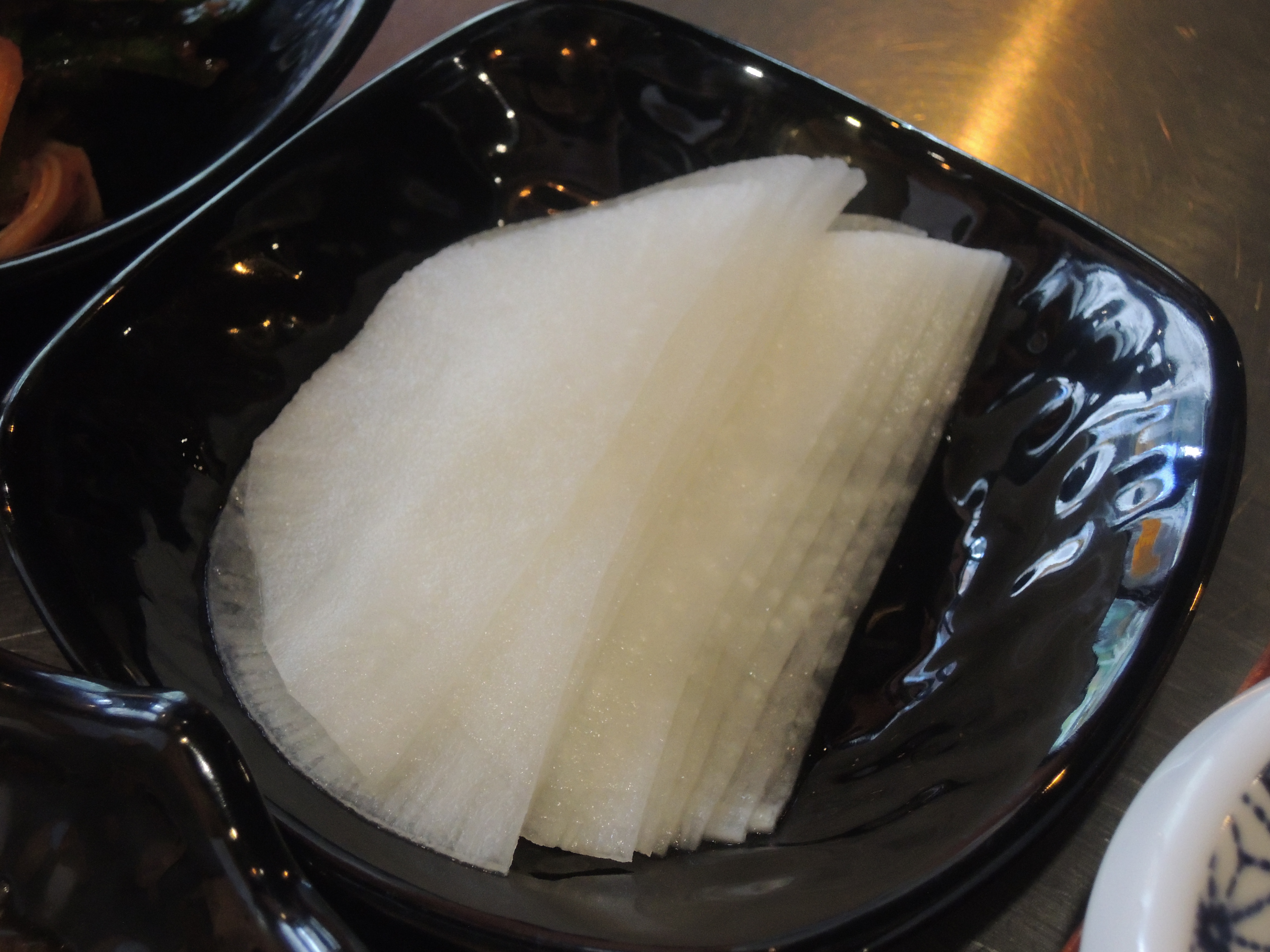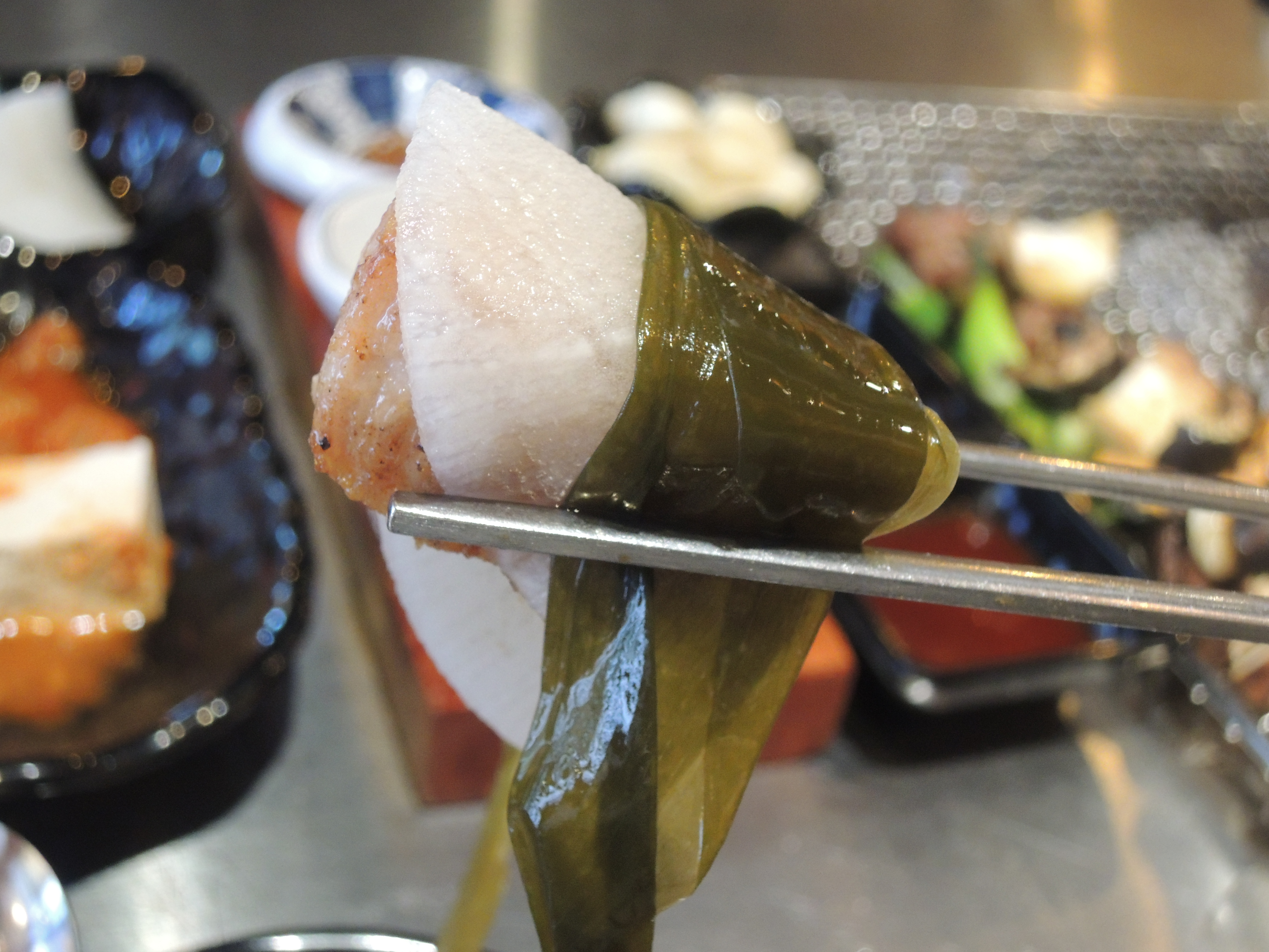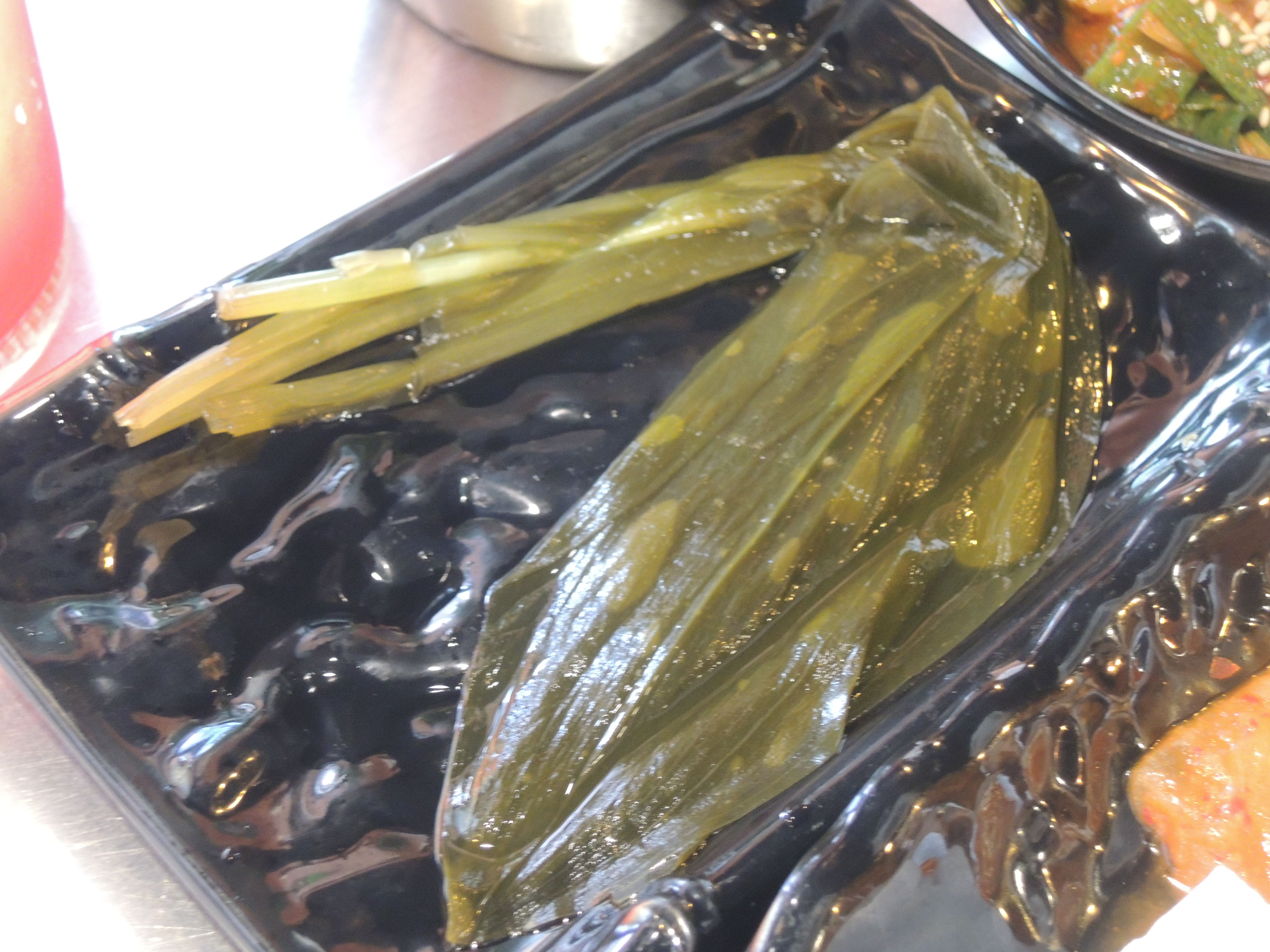 쌈무와 명이나물입니다. 새콤해서 고기를 싸면 와사비와 잘 어울립니다.