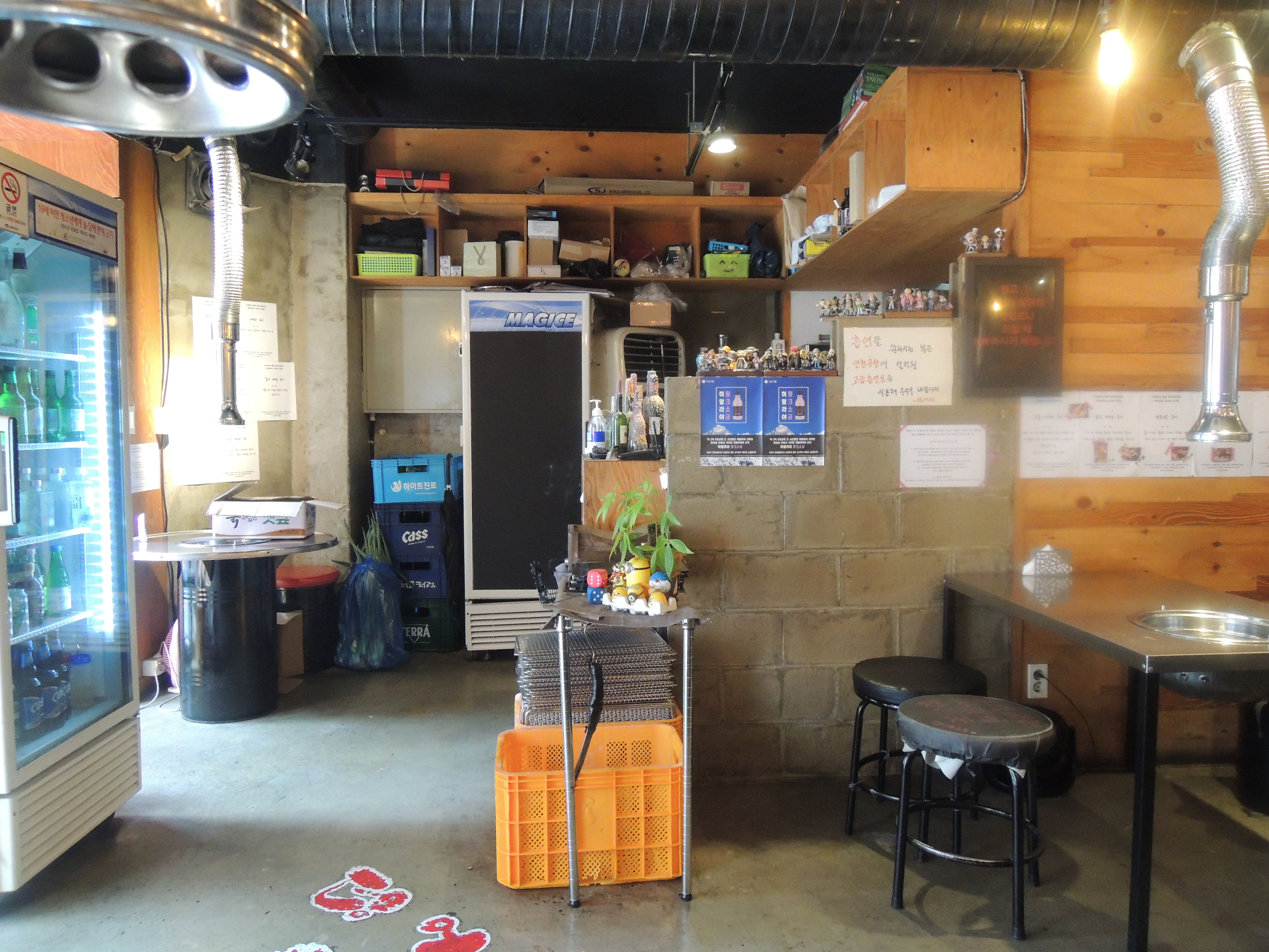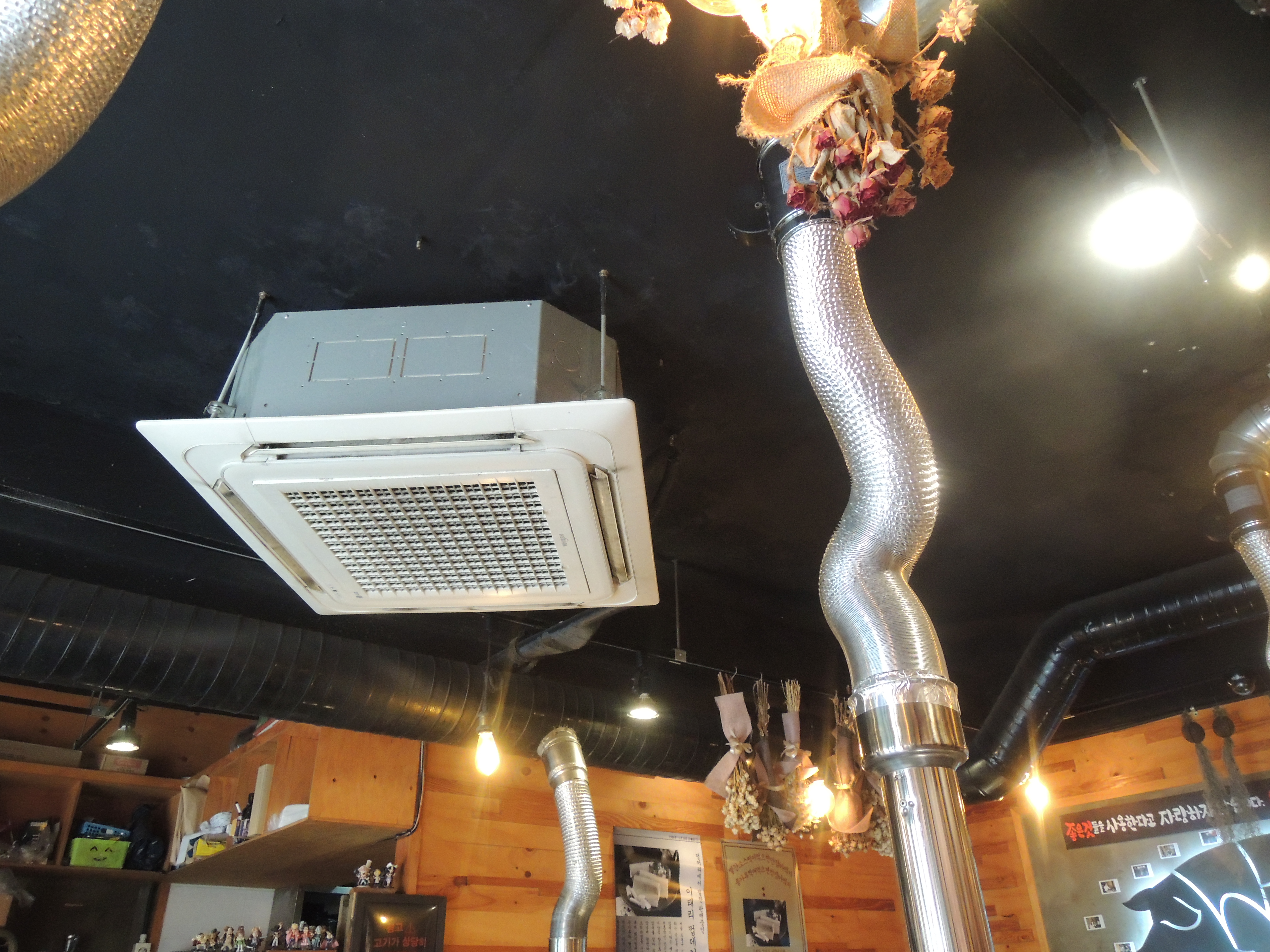 천정형 에어컨이 설치되어 있고 고기구울때 연기가 잘 빠져나가기위한 배연설비도 잘 되어 있습니다.
