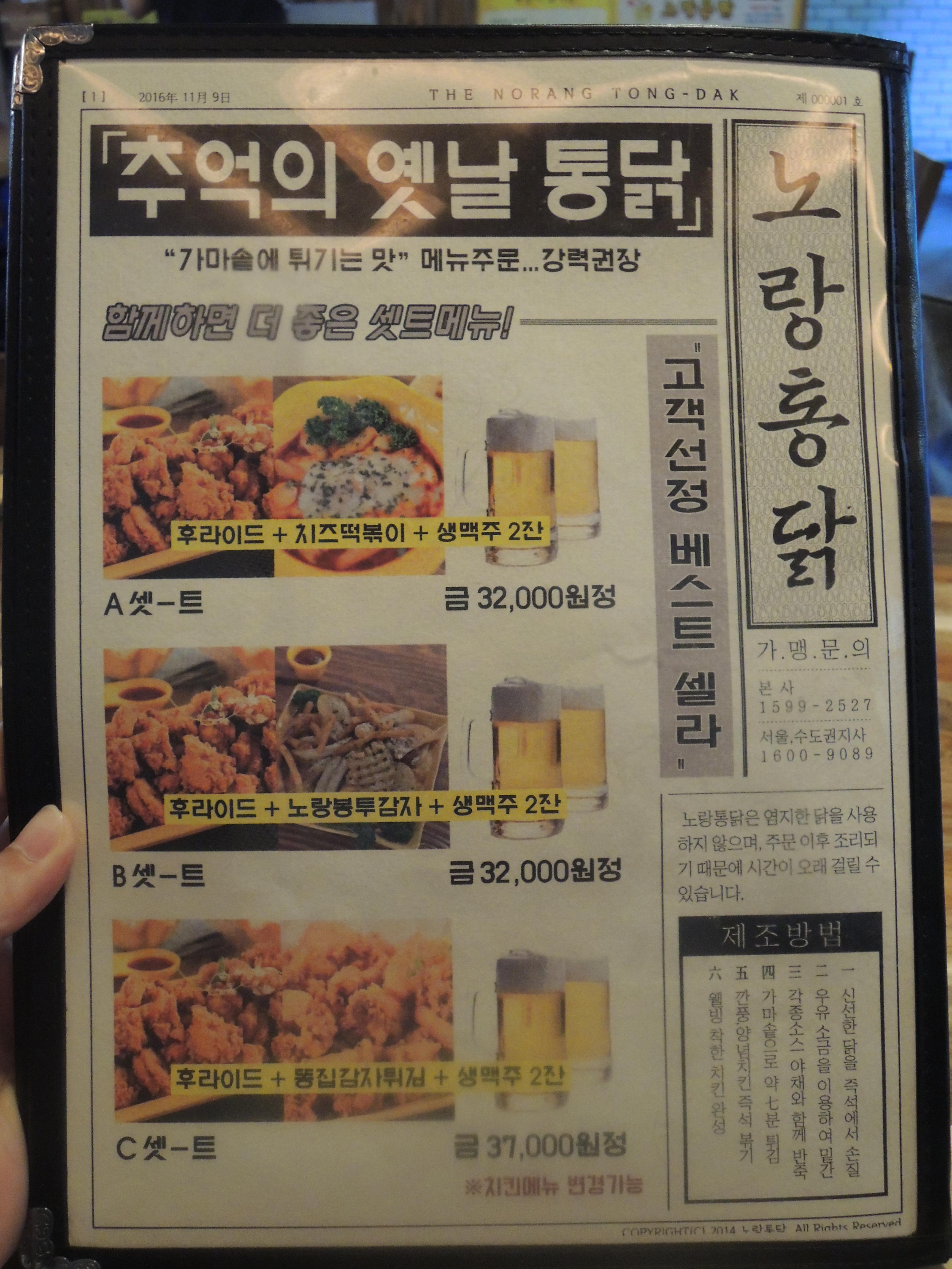 노랑통닭의 메뉴판입니다. 세트메뉴, 베스트메뉴부터 시작해서 다양한 사이드메뉴까지 선보이고 있습니다.