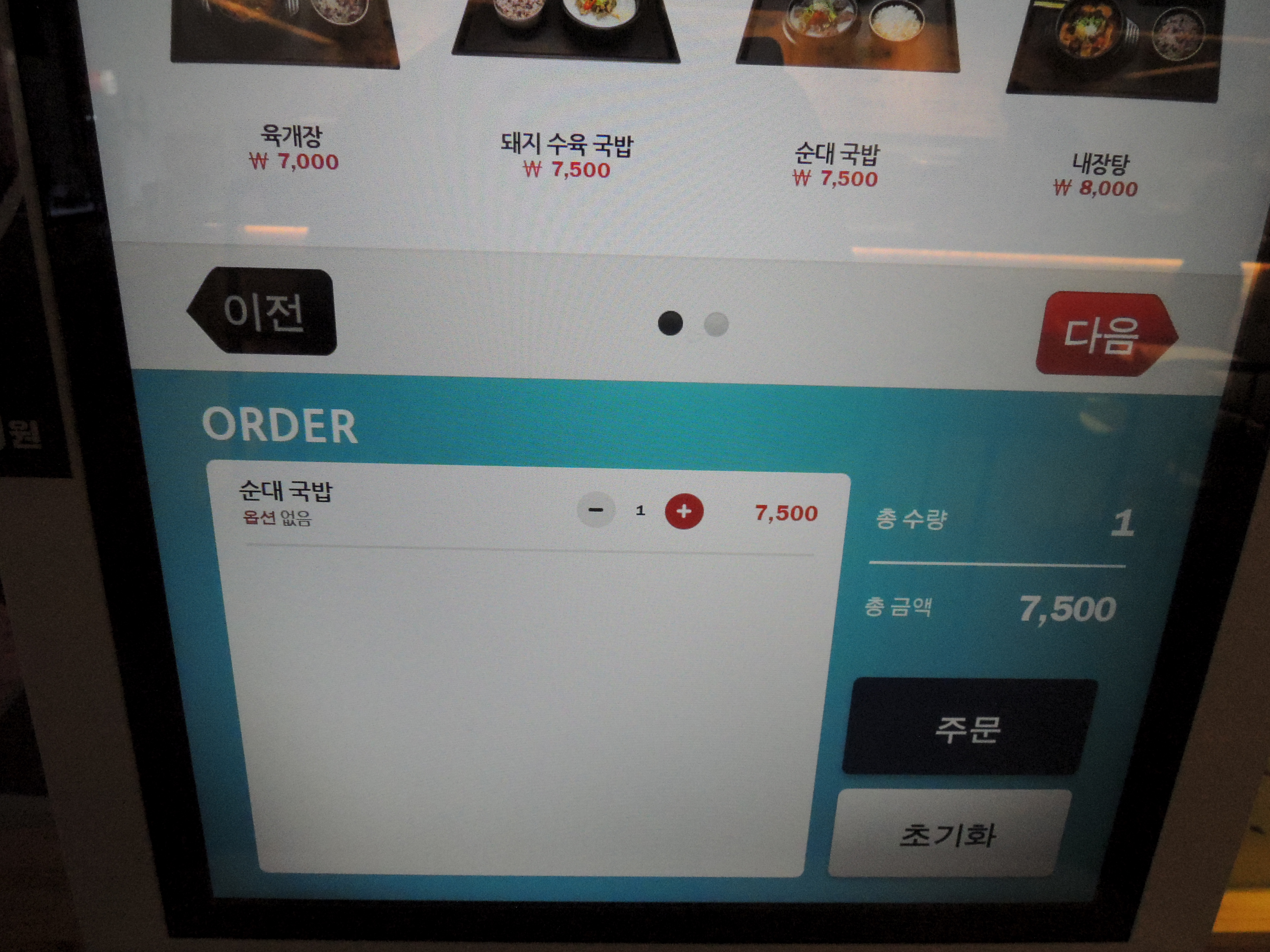 순대국밥을 매장식사로 주문했어요.