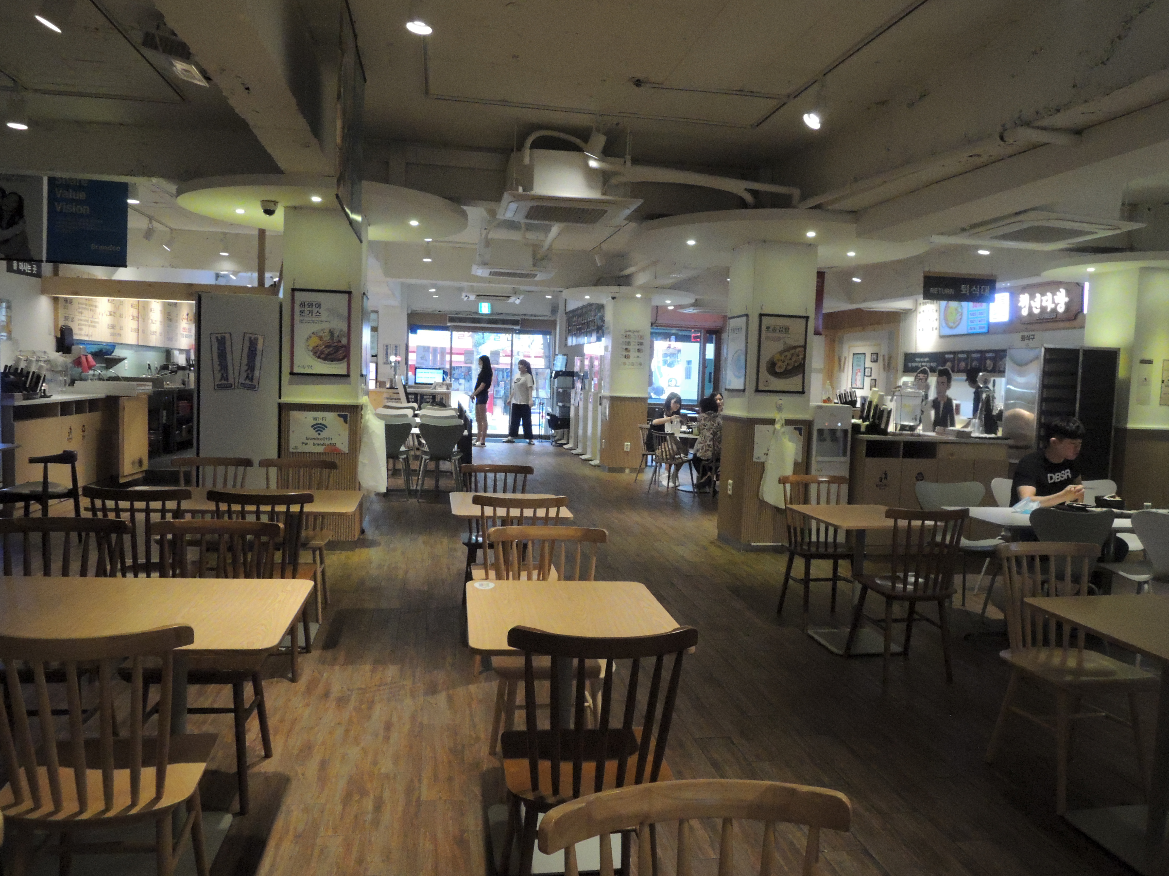 매장은 여러 맛집이 모여있고, 가운데에 좌석이 배치되어 있어요. 여러 매장이 입점해 있어서 식사공간이 탁트이고 넓은게 특징이에요.